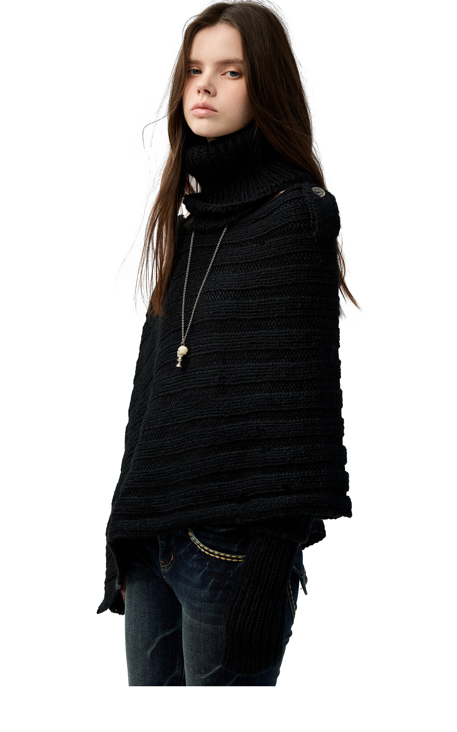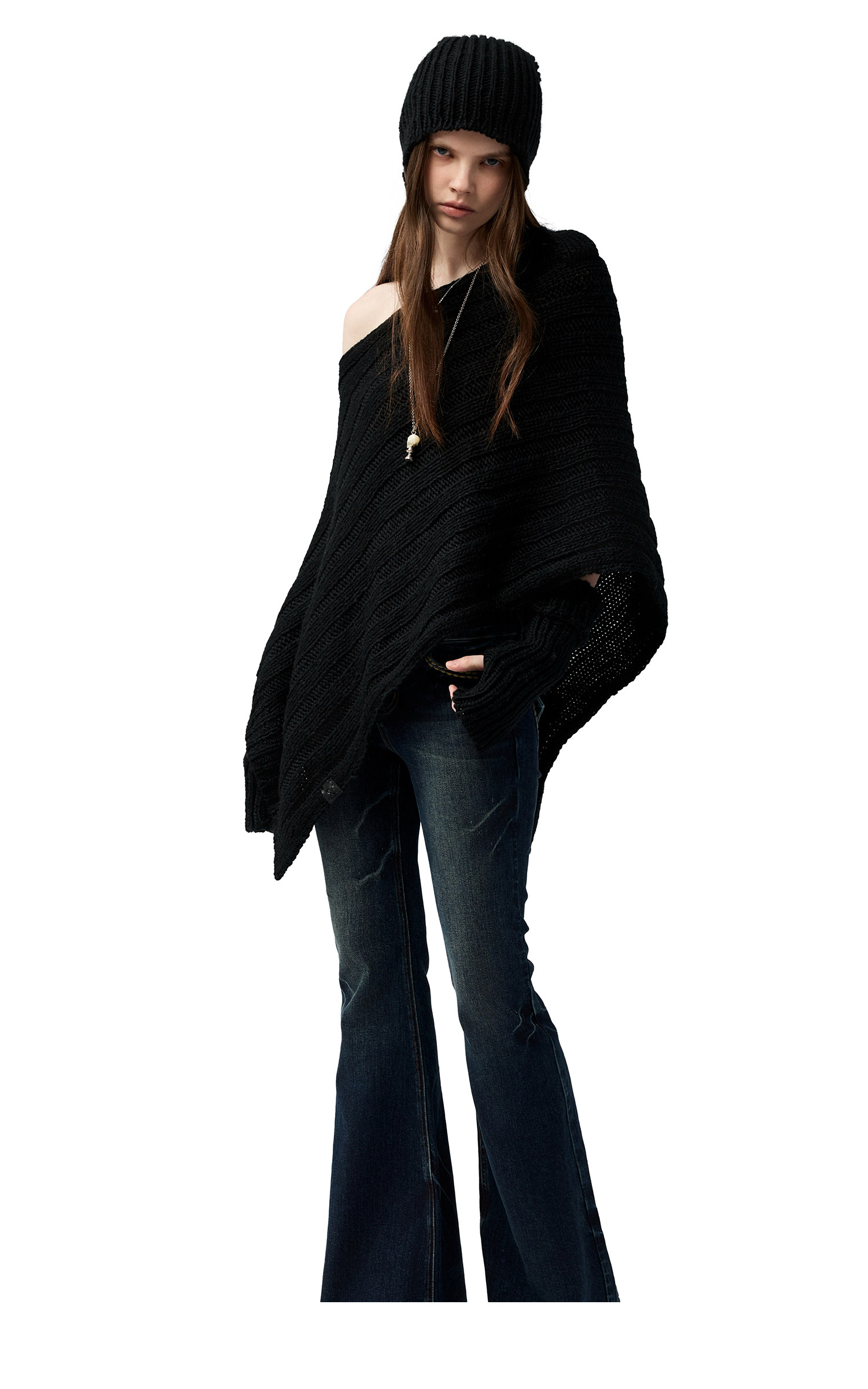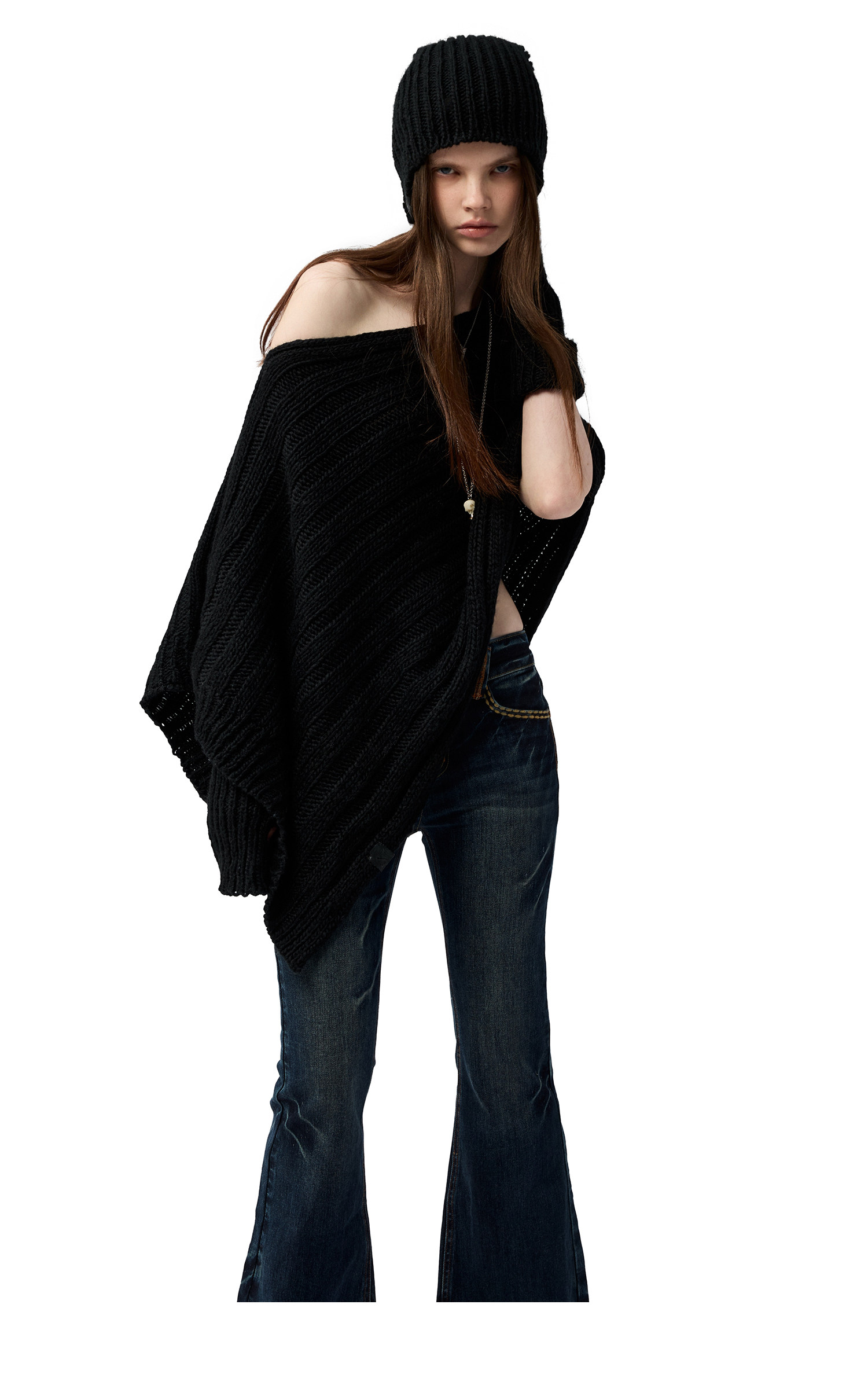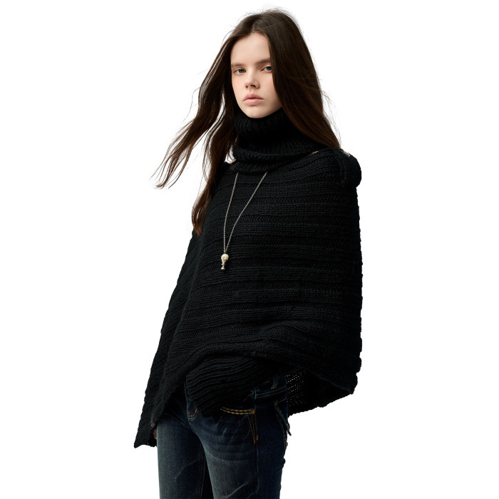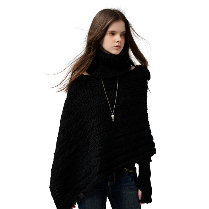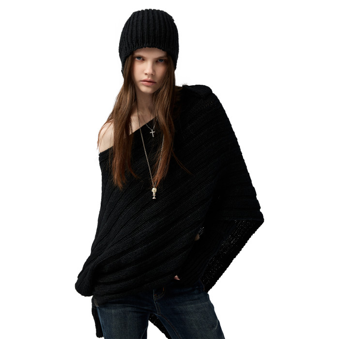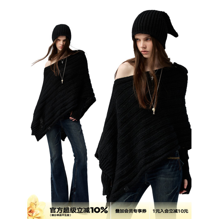 4muggle“剛柔物語”黑色棒針針織鬭篷不規則純欲毛衣露肩上衣女