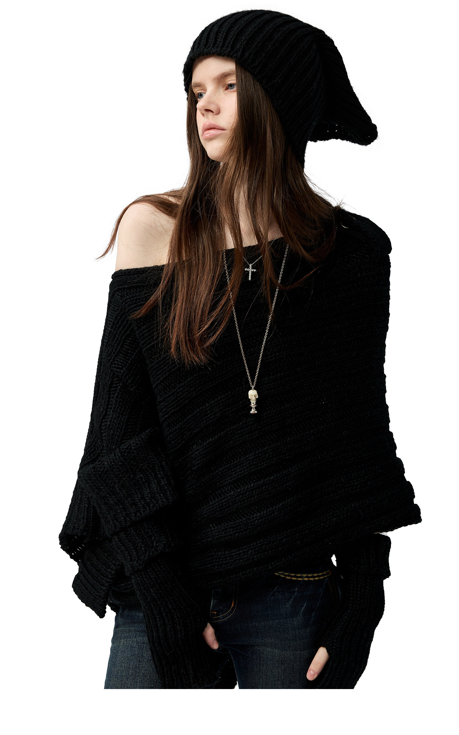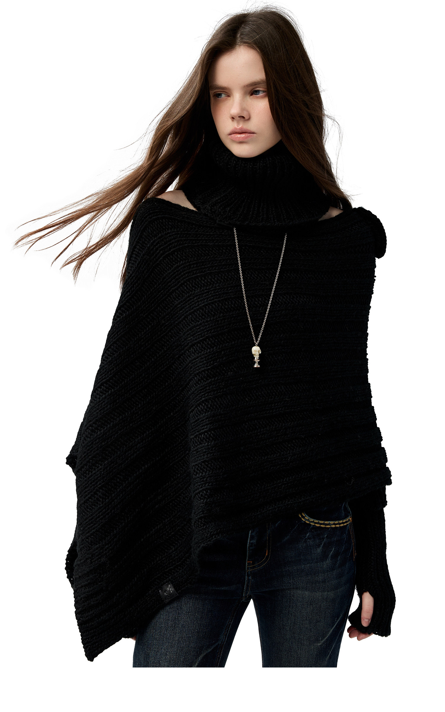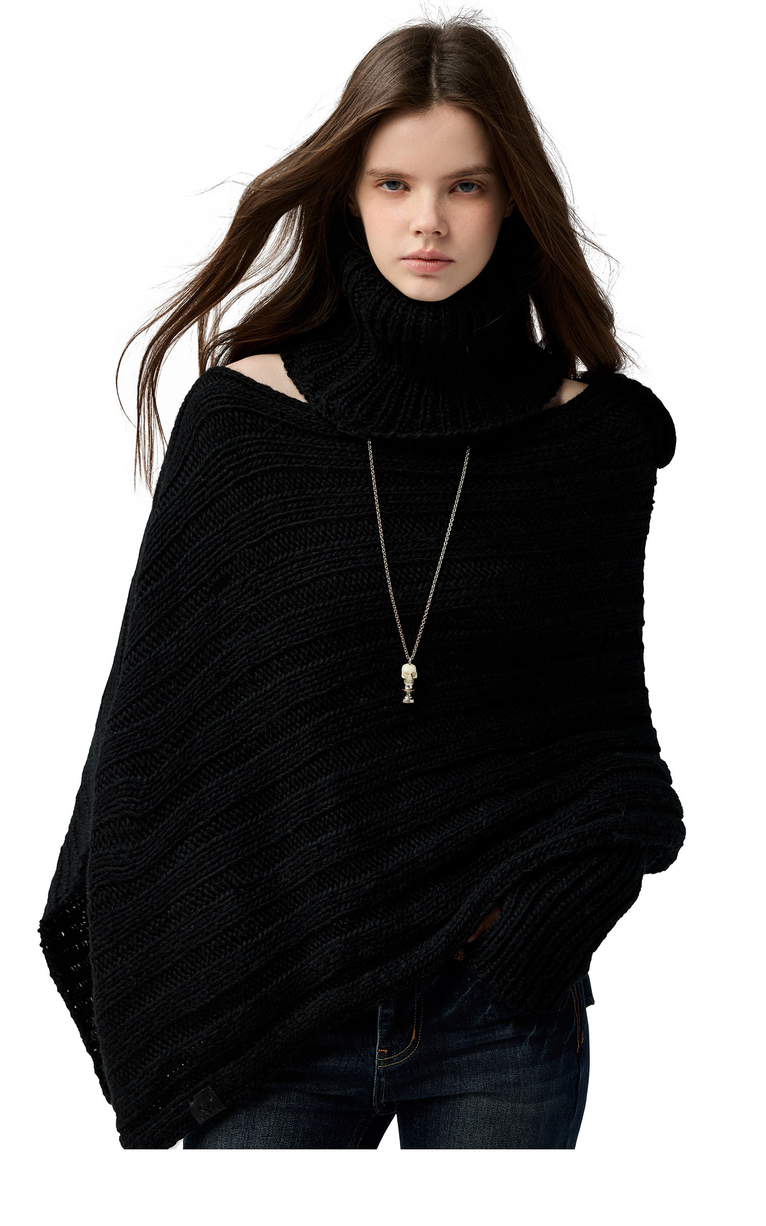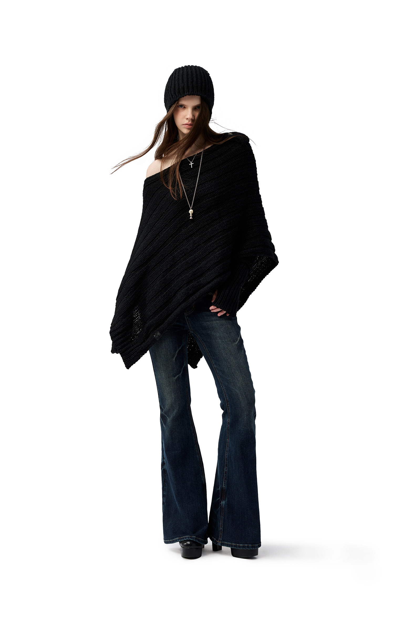 4muggle“剛柔物語”黑色棒針針織鬭篷不規則純欲毛衣露肩上衣女