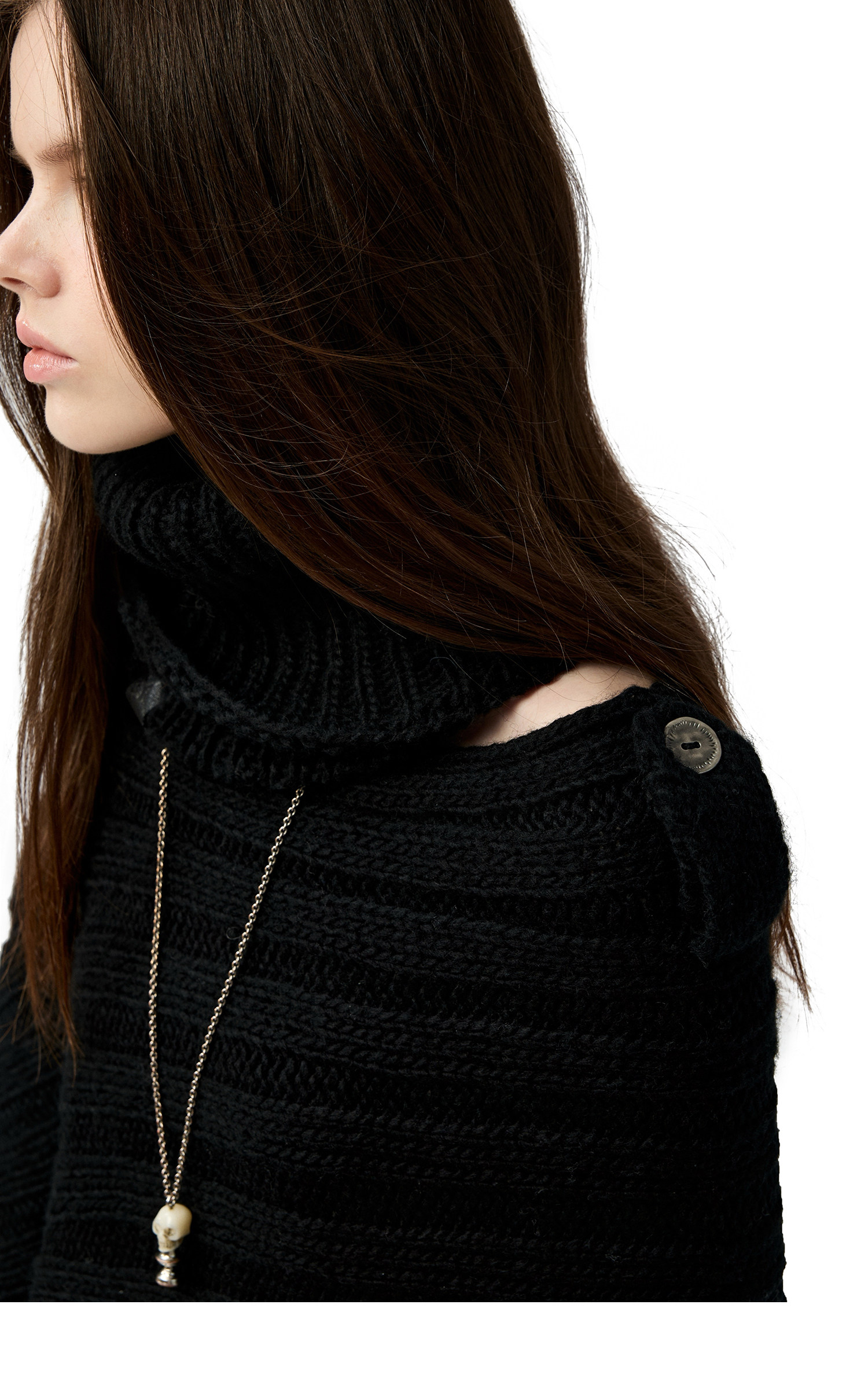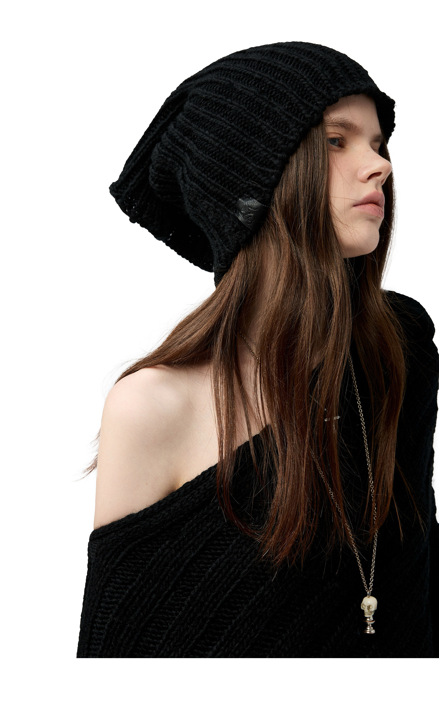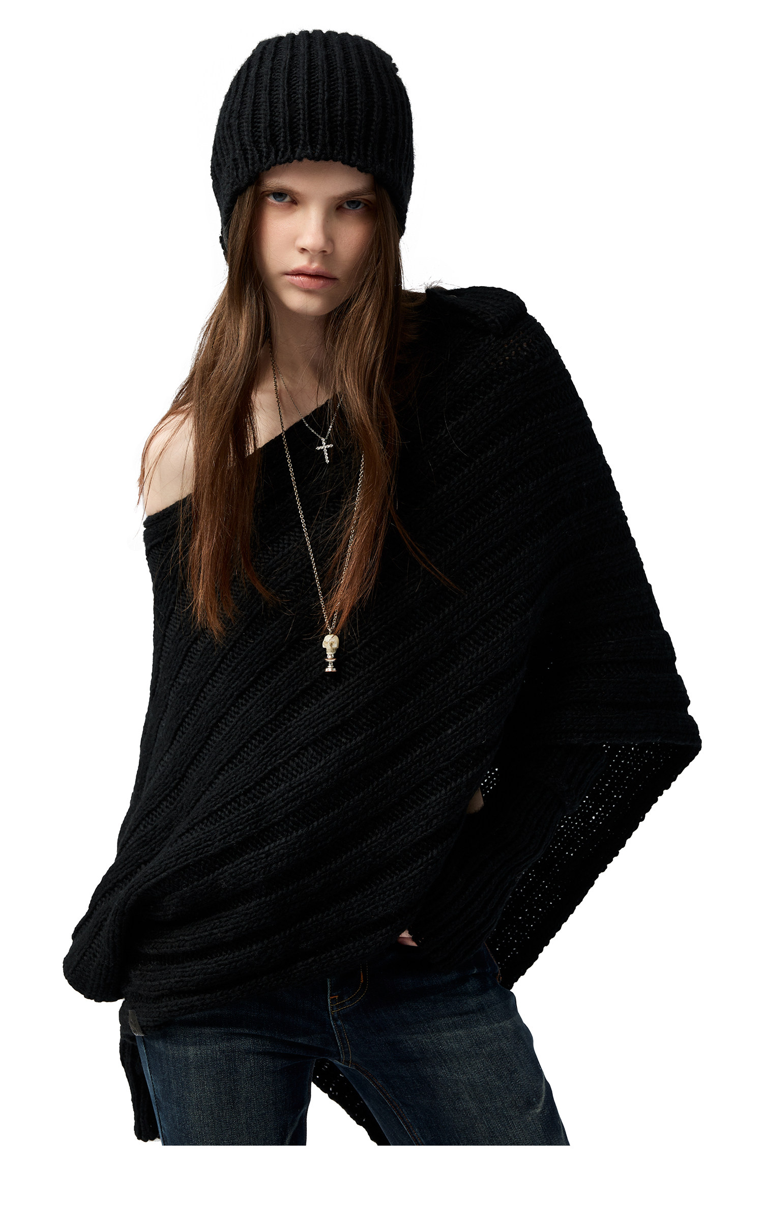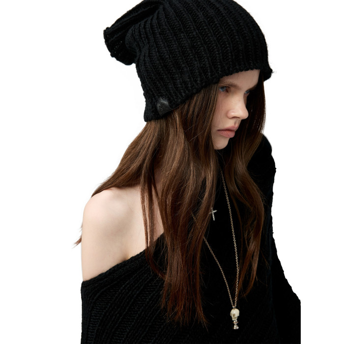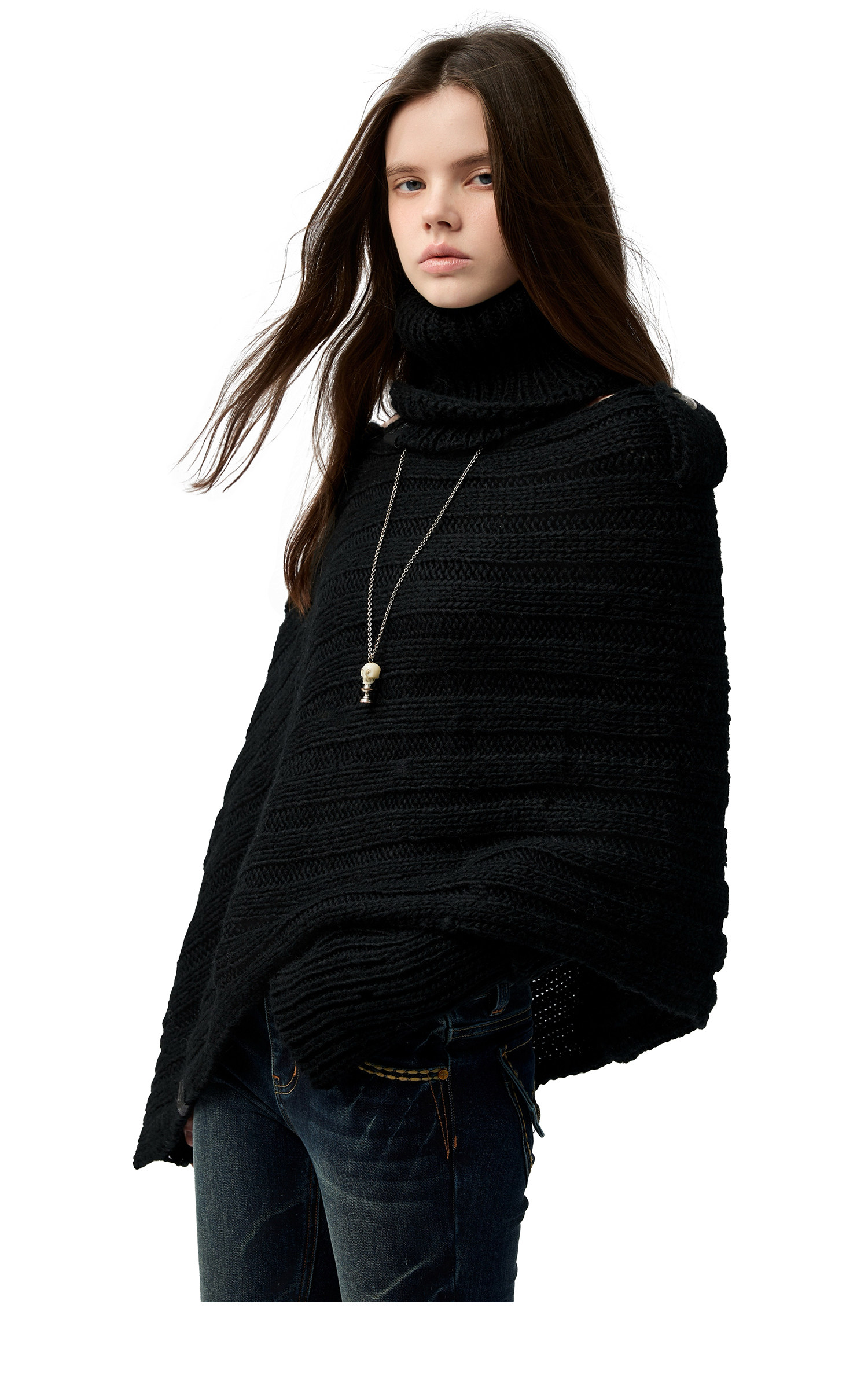4muggle“剛柔物語”黑色棒針針織鬭篷不規則純欲毛衣露肩上衣女