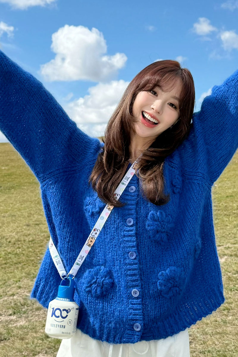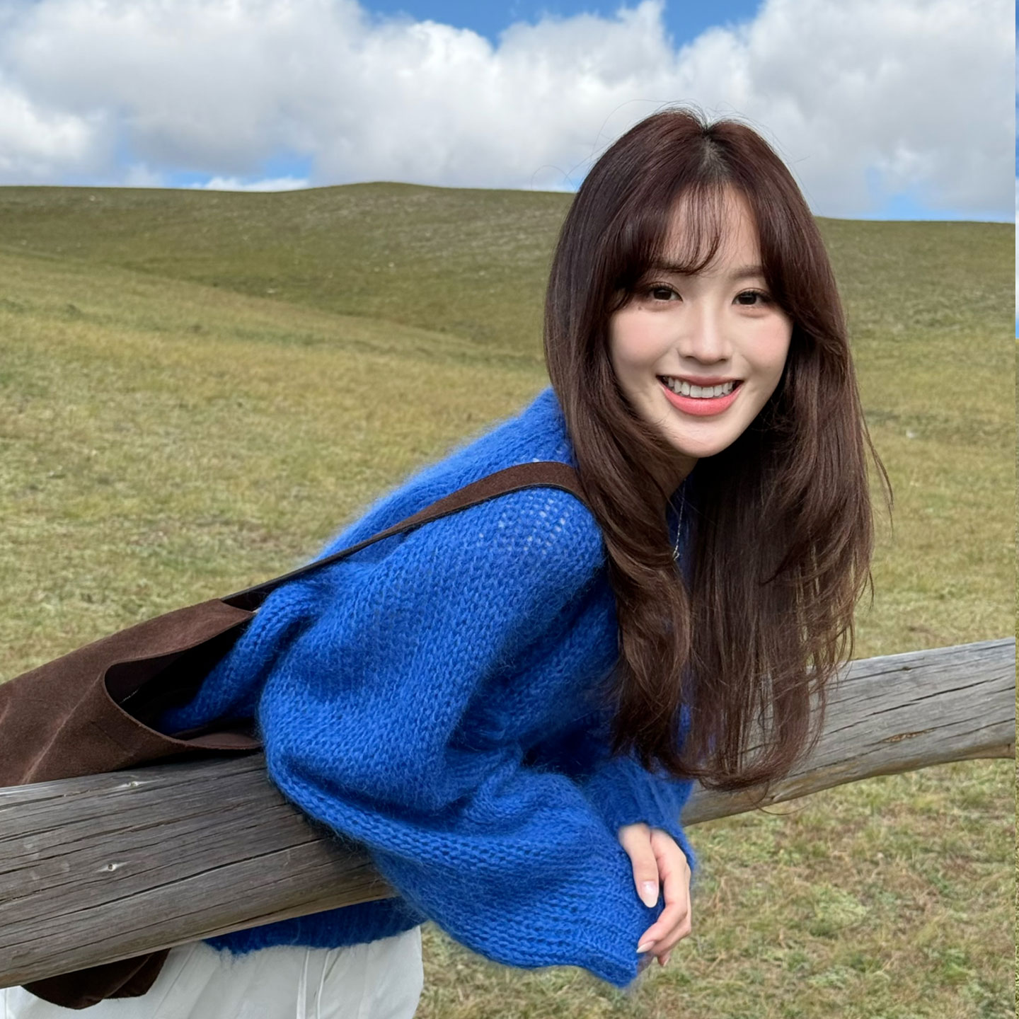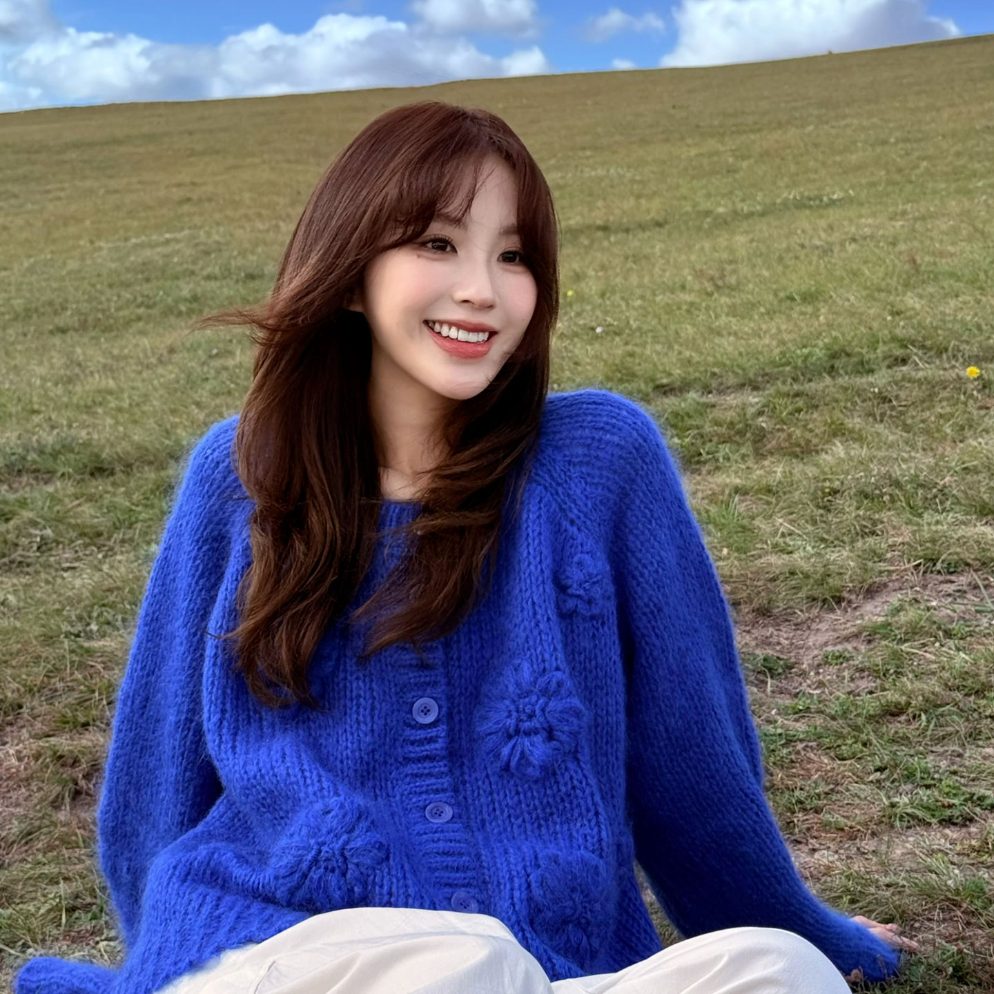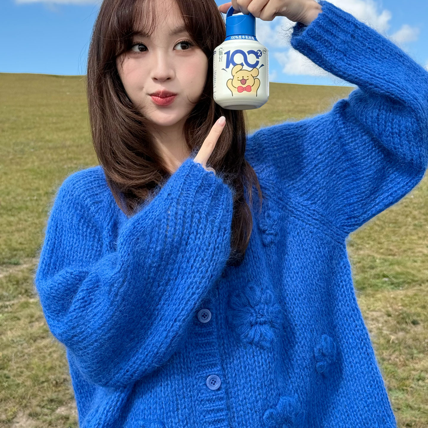 克萊因藍立體花朵毛衣開衫外套女秋冬慵懶風高級感寬松軟糯針織衫