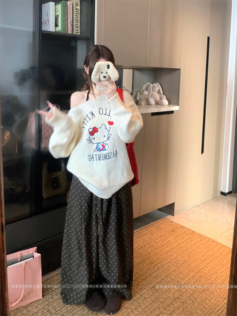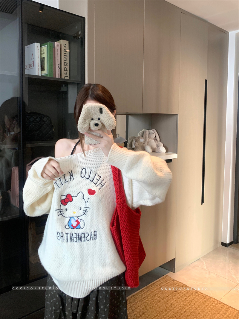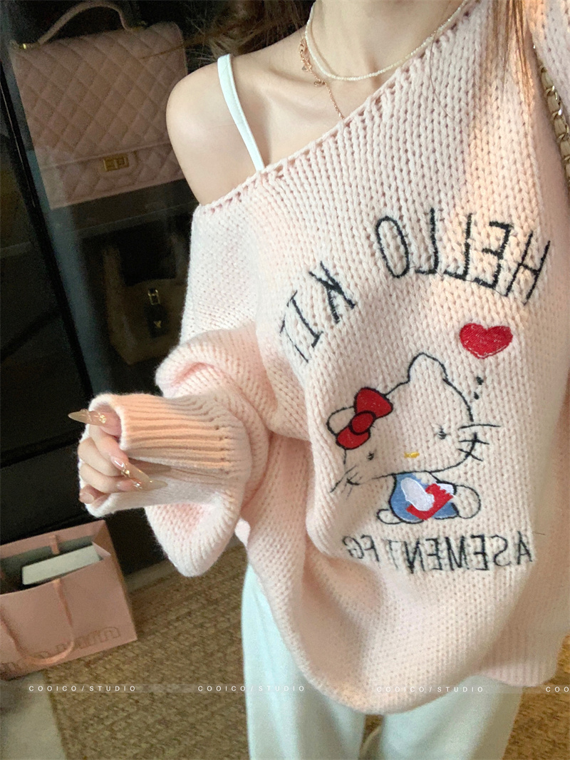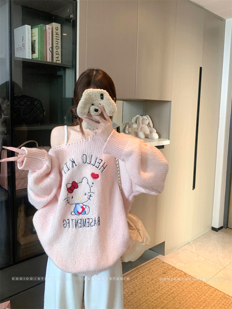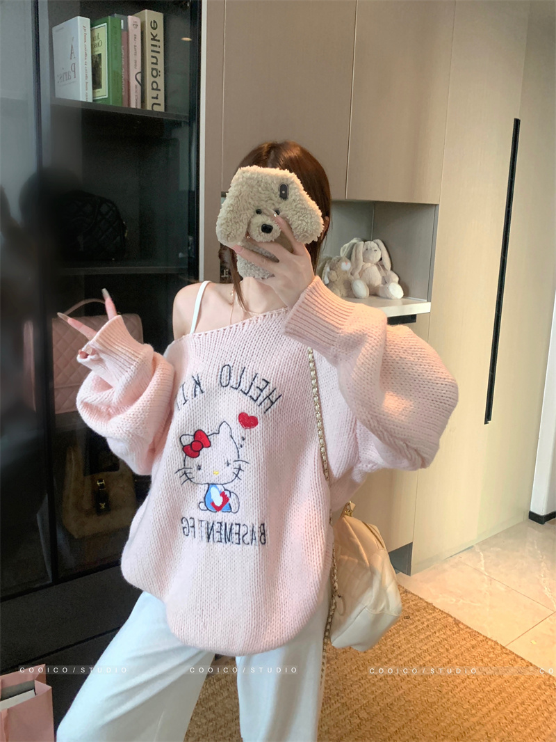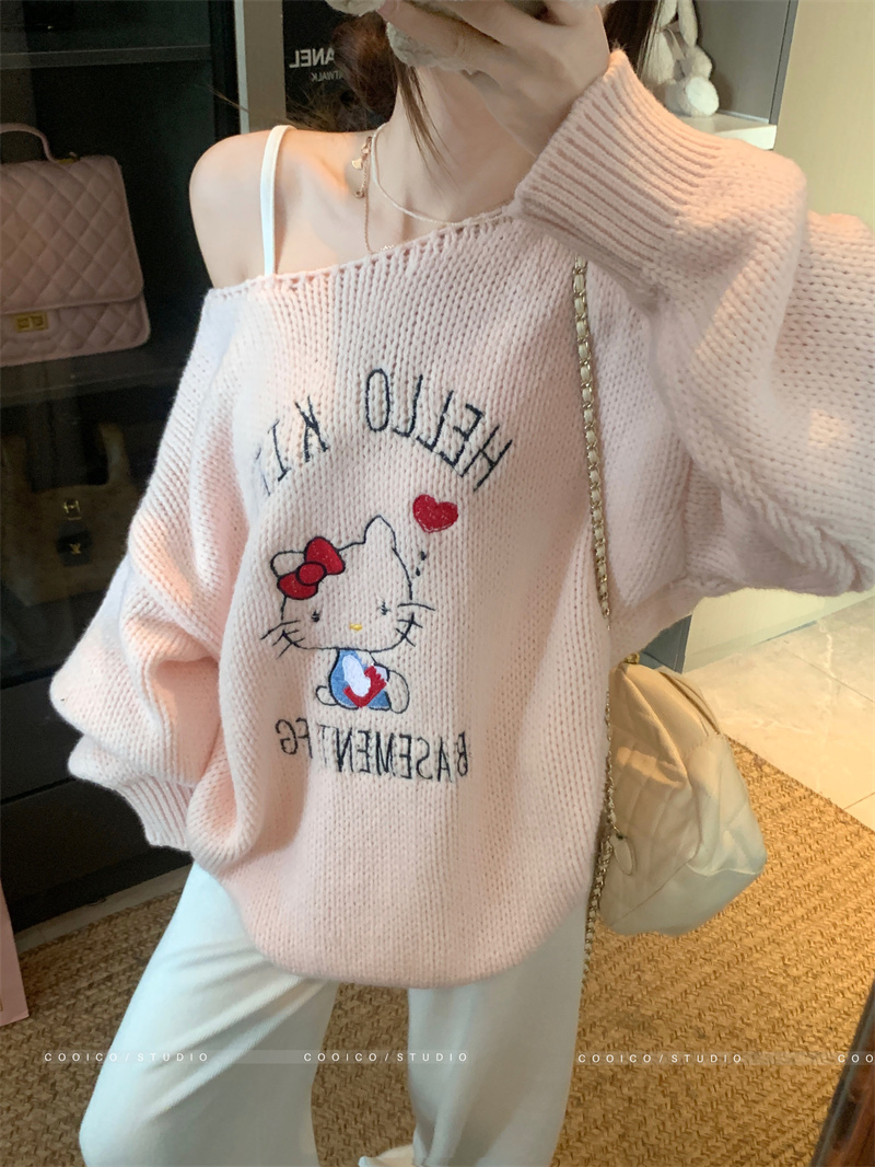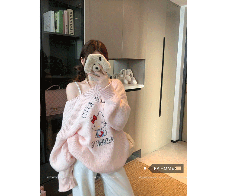 PPHOME 章若楠同款kt粗針毛衣長袖刺綉毛針織衫套頭寬松上衣女