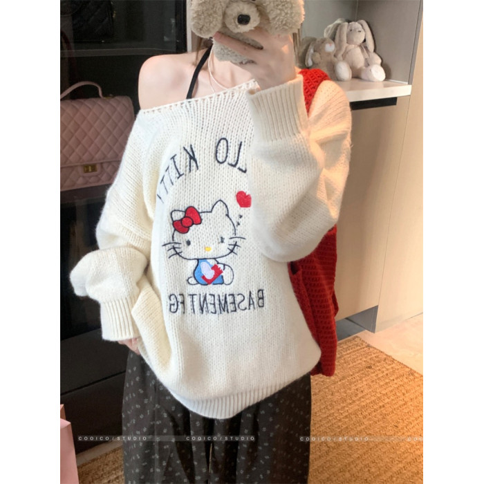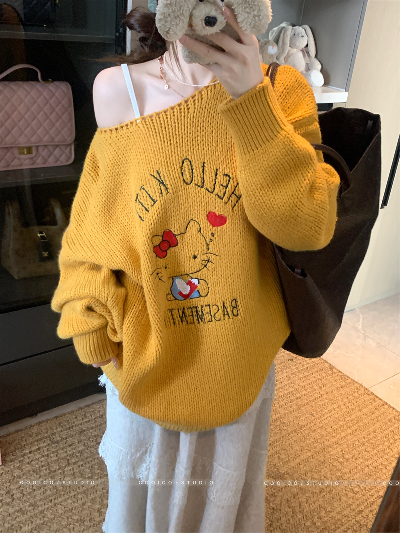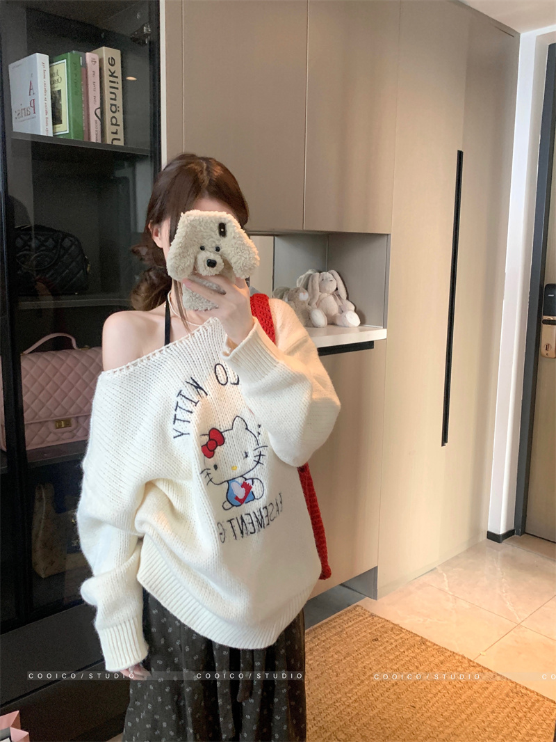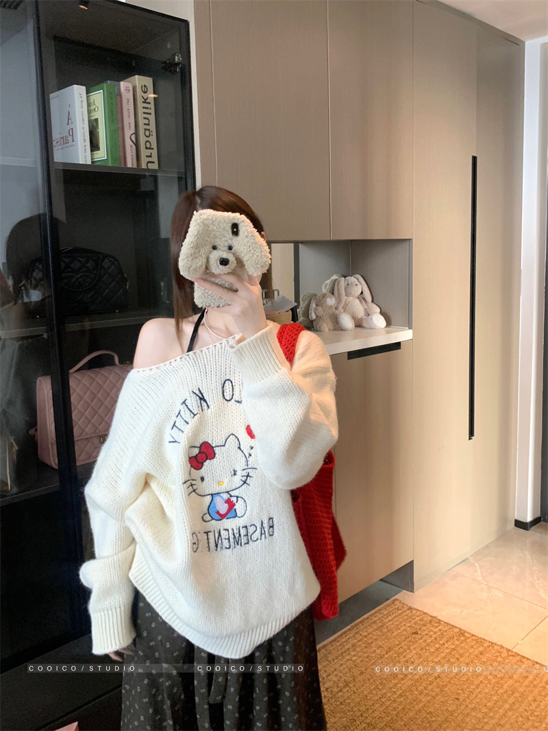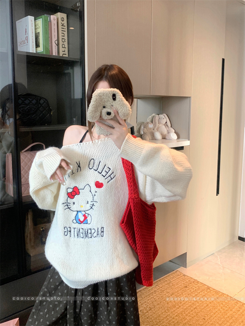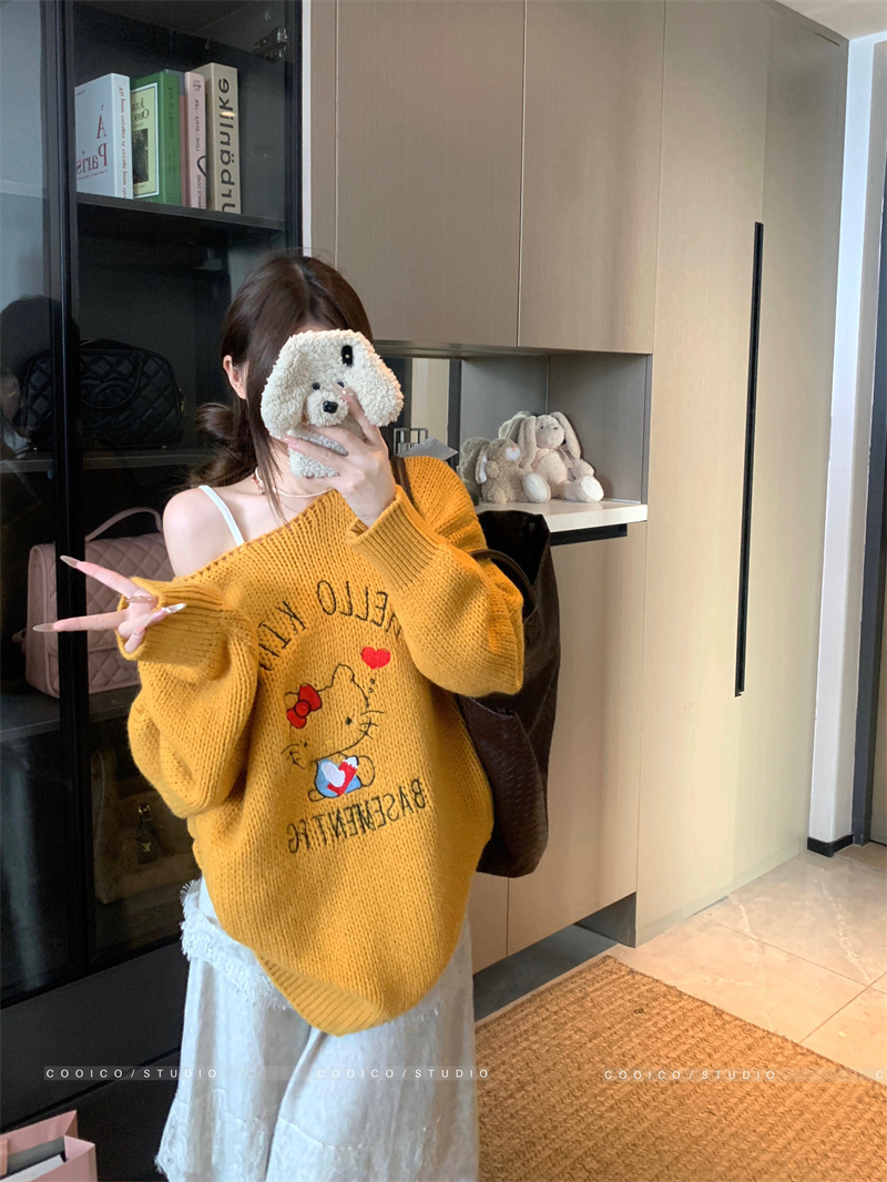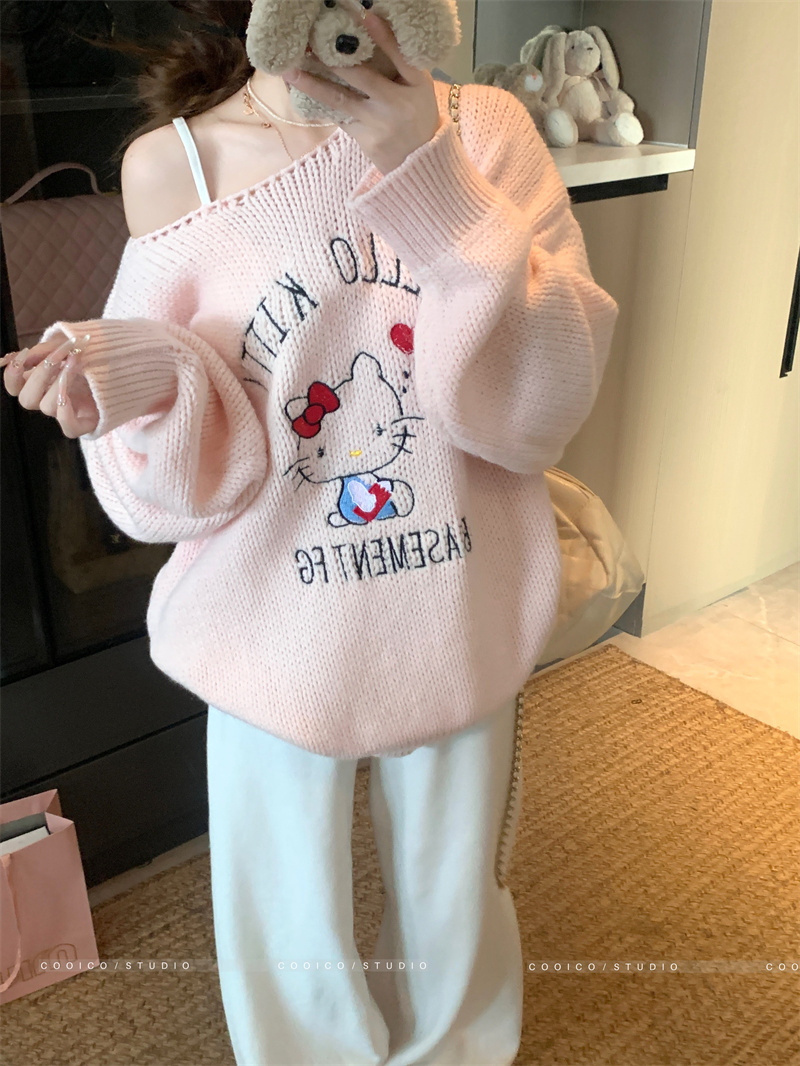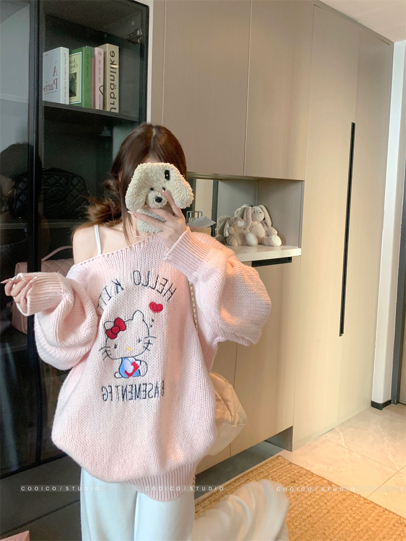 PPHOME 章若楠同款kt粗針毛衣長袖刺綉毛針織衫套頭寬松上衣女