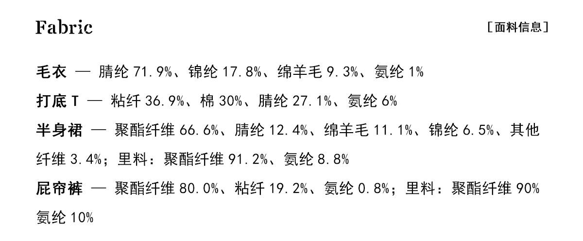 | 材質成分 | 聚丙烯腈纖維(腈綸)71.9% 聚醯胺纖維(錦綸)17.8% 綿羊毛9.3% 聚氨酯彈性纖維(氨綸)1% |