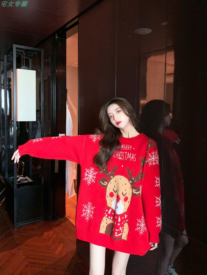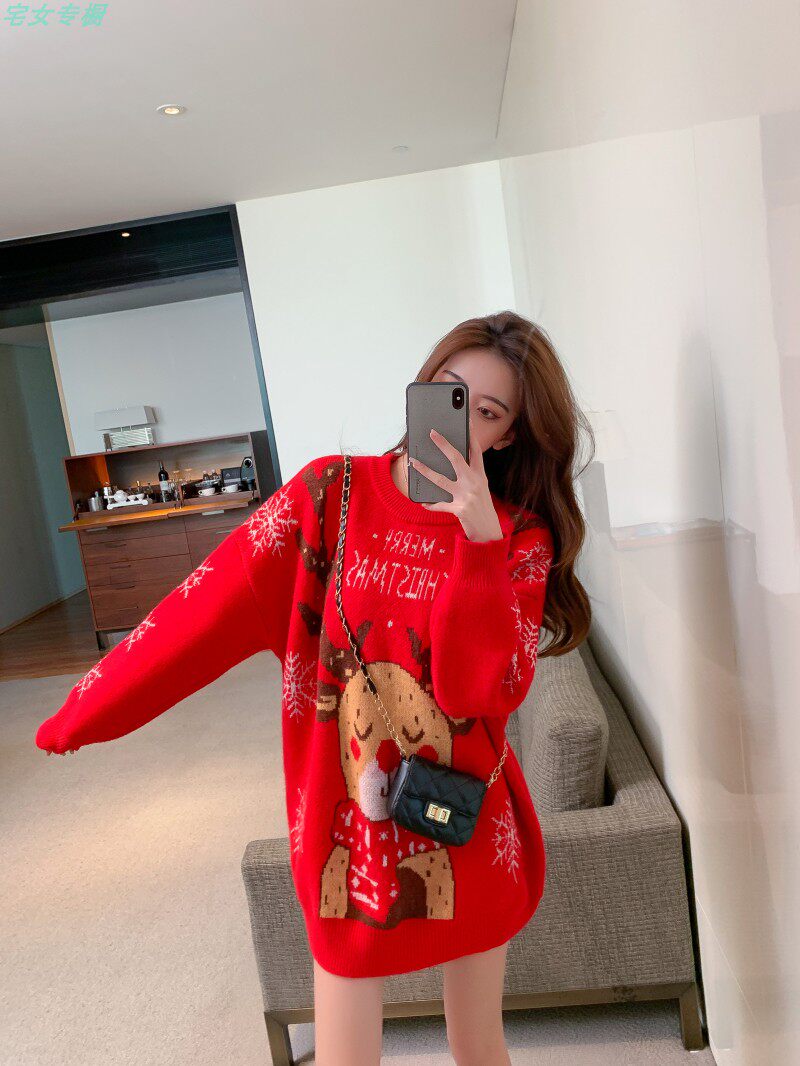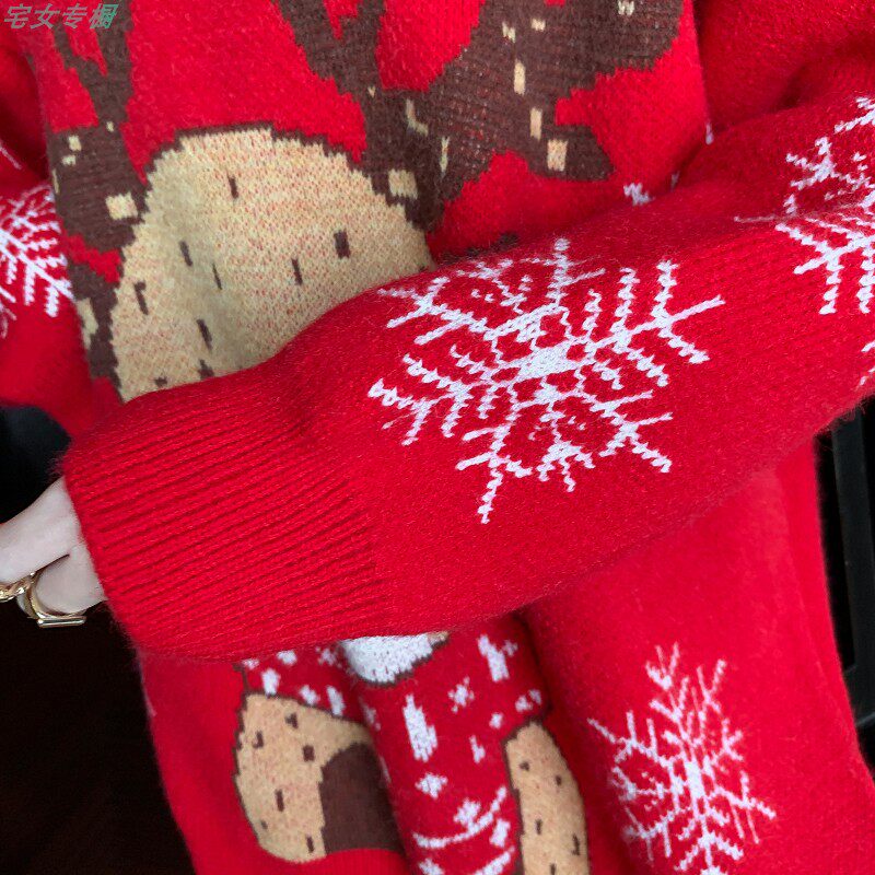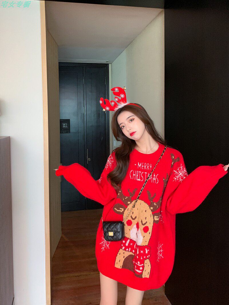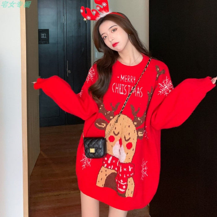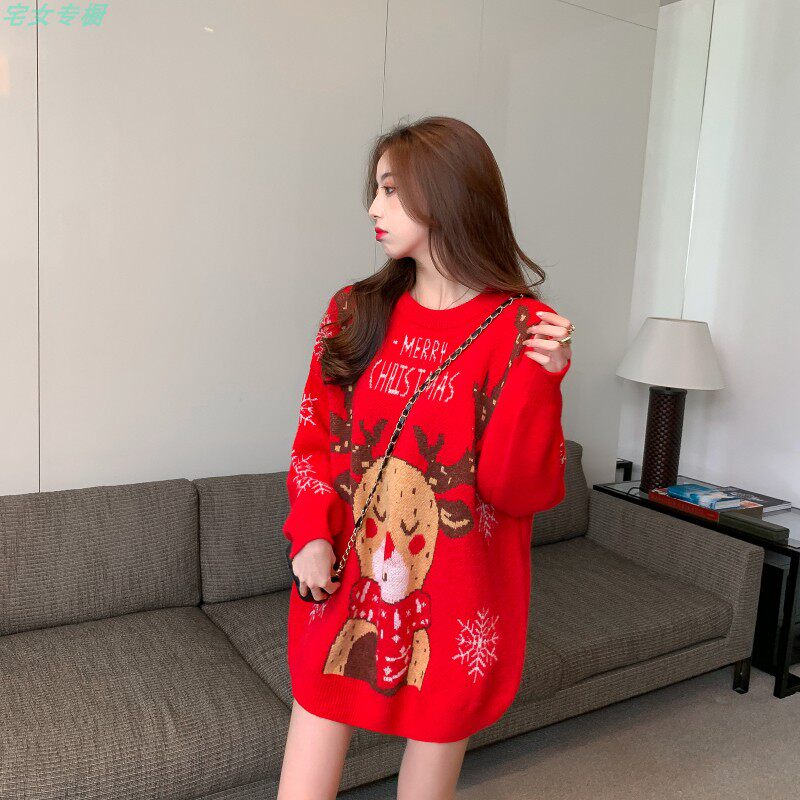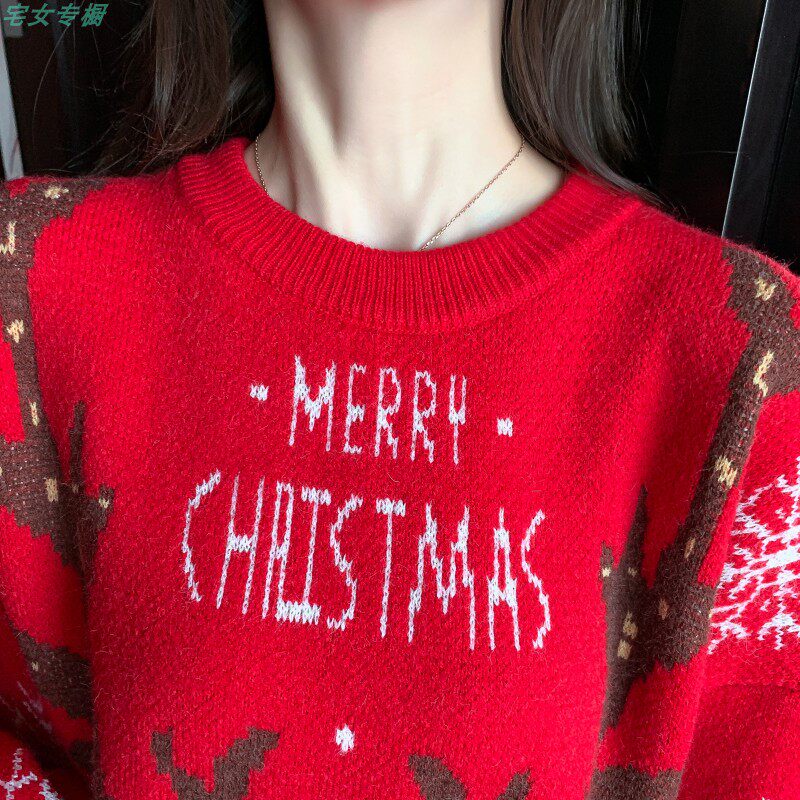 聖誕紅色毛衣麋鹿女秋冬外穿慵懶風寬松本命年2021針織衫加厚上衣