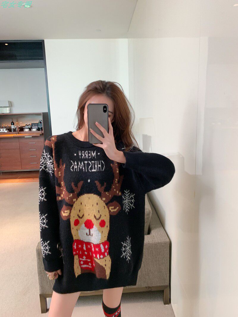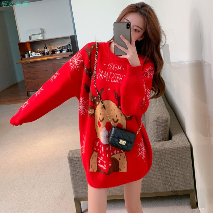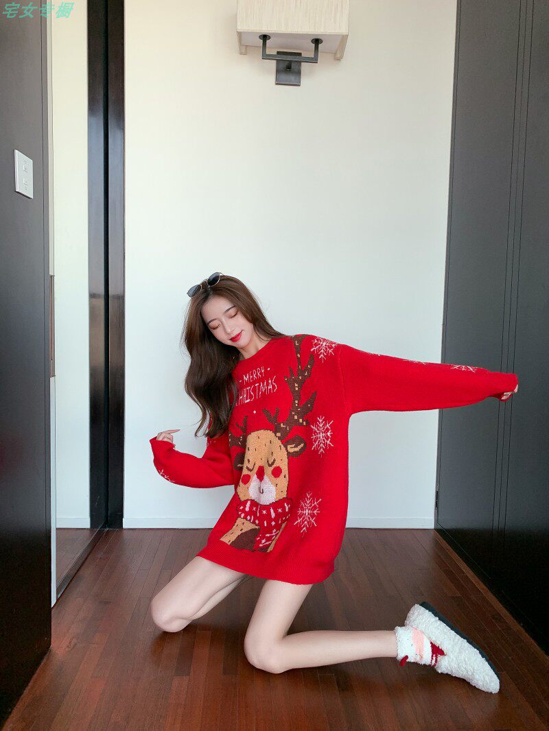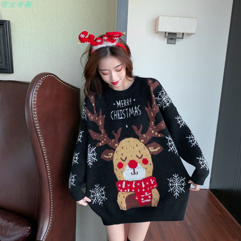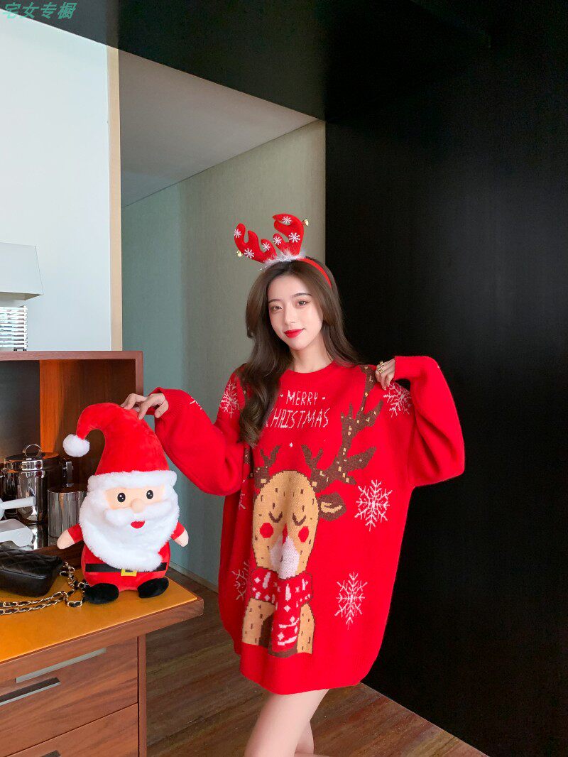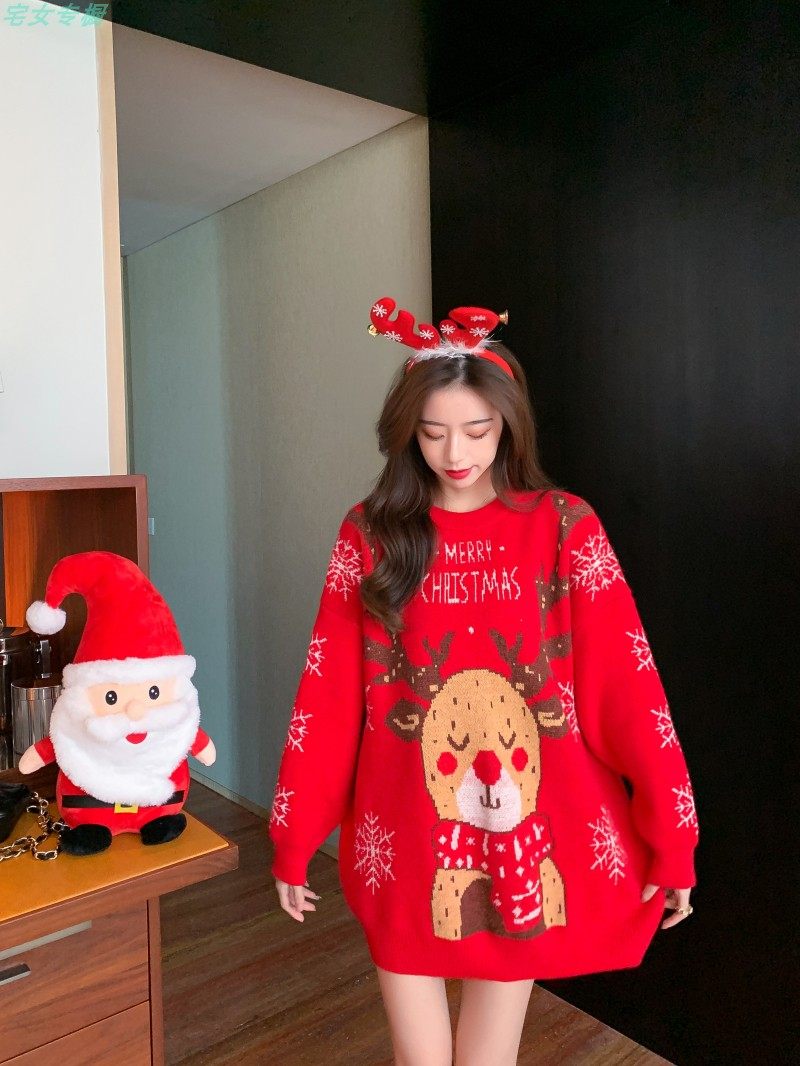 聖誕紅色毛衣麋鹿女秋冬外穿慵懶風寬松本命年2021針織衫加厚上衣