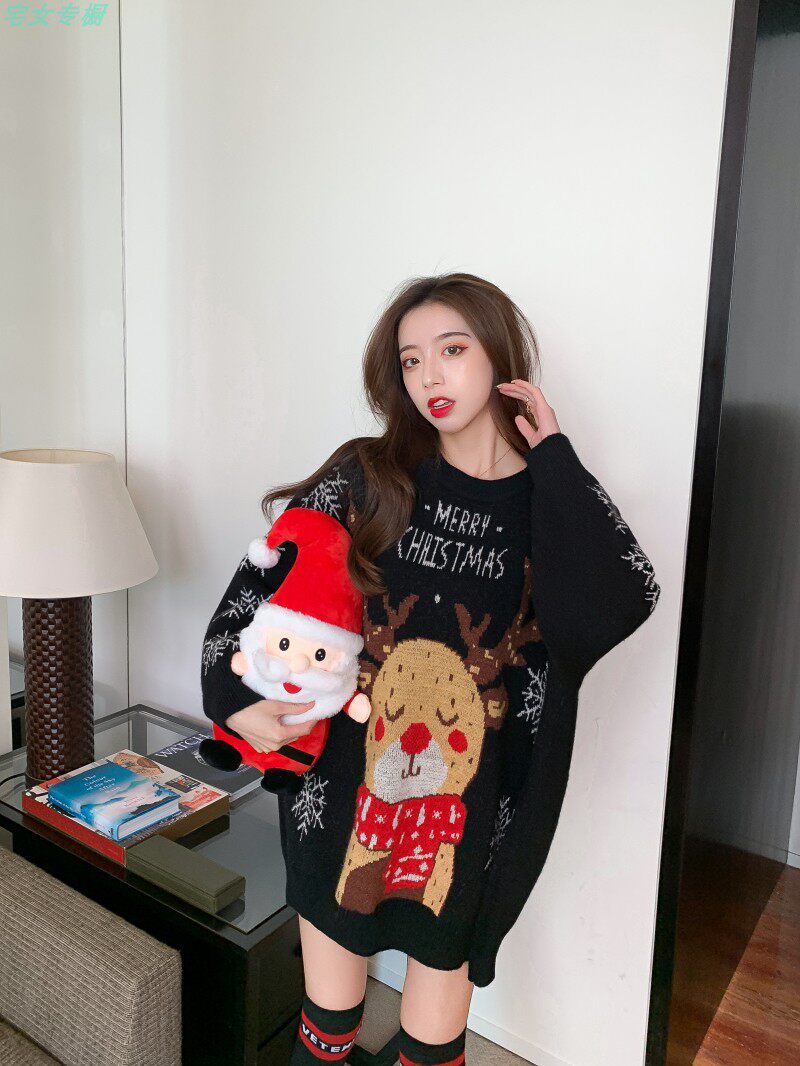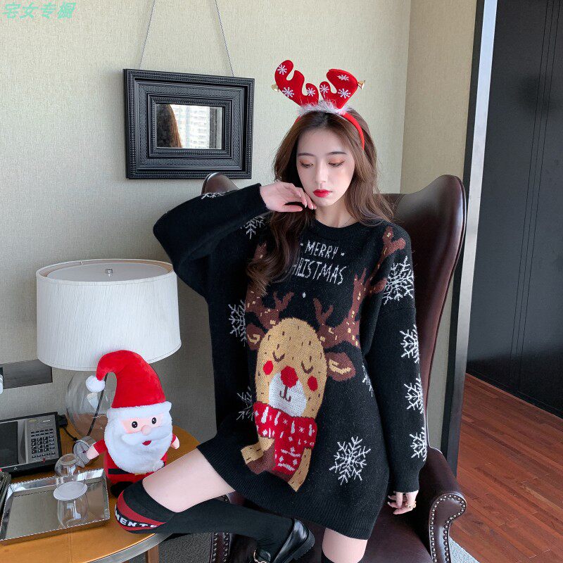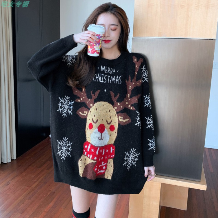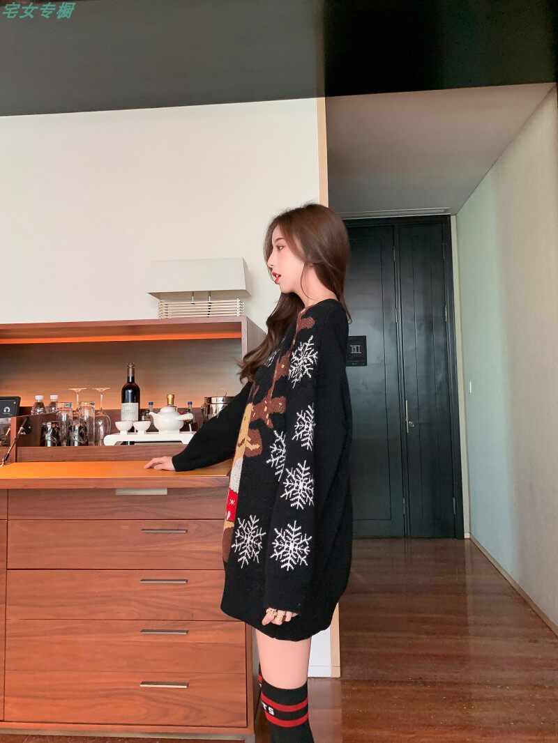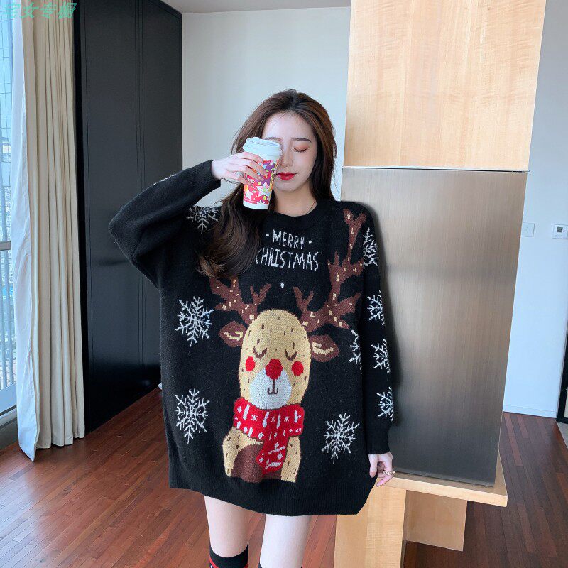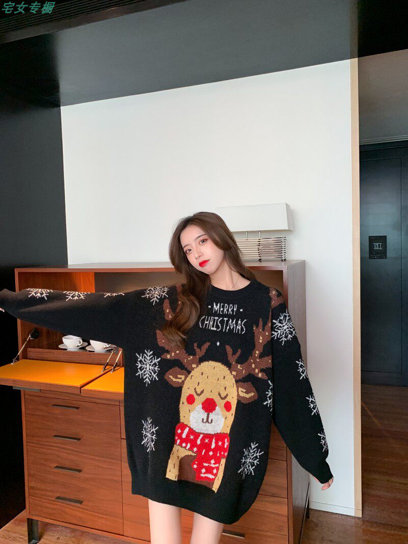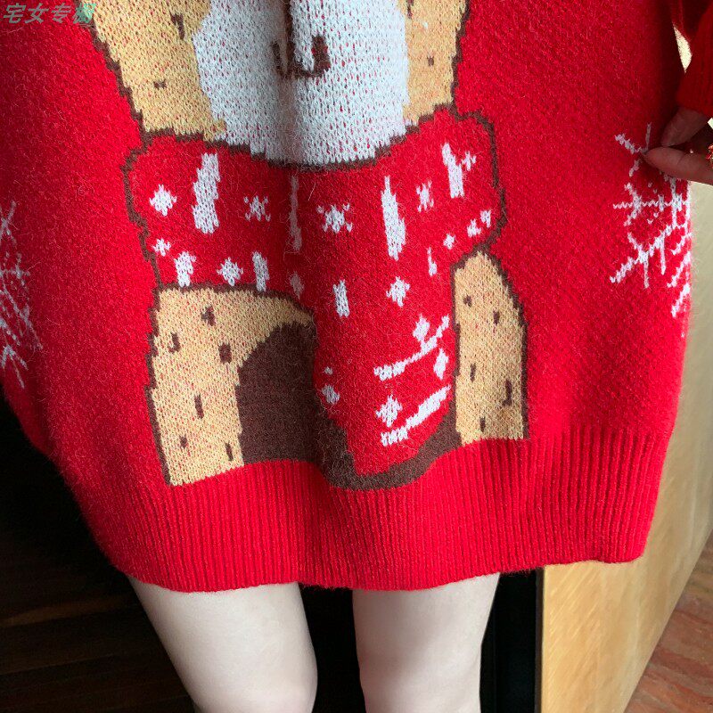 聖誕紅色毛衣麋鹿女秋冬外穿慵懶風寬松本命年2021針織衫加厚上衣