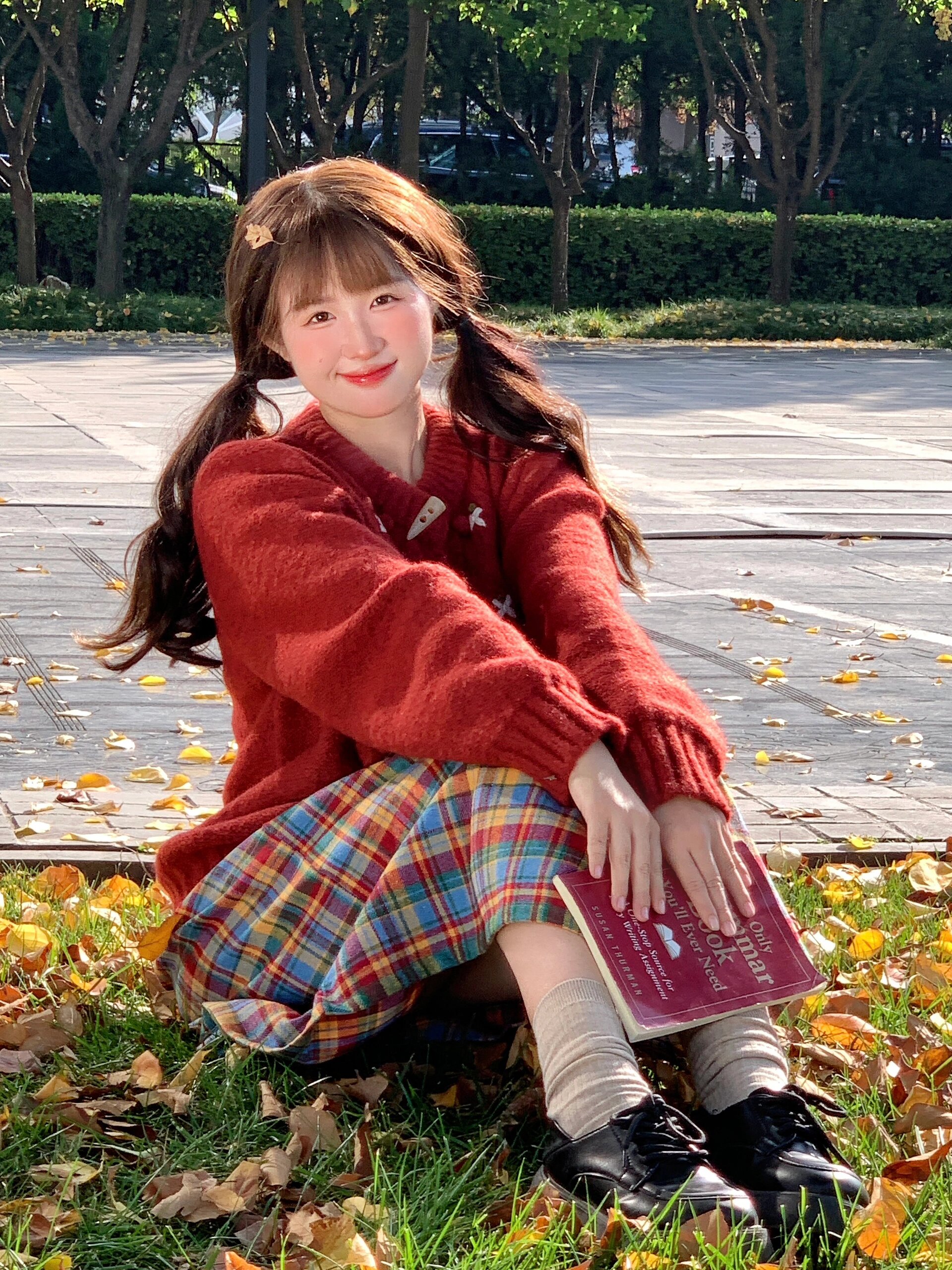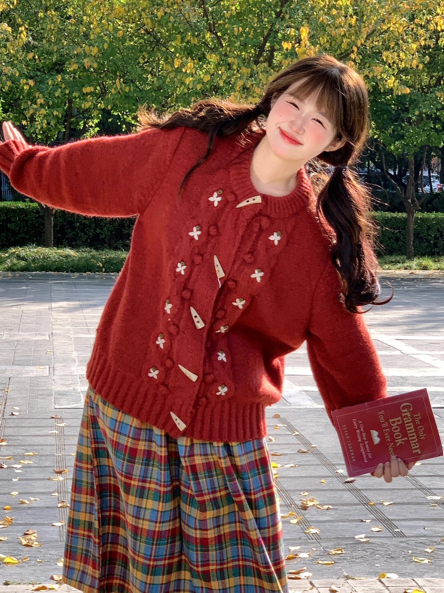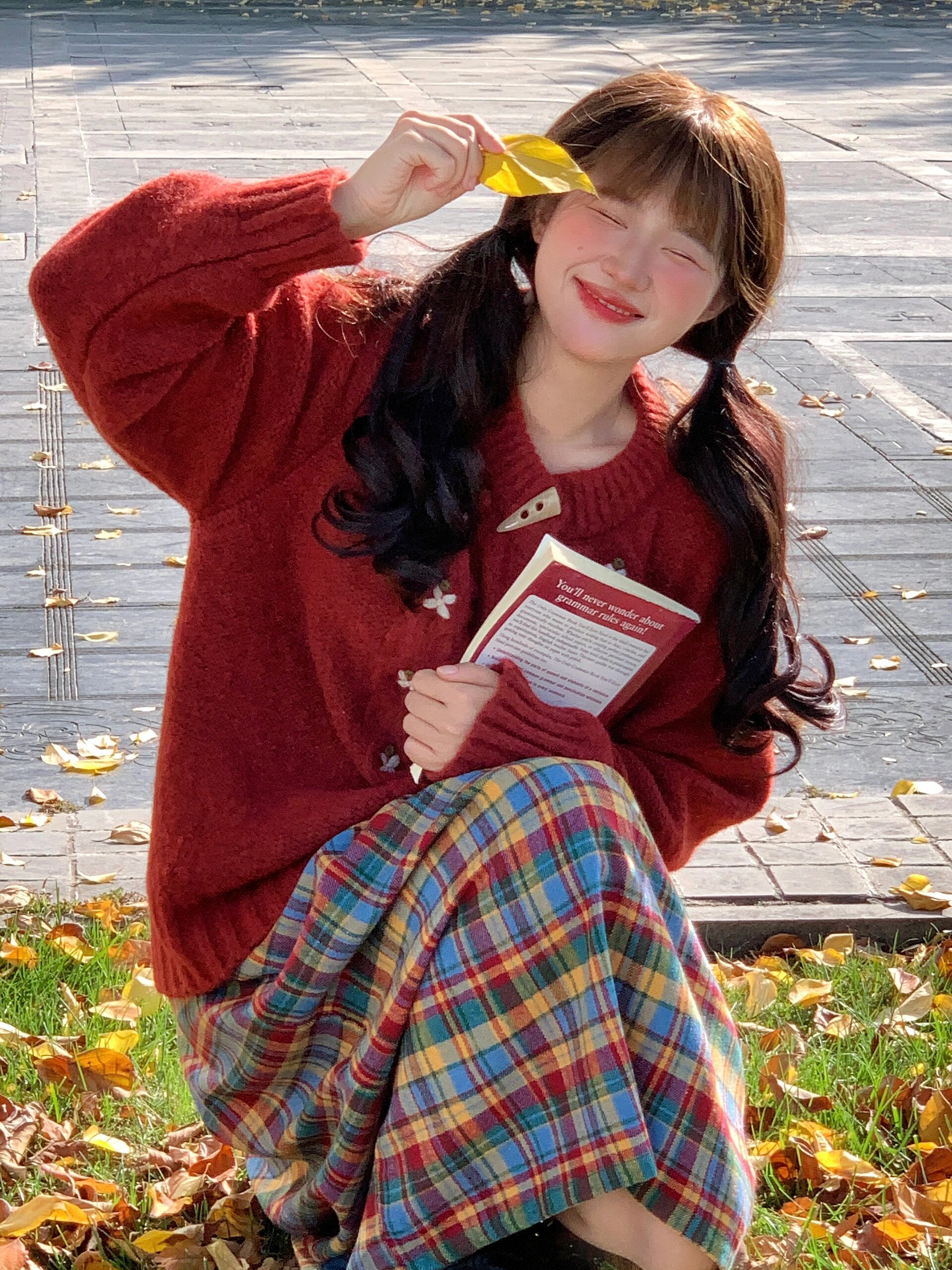 溫柔風甜美小個子穿搭一整套聖誕紅色毛衣外套格子半身裙兩件套裝