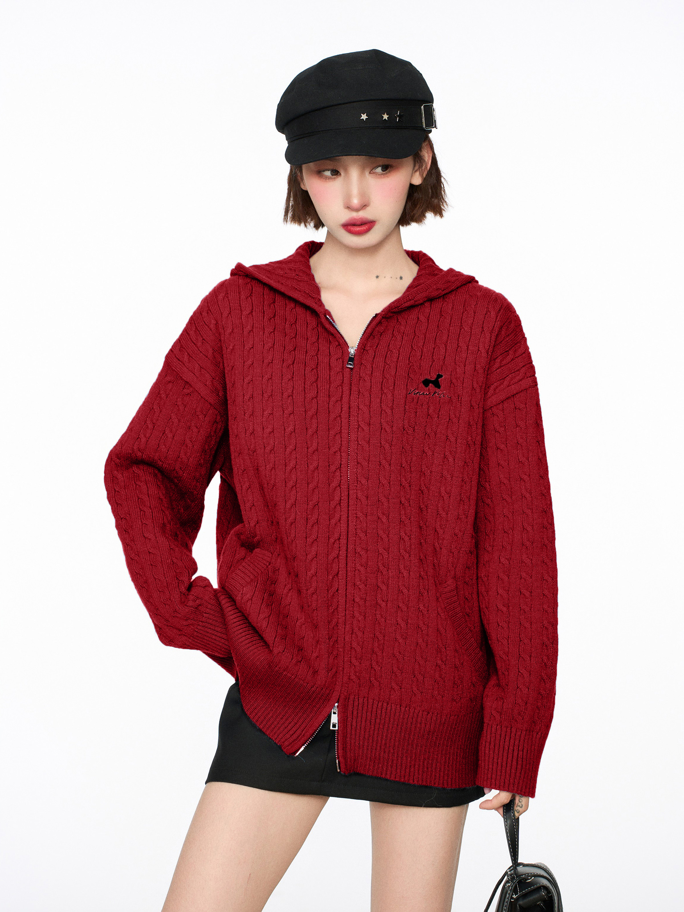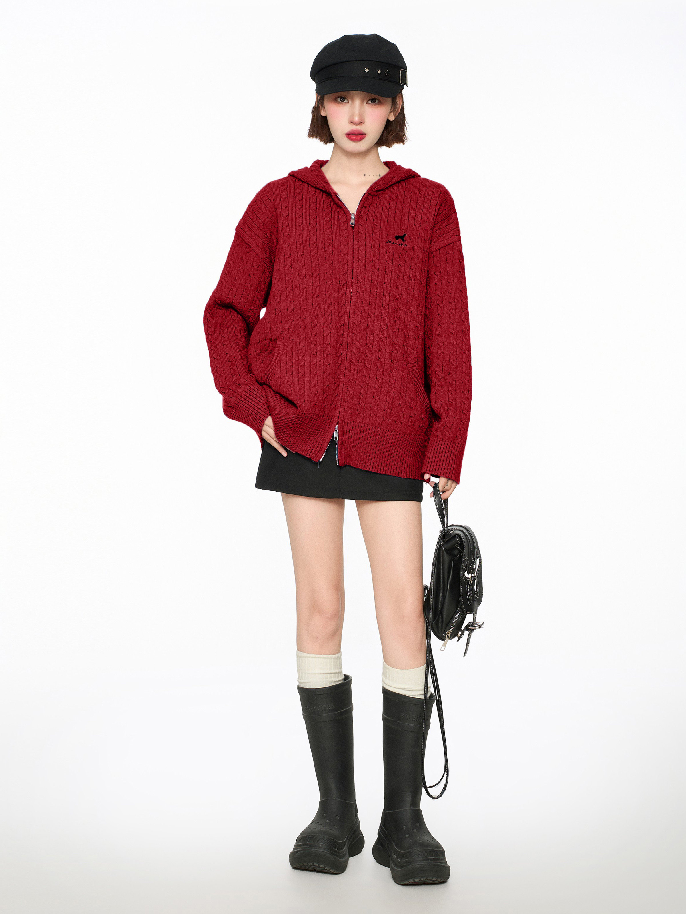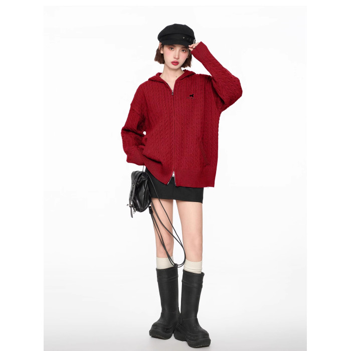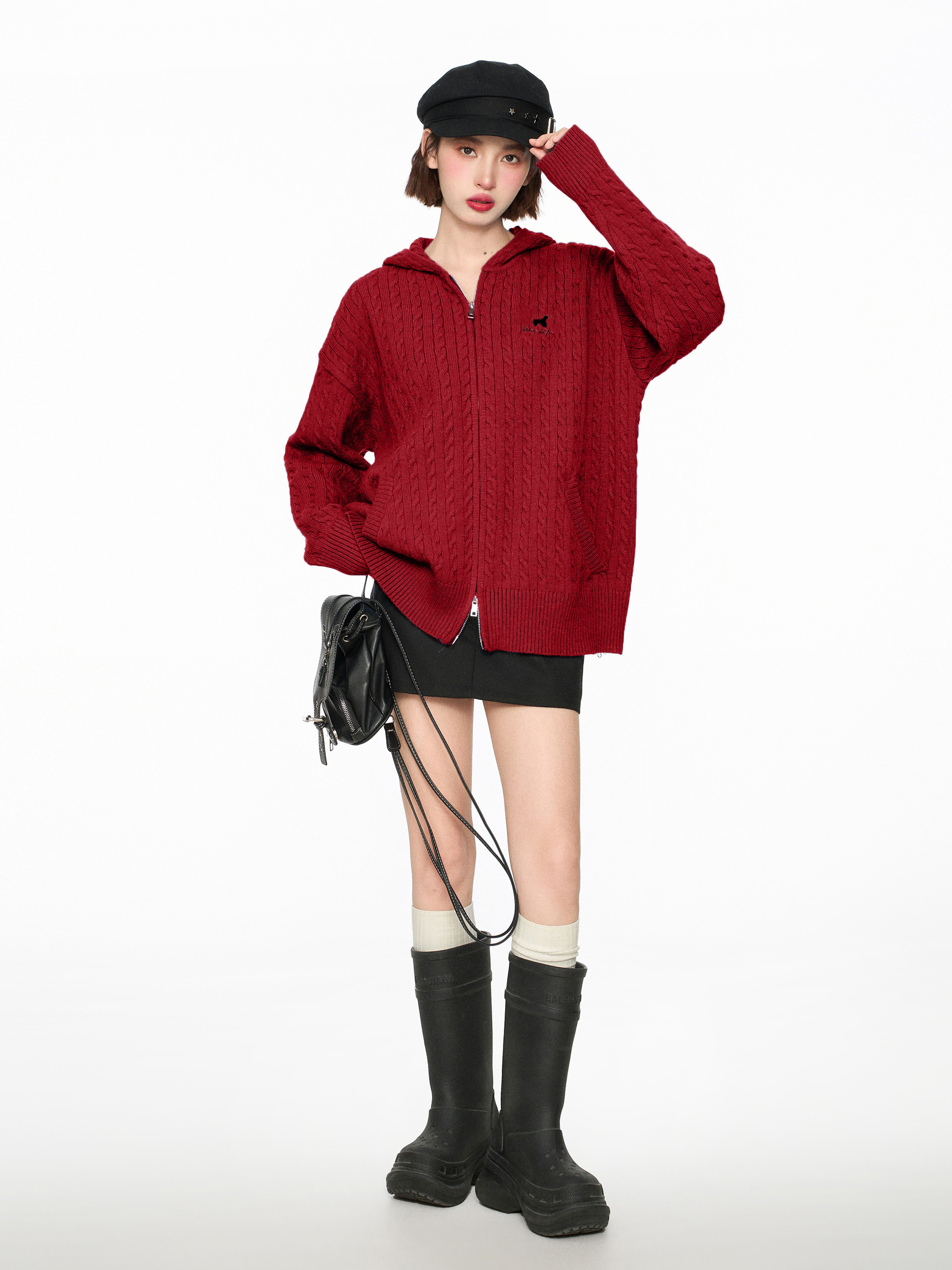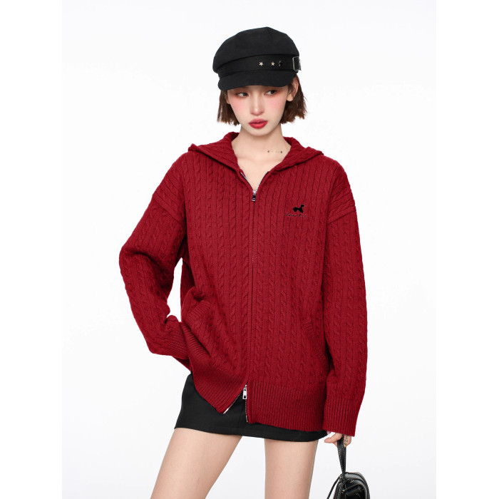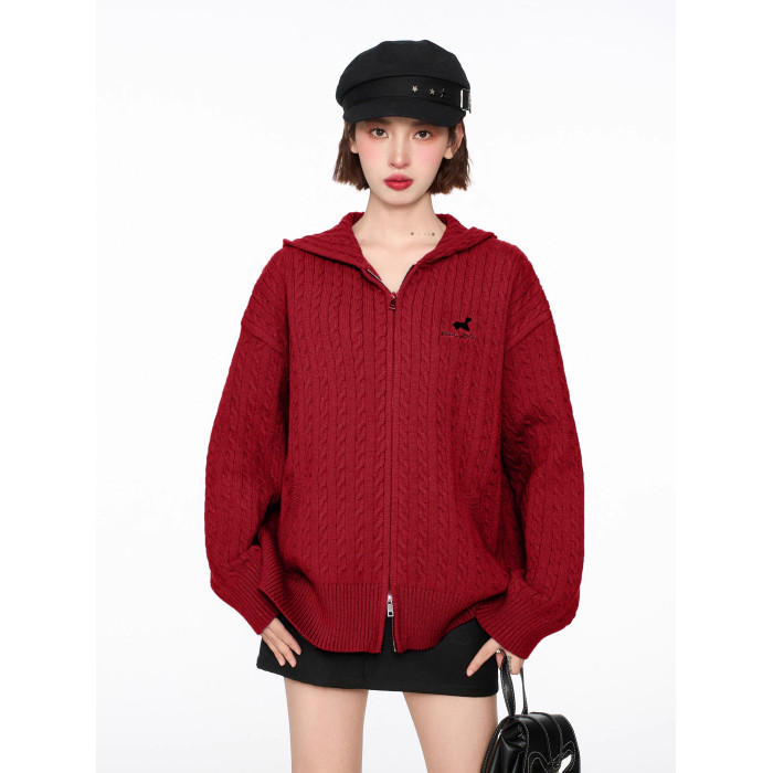 聖誕紅色雙拉鍊連帽麻花毛衣開衫外套女秋冬慵懶寬松加厚針織衛衣