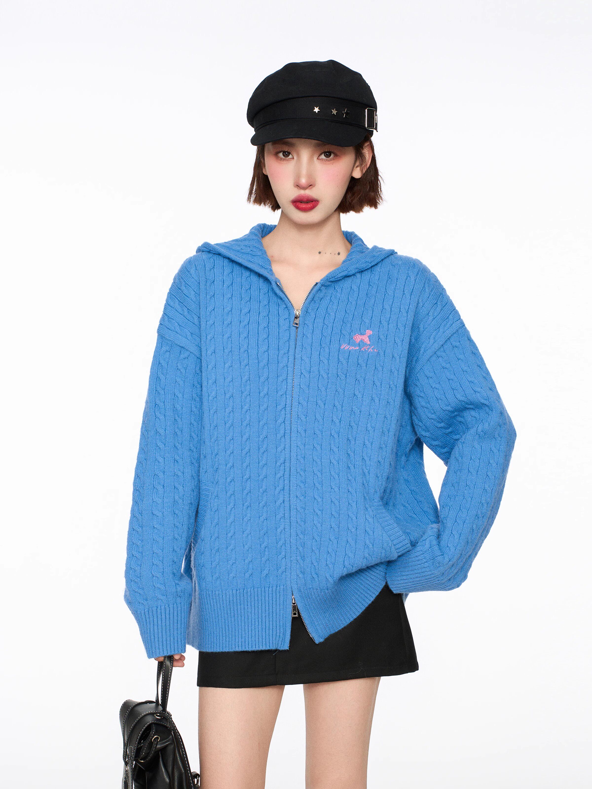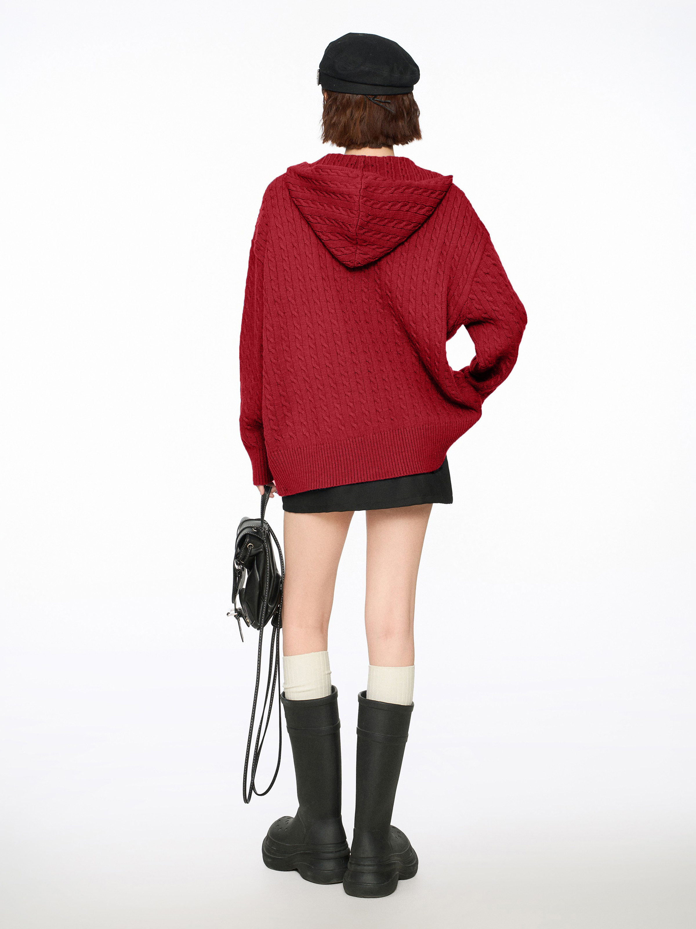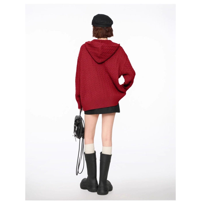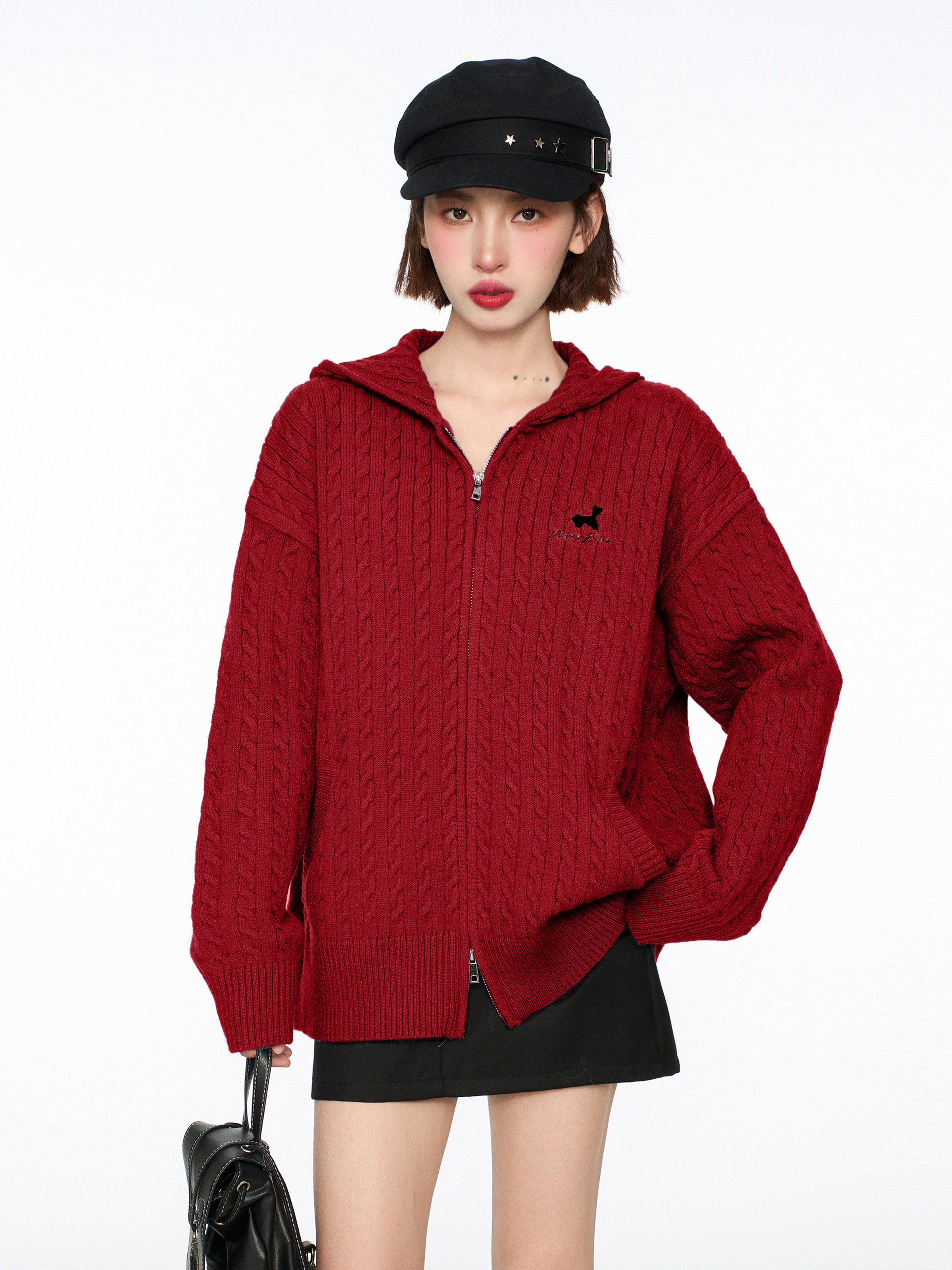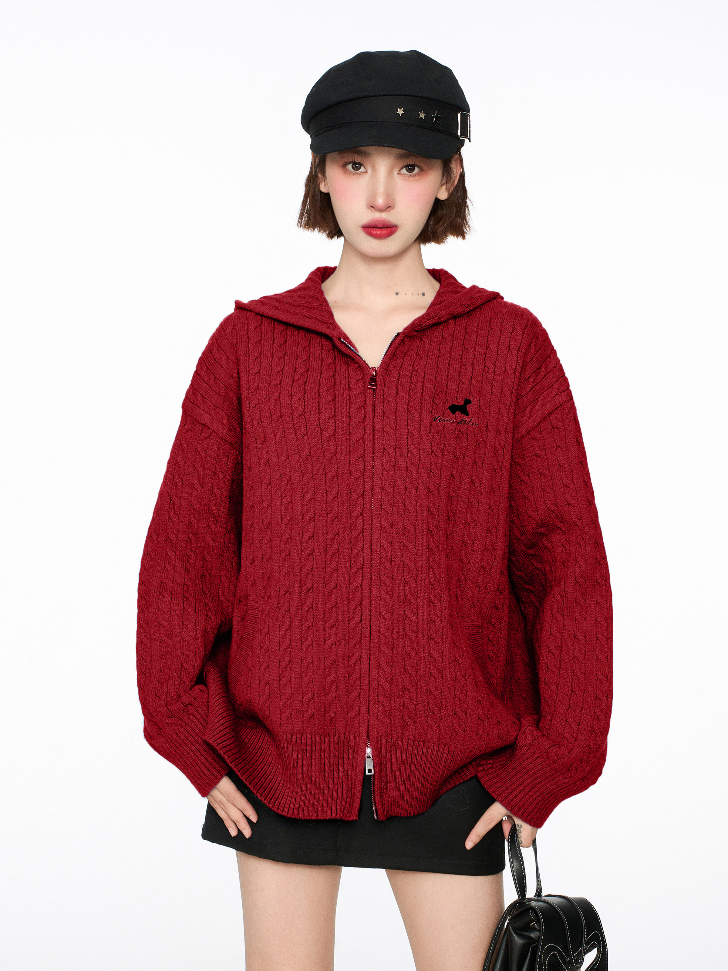 聖誕紅色雙拉鍊連帽麻花毛衣開衫外套女秋冬慵懶寬松加厚針織衛衣