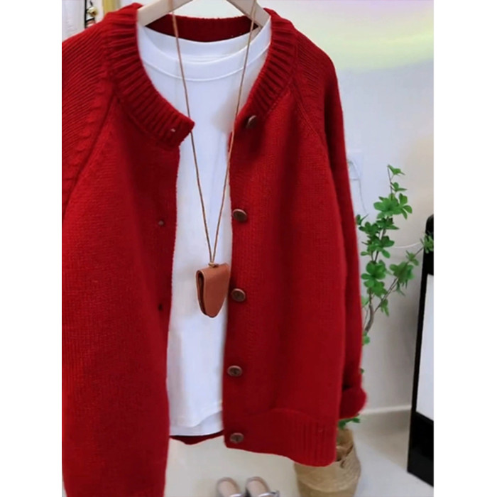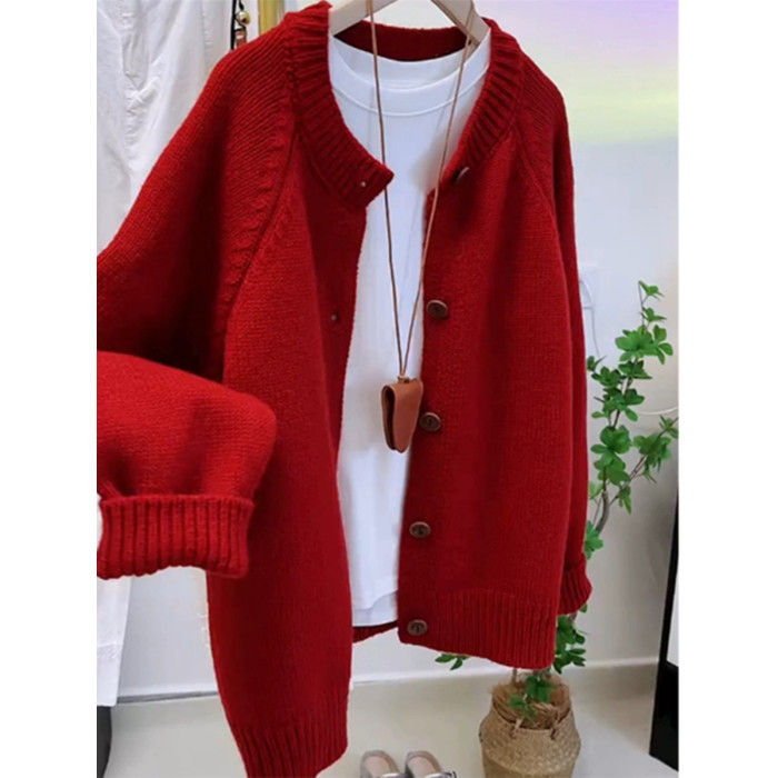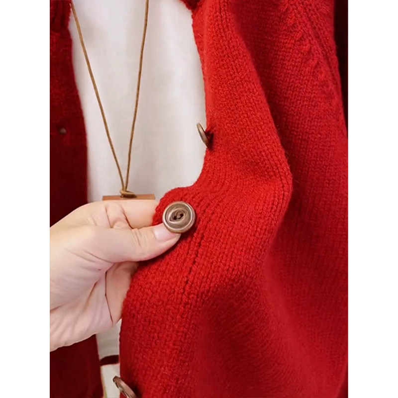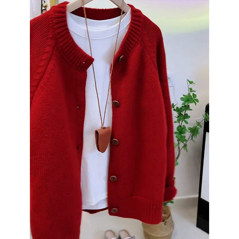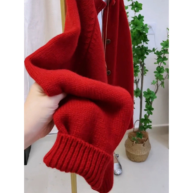 歐洲站大牌新年過年聖誕紅色毛衣外套女秋冬季高級感圓領針織開衫