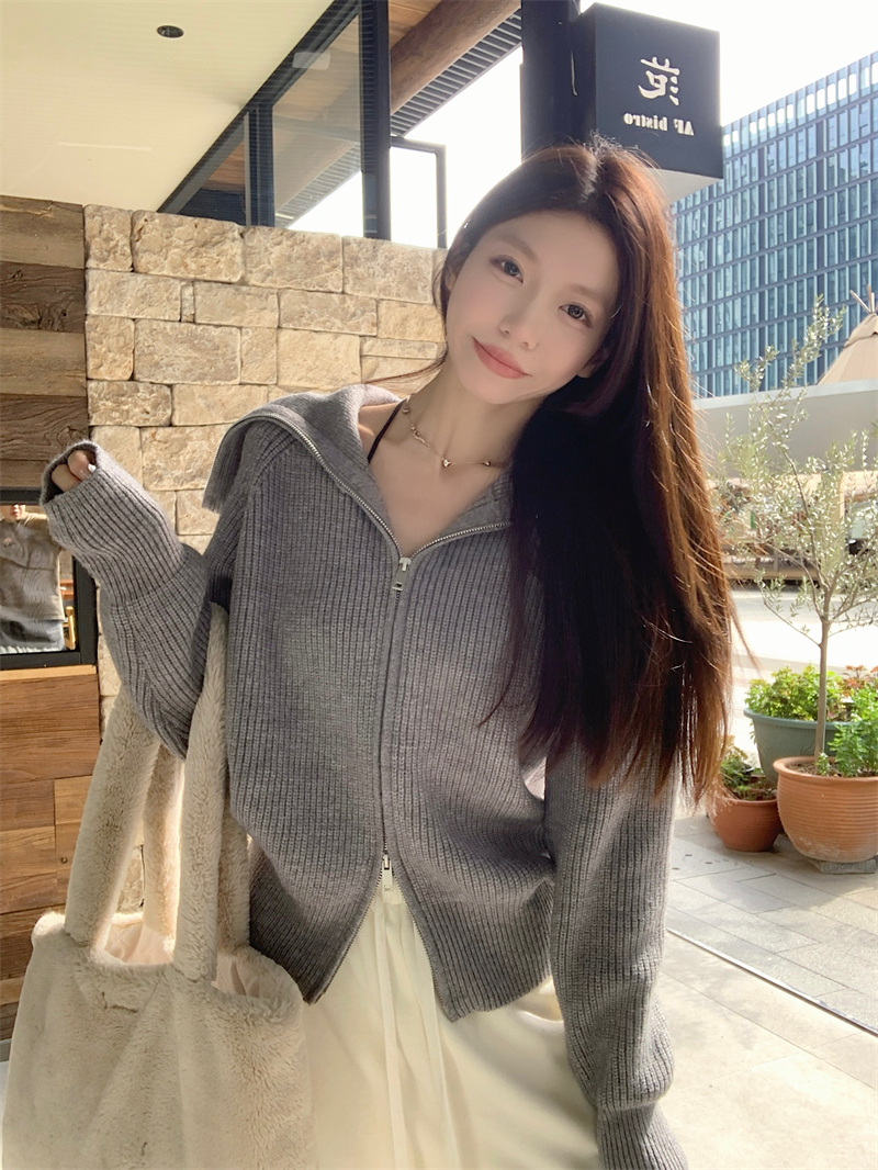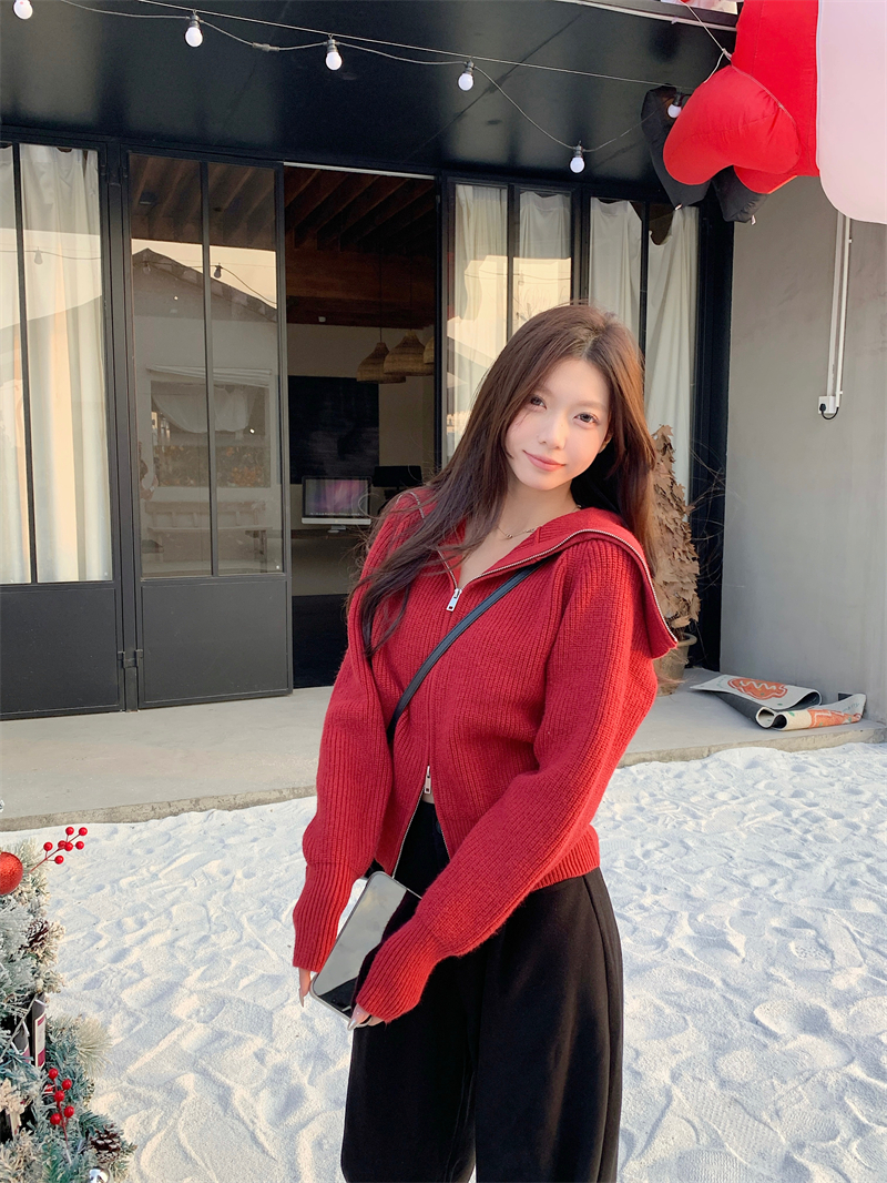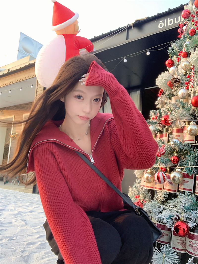 2025年秋季聖誕紅色毛衣外套女翻領喜慶新年紅色拉鍊針織衫短外套