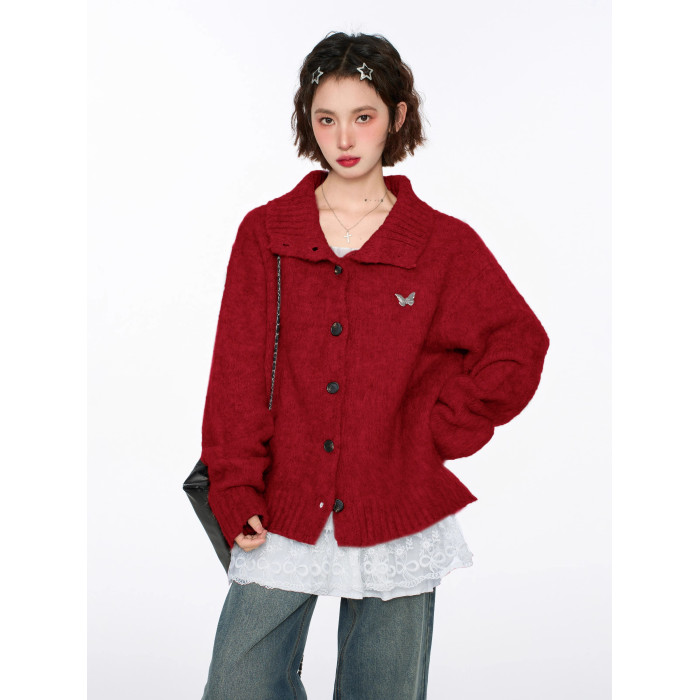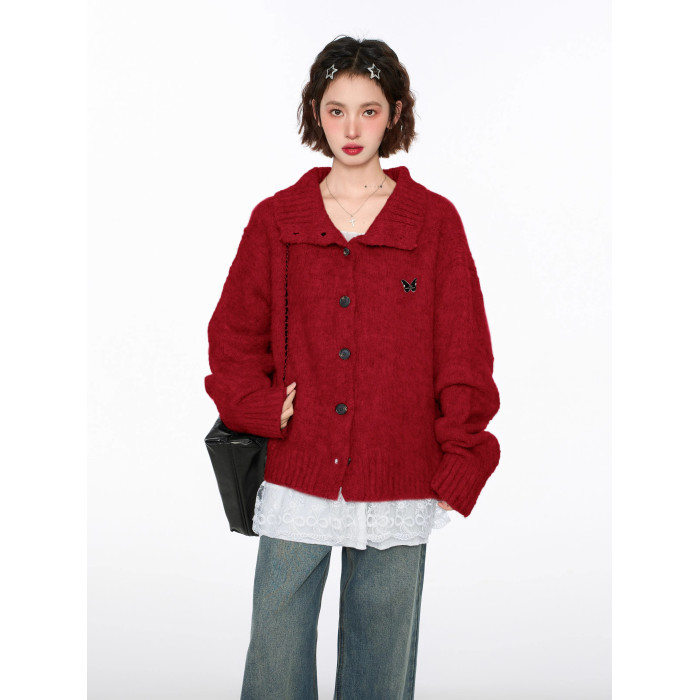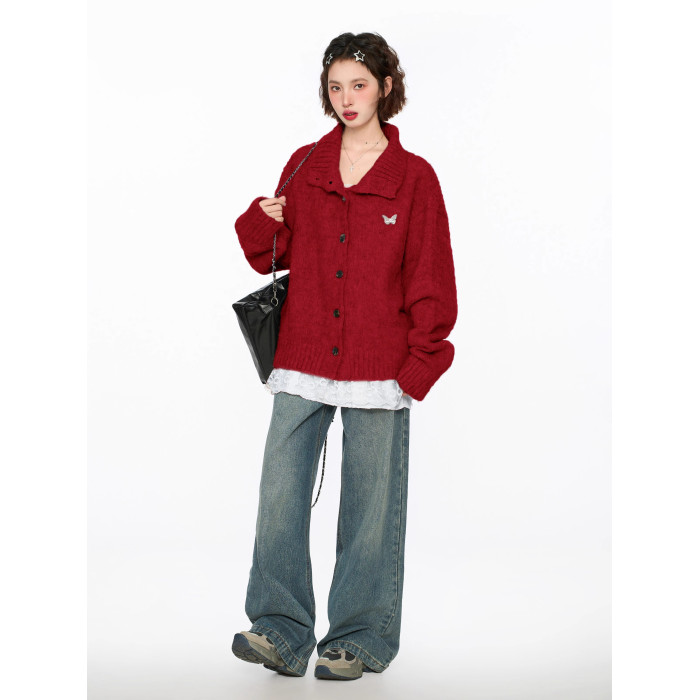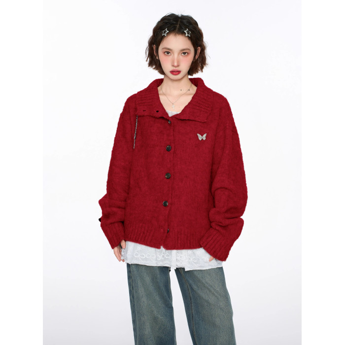 聖誕紅色半高領立領毛衣外套女秋早秋寬松慵懶風加厚翻領針織開衫