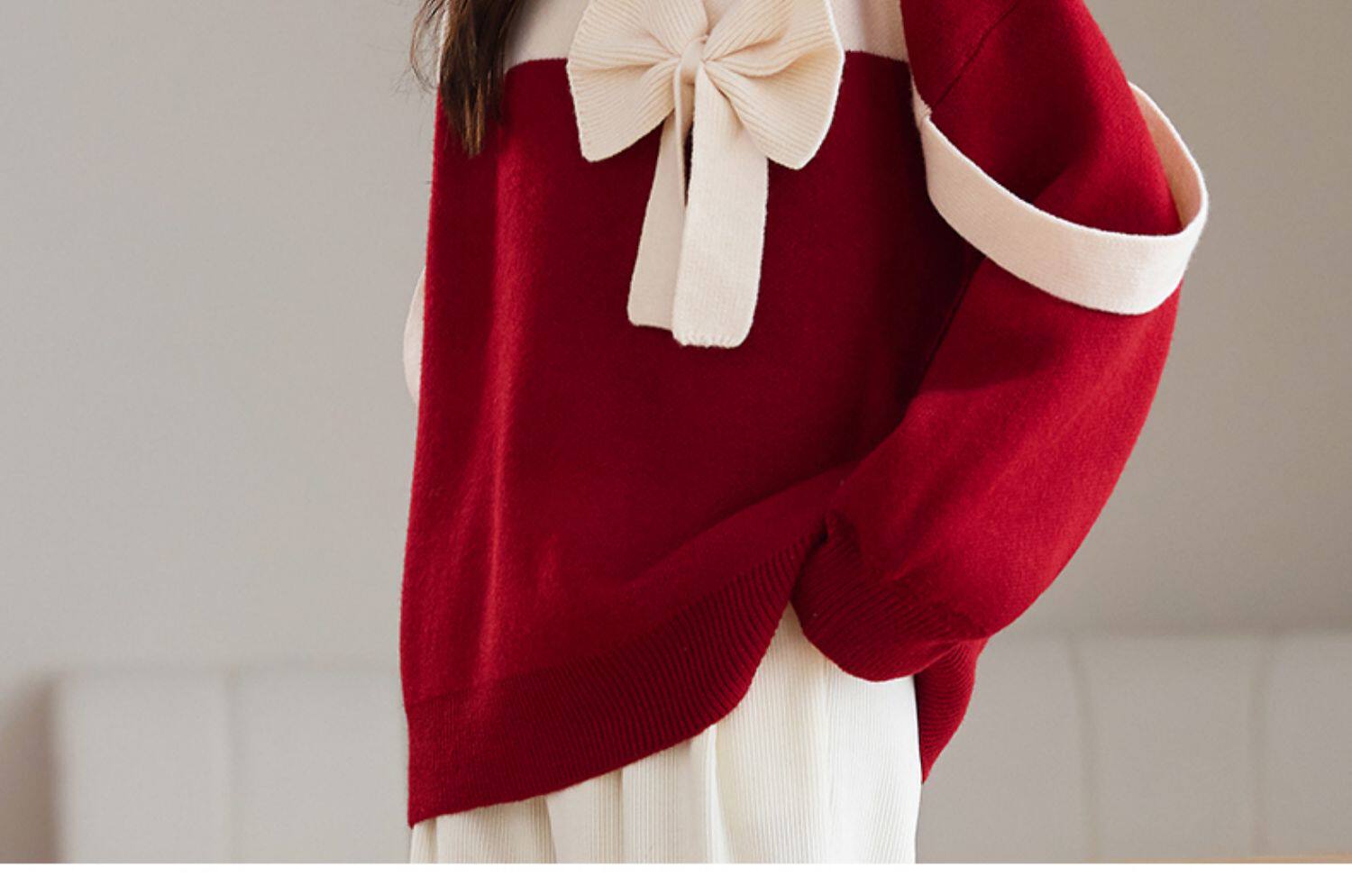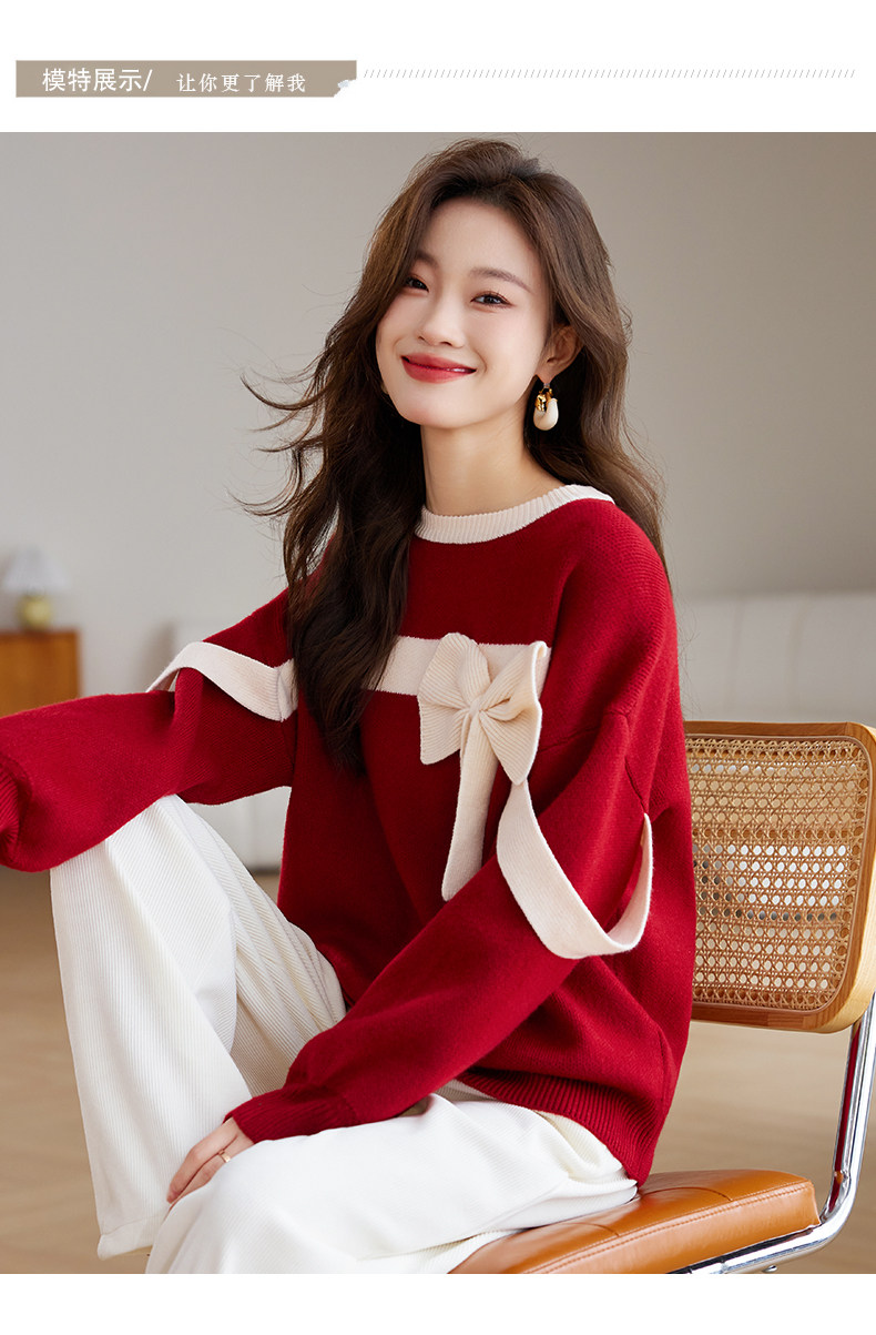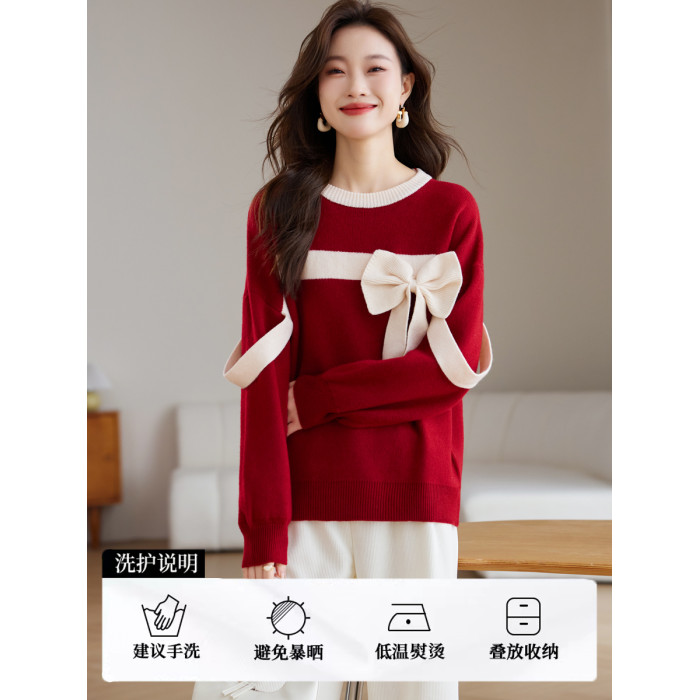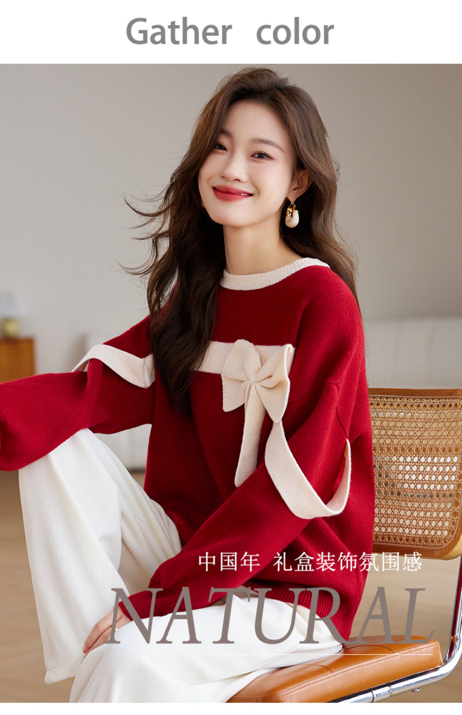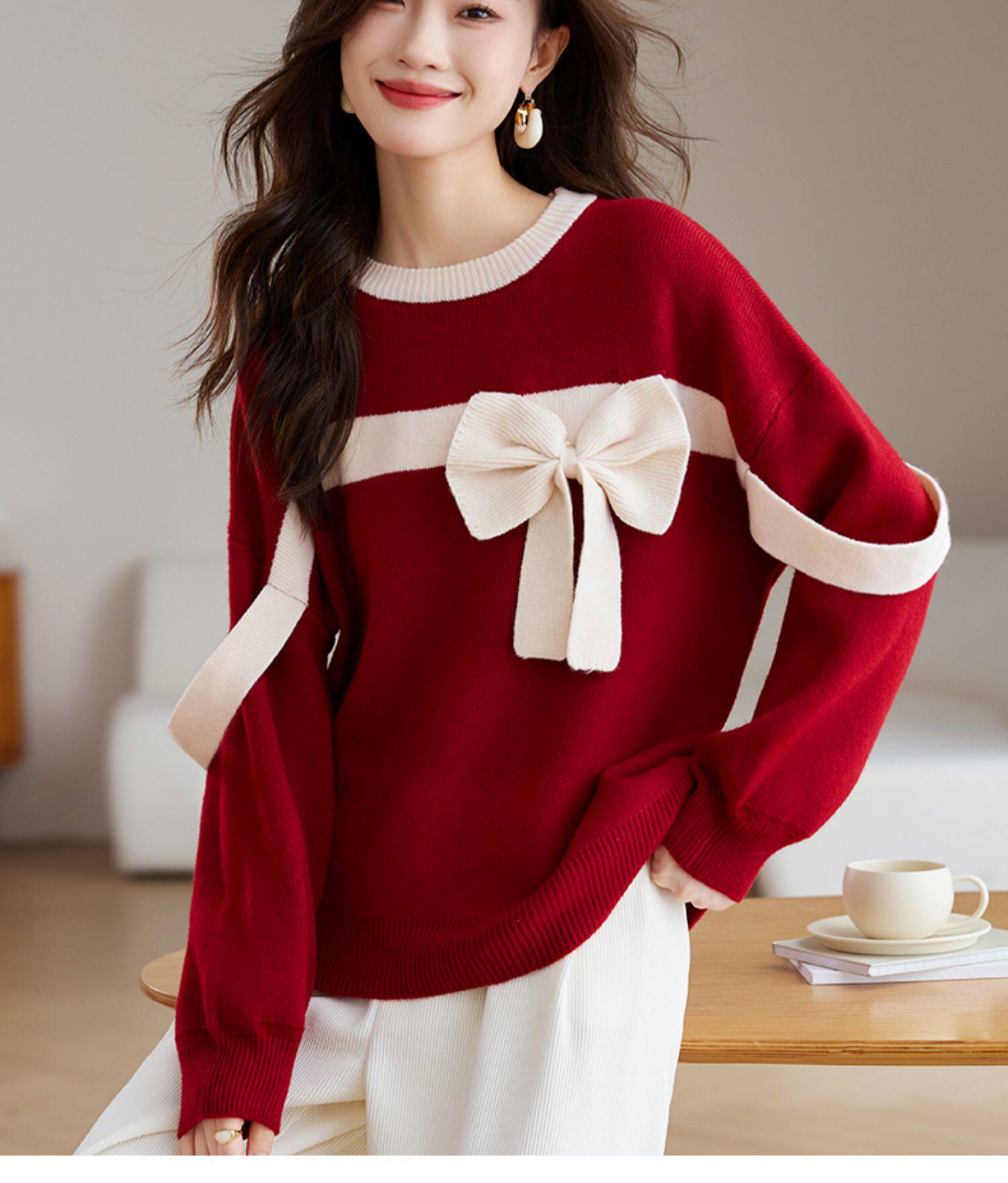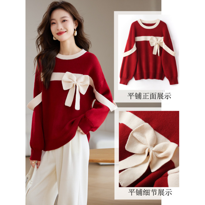 2025冬季新年聖誕紅別致蝴蝶結慵懶風毛衣圓領減齡軟糯小衆上衣女