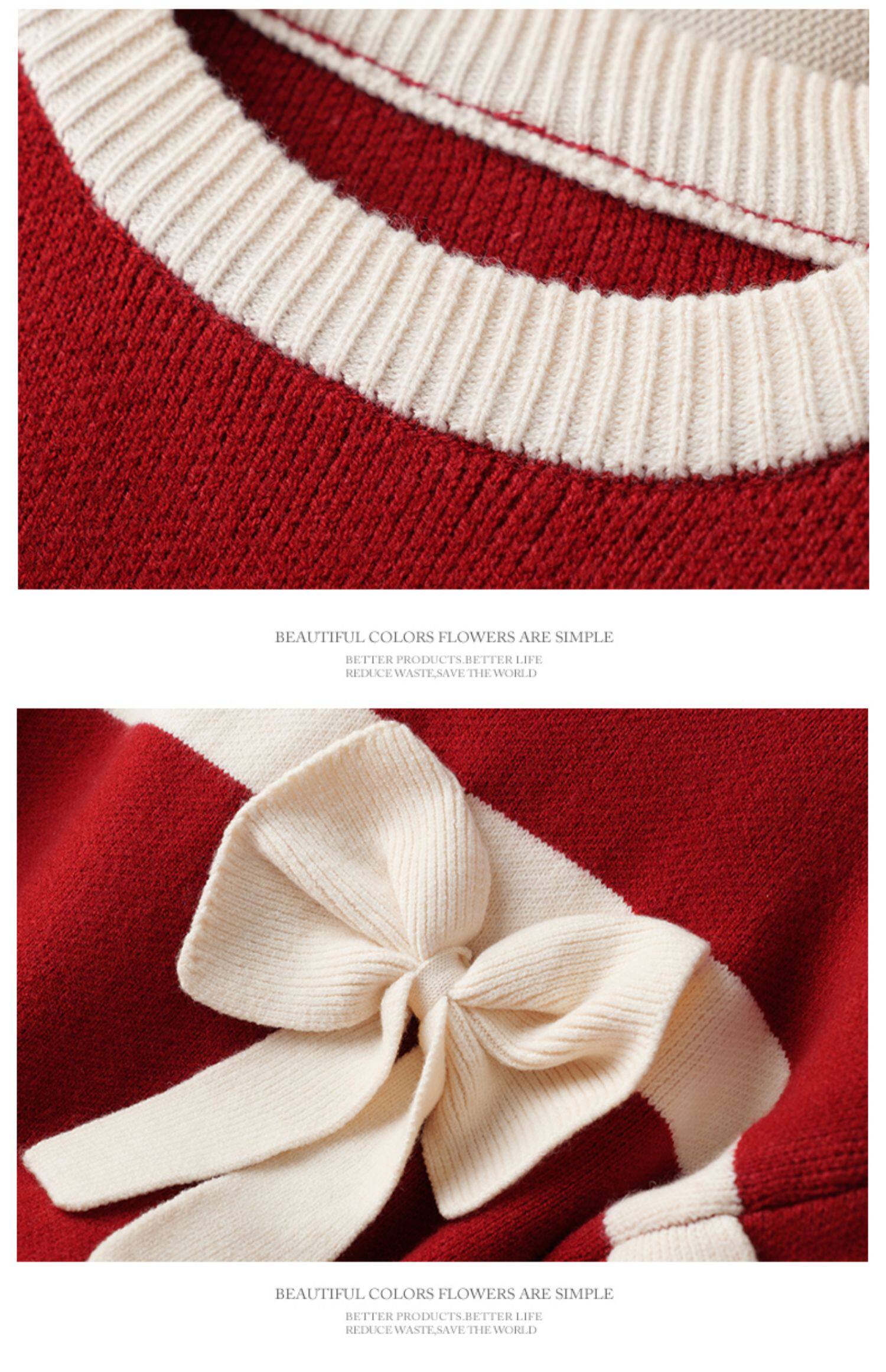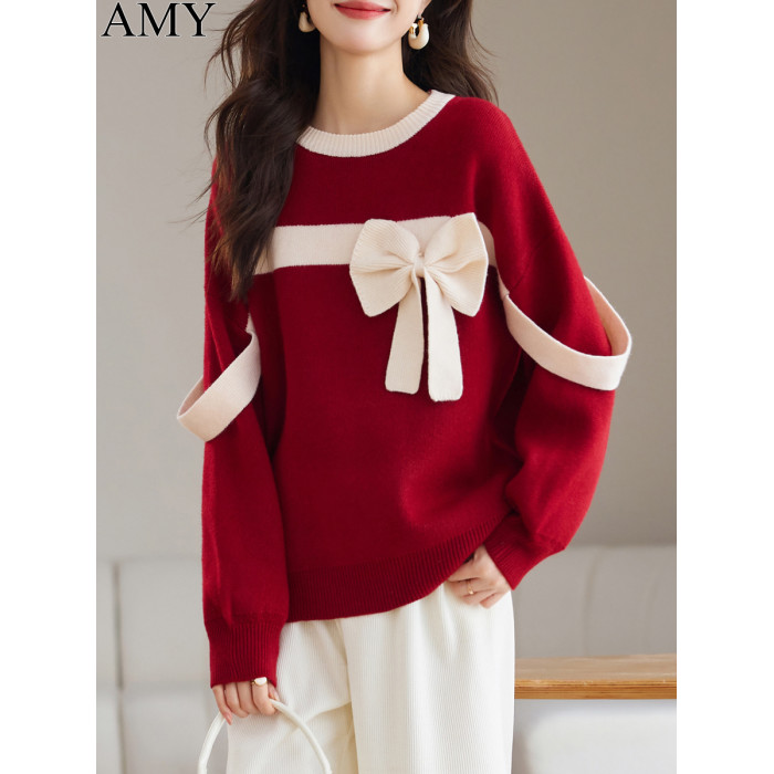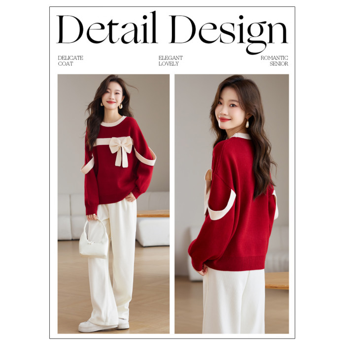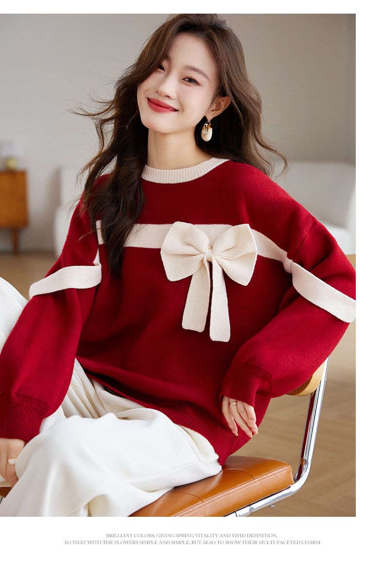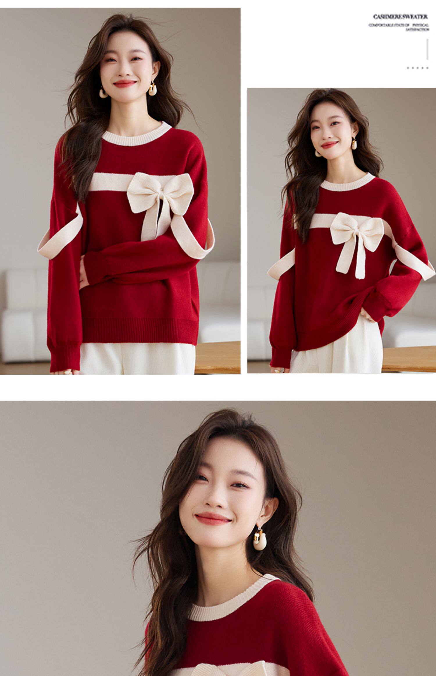 2025冬季新年聖誕紅別致蝴蝶結慵懶風毛衣圓領減齡軟糯小衆上衣女