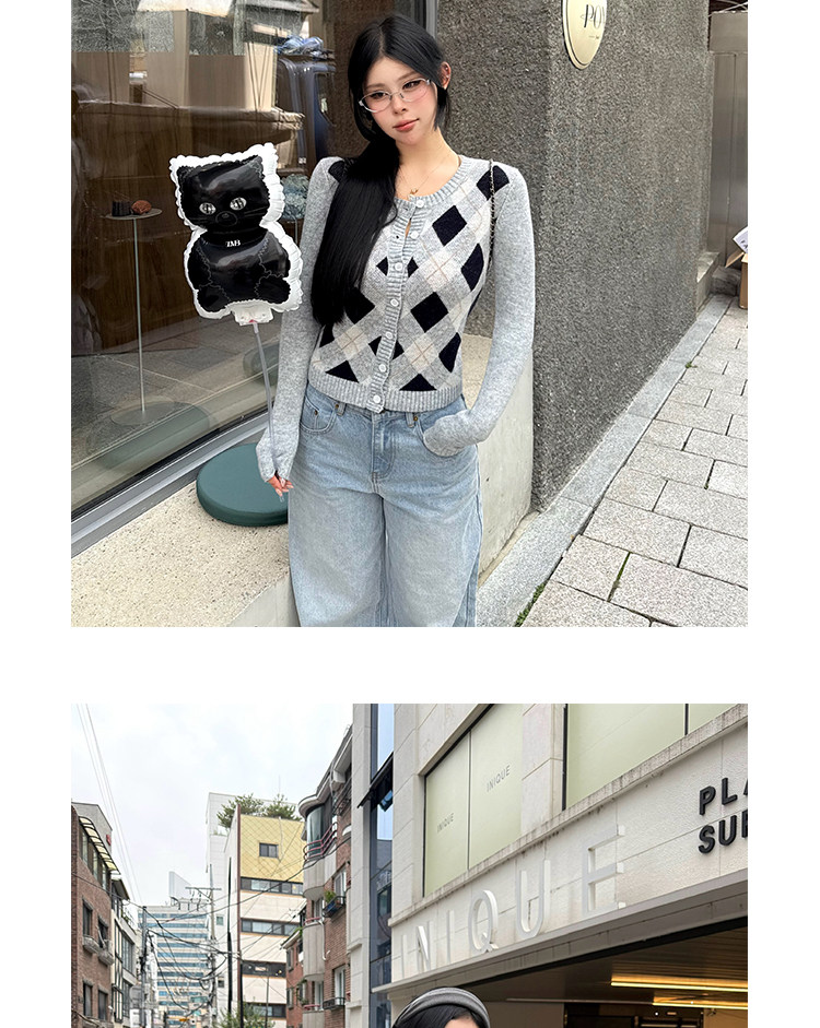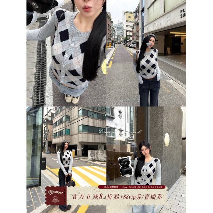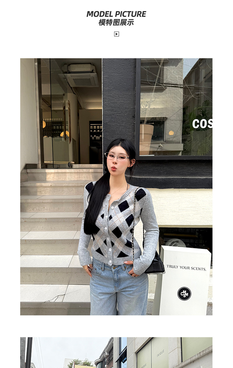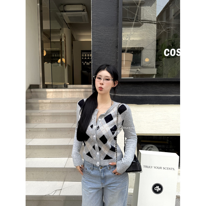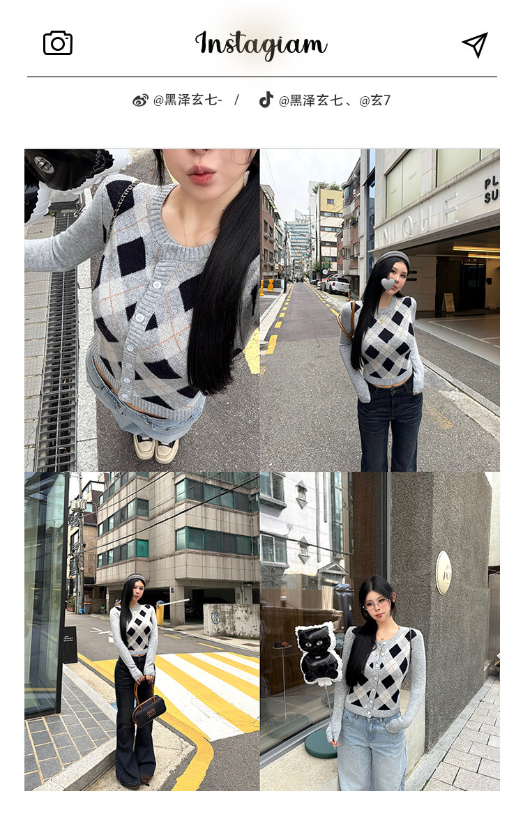 黑澤玄七2025秋季新款微胖長袖毛衣女菱形格提花修身短款開衫外套