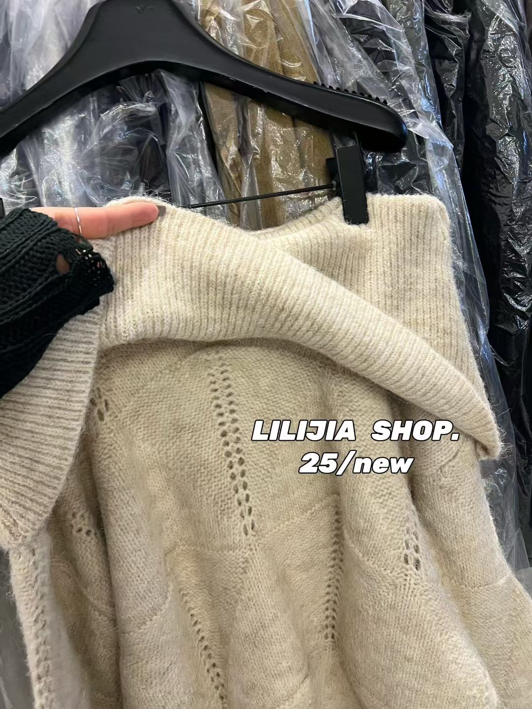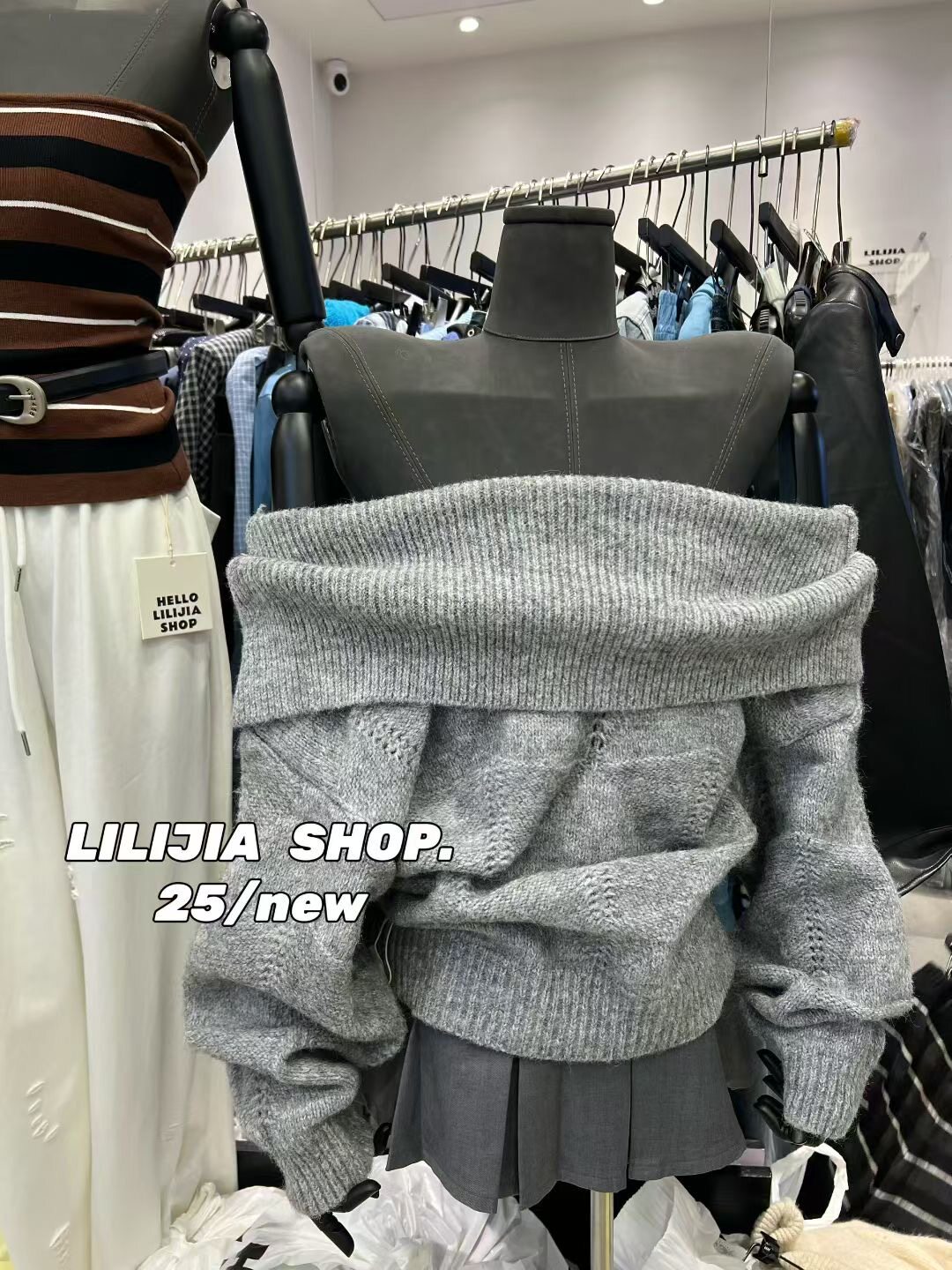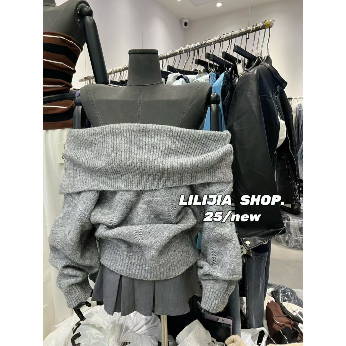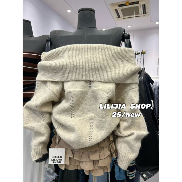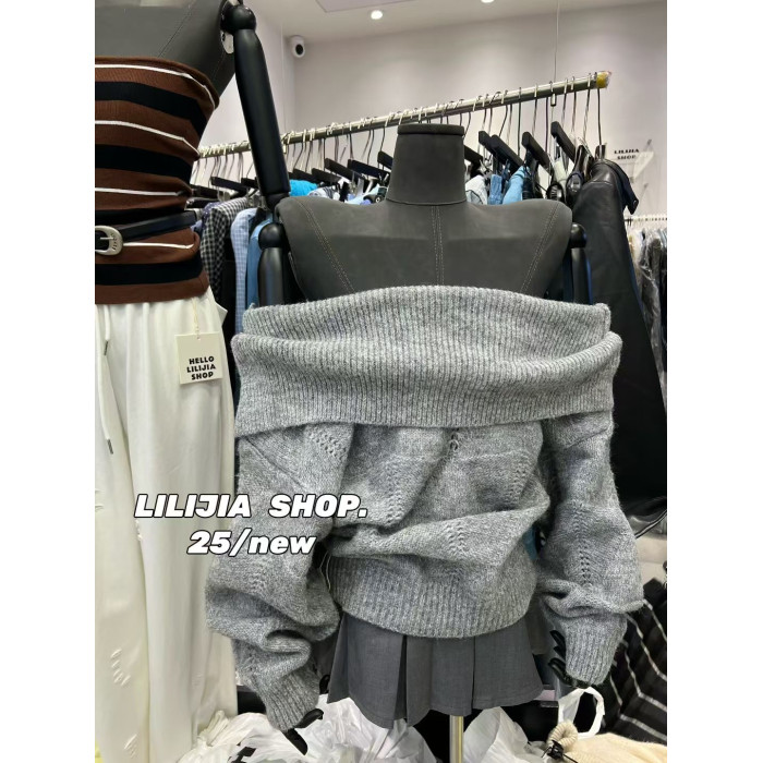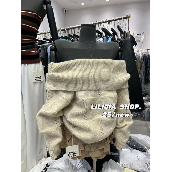 韓國東大門秋季新款韓版時尚一字肩長袖針織衫女慵懶風寬松毛衣潮