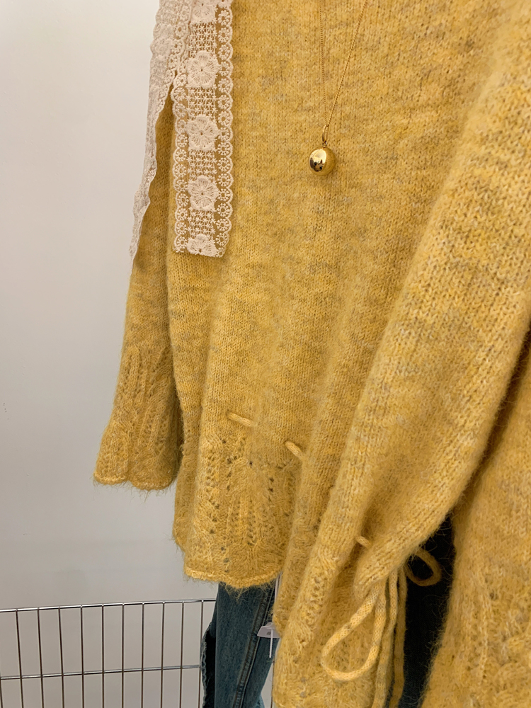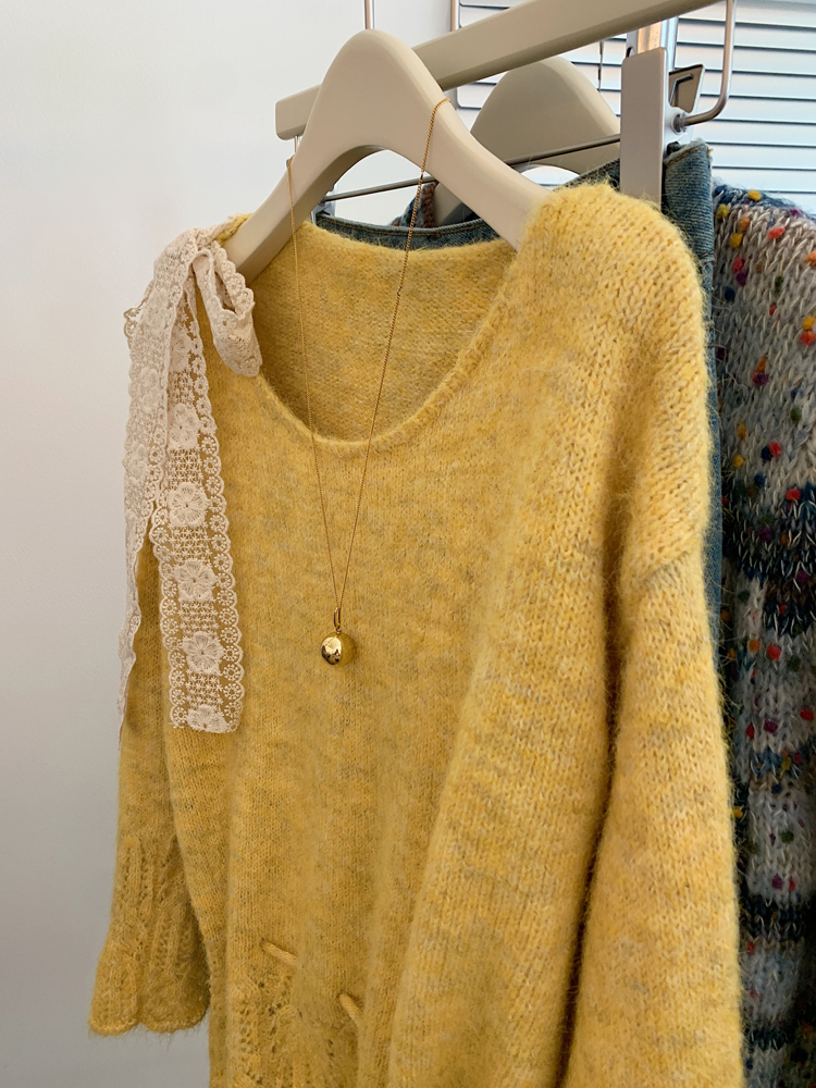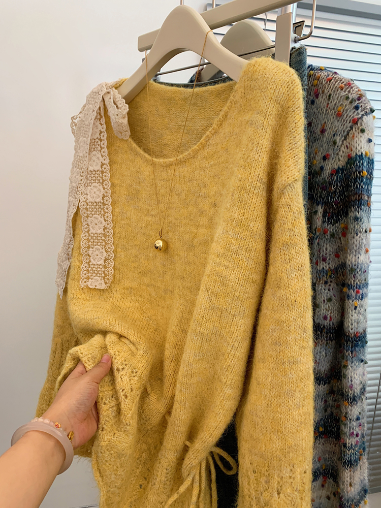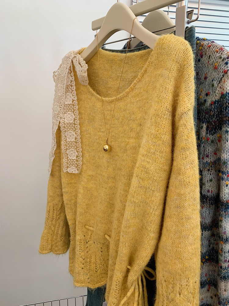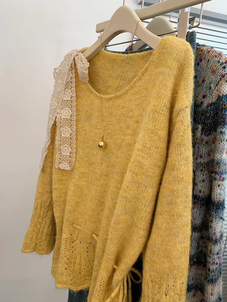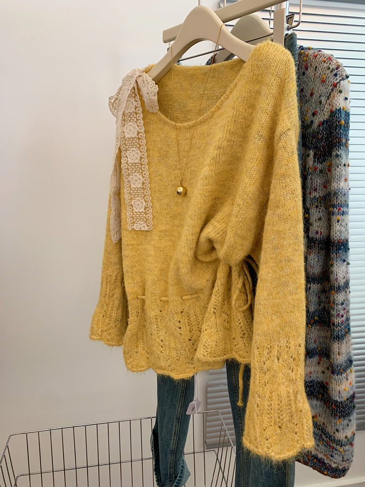 蕾絲蝴蝶結綁帶黃色鏤空長袖毛衣女2025新款設計感針織衫溫柔上衣