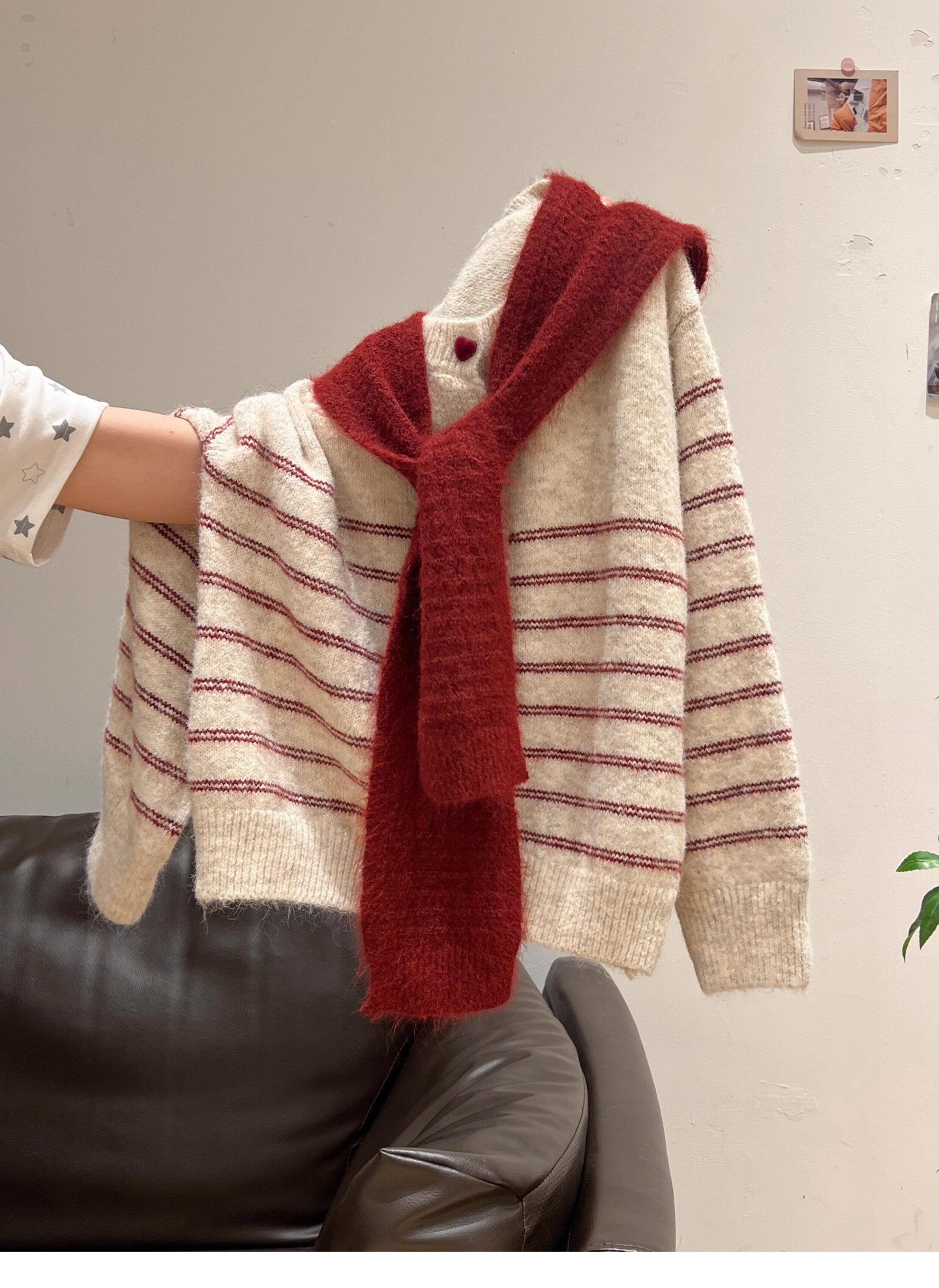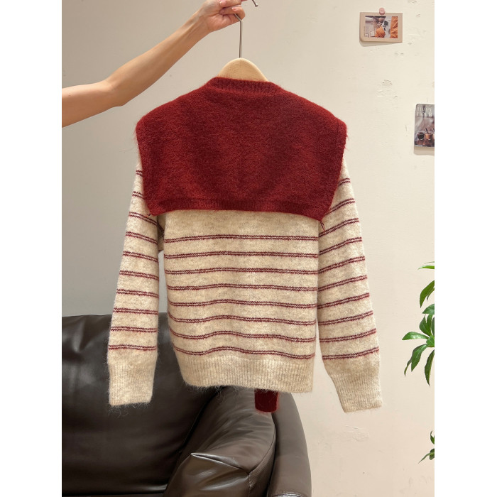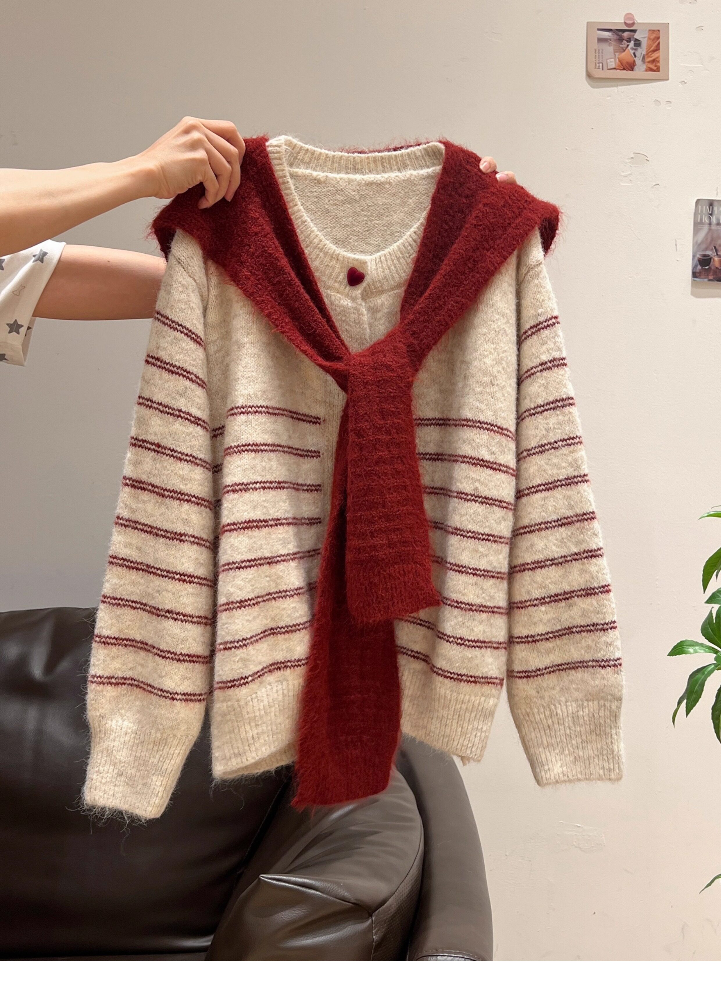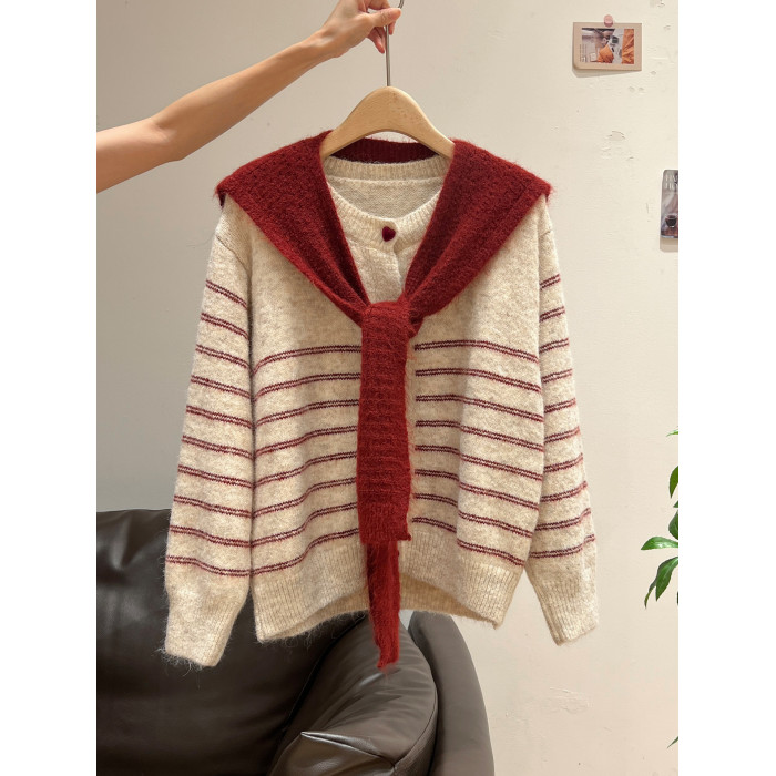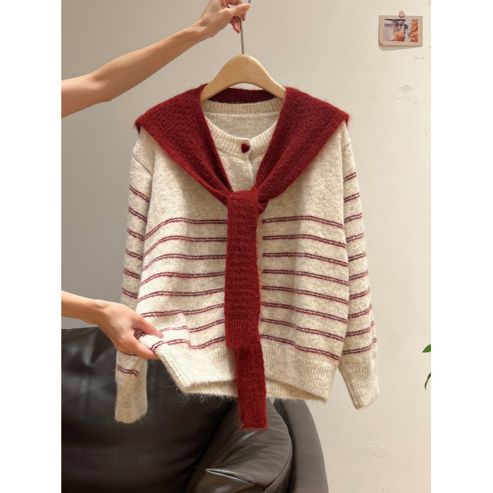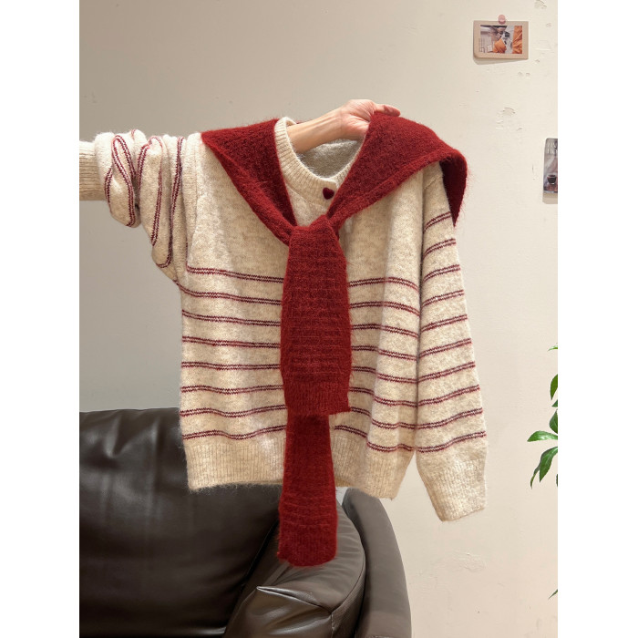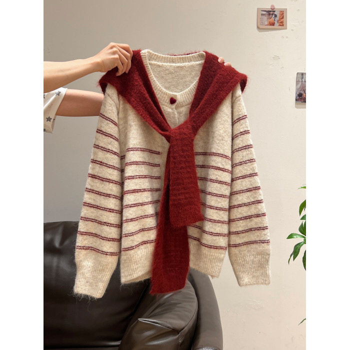 紅色披肩圓領條紋針織毛衣加厚長袖秋冬慵懶開衫外套上衣兩件套女