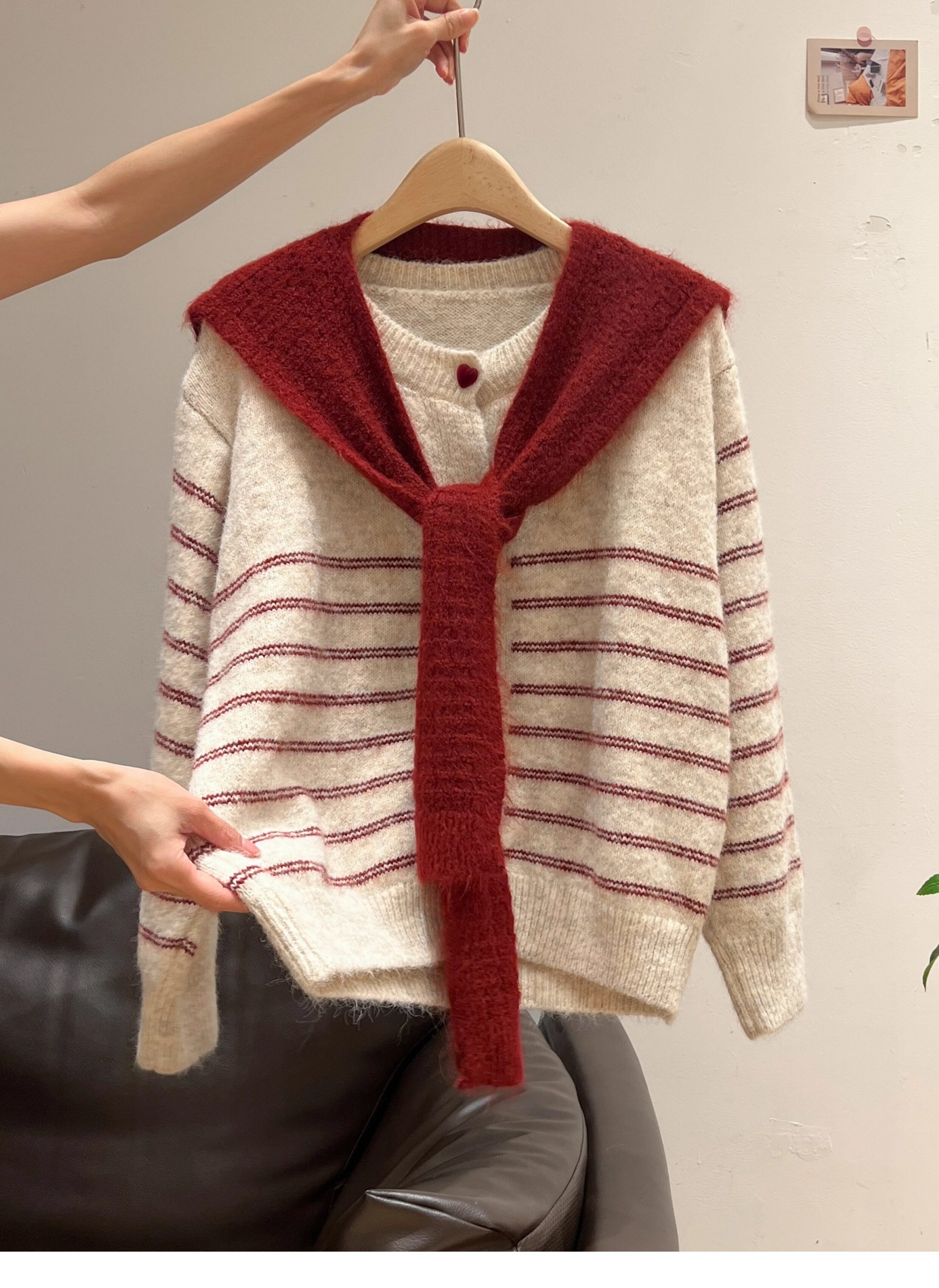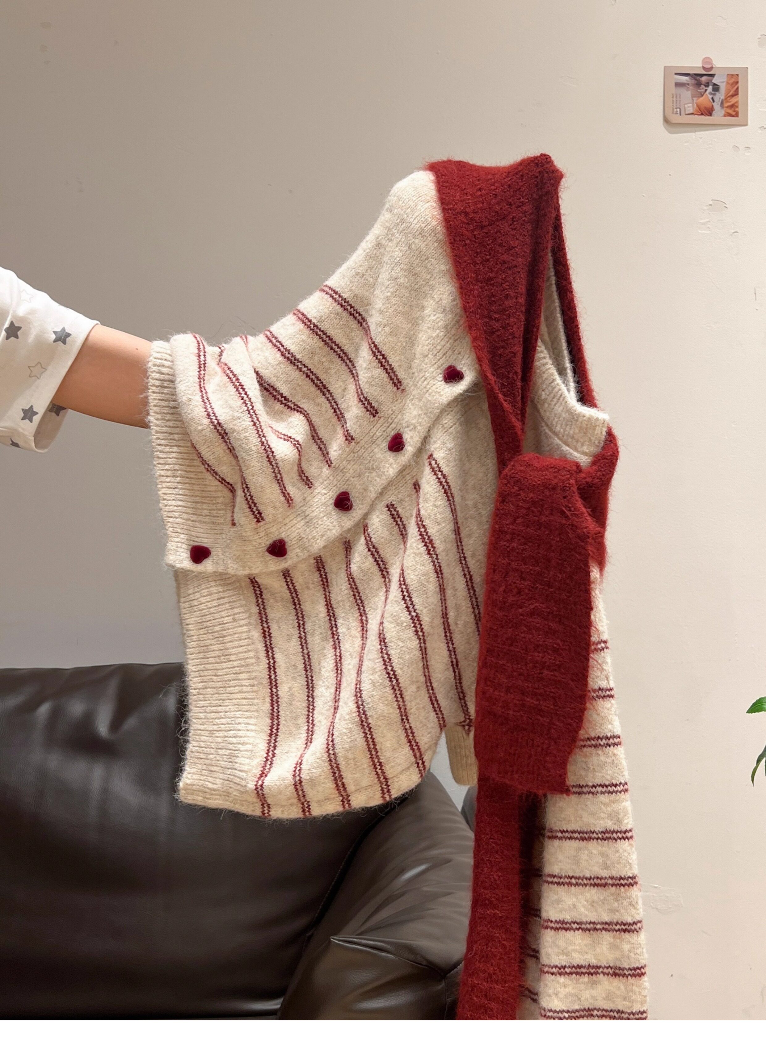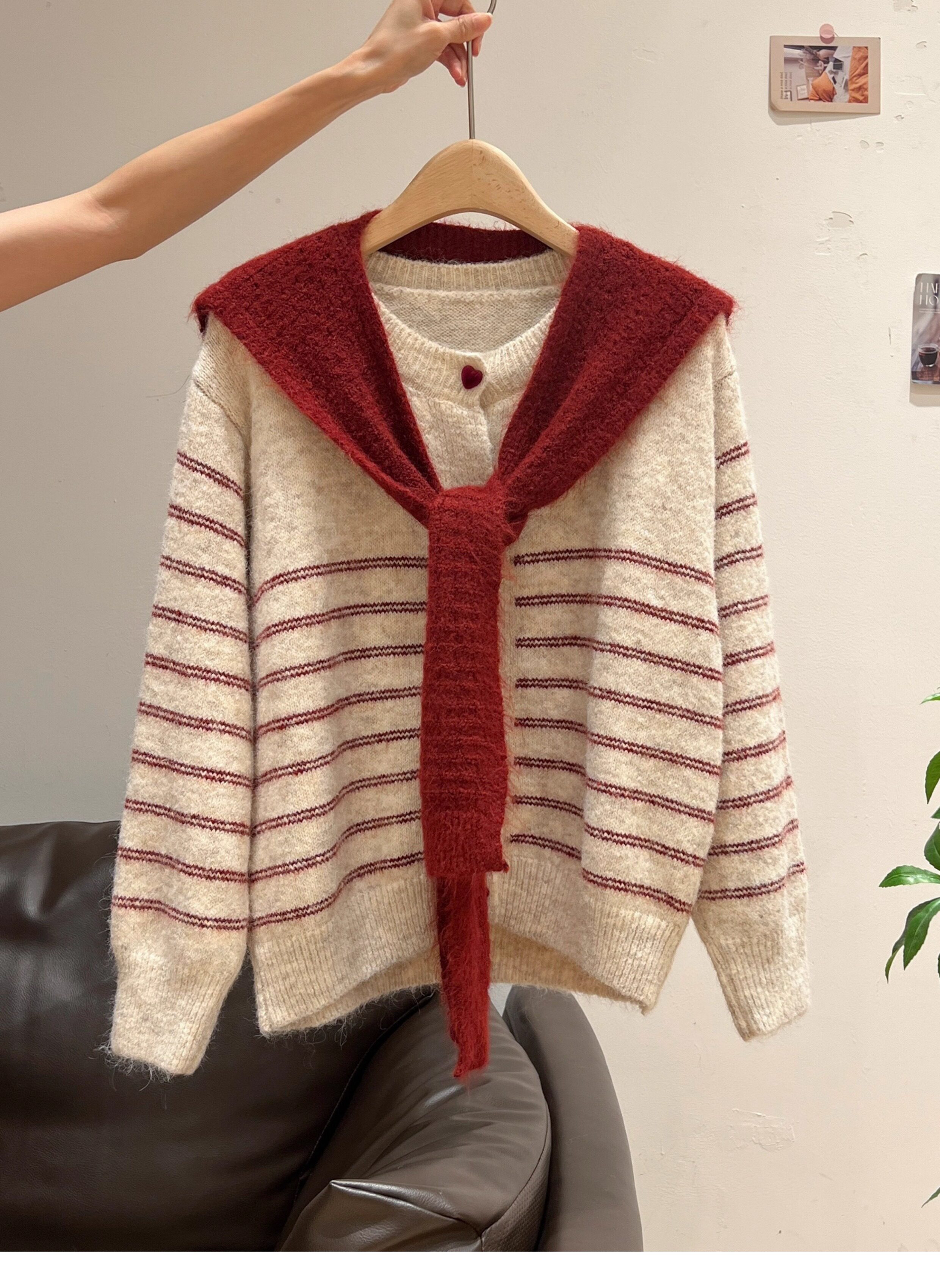 紅色披肩圓領條紋針織毛衣加厚長袖秋冬慵懶開衫外套上衣兩件套女