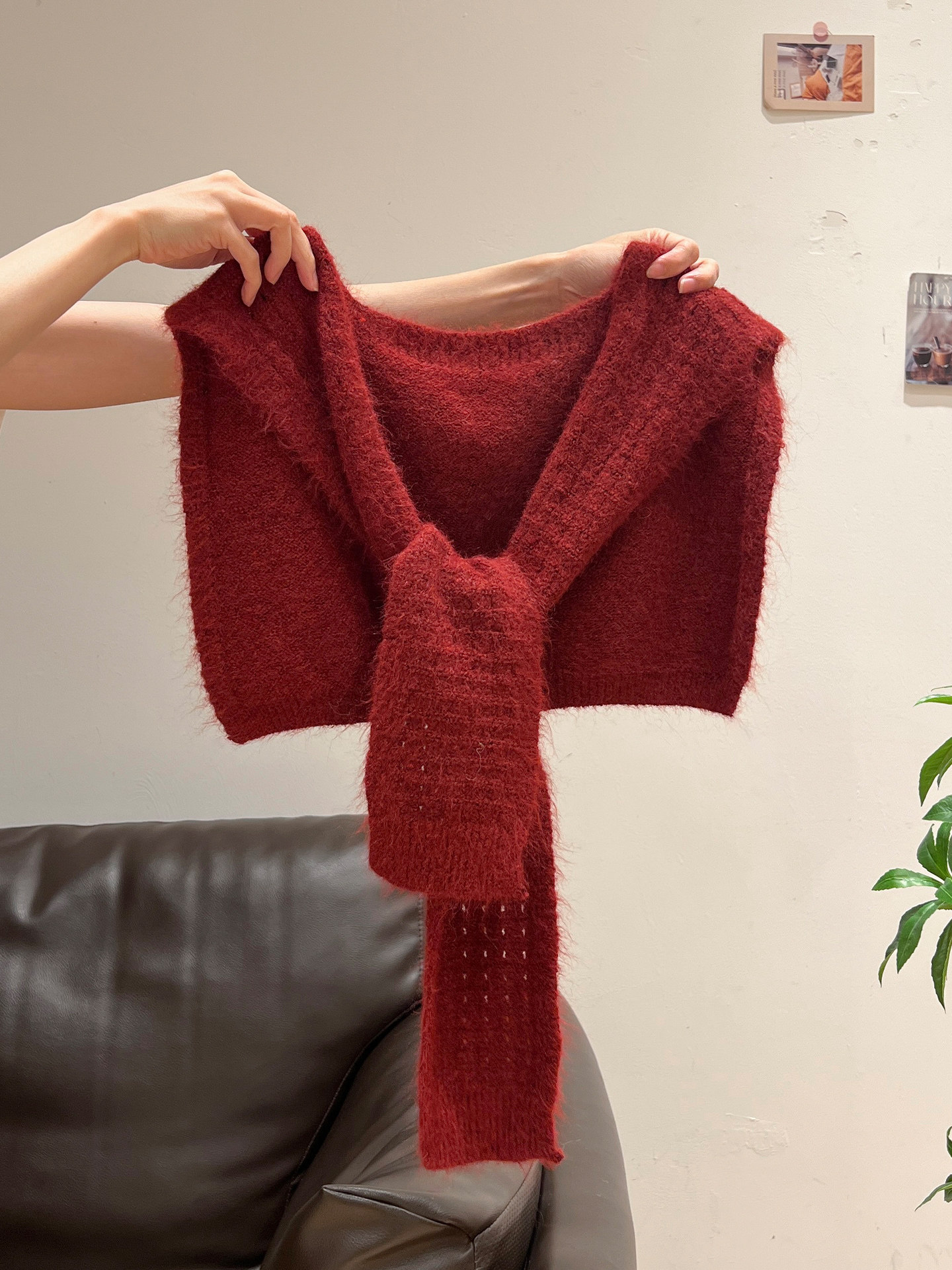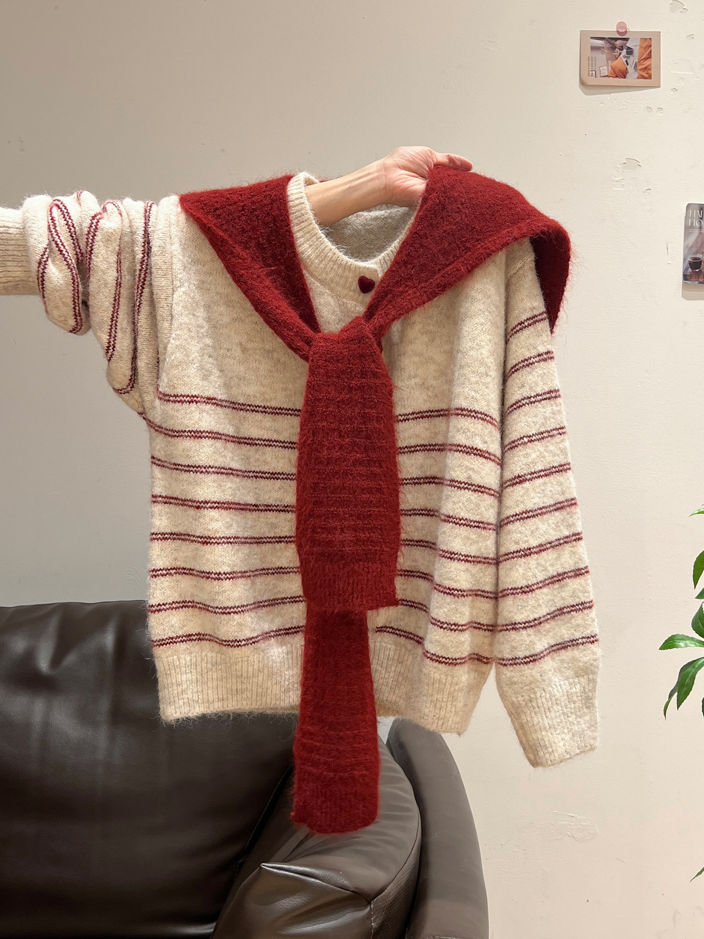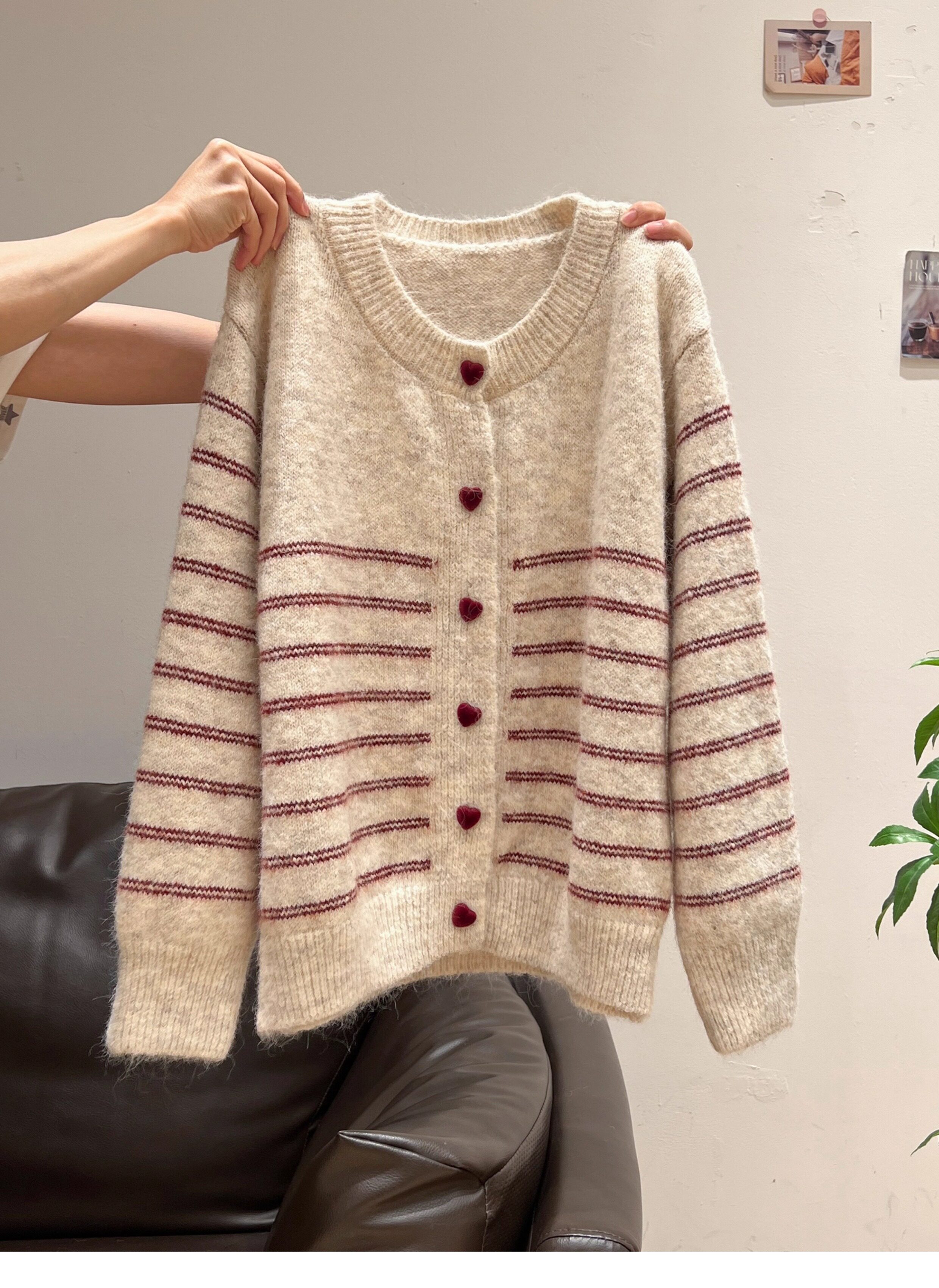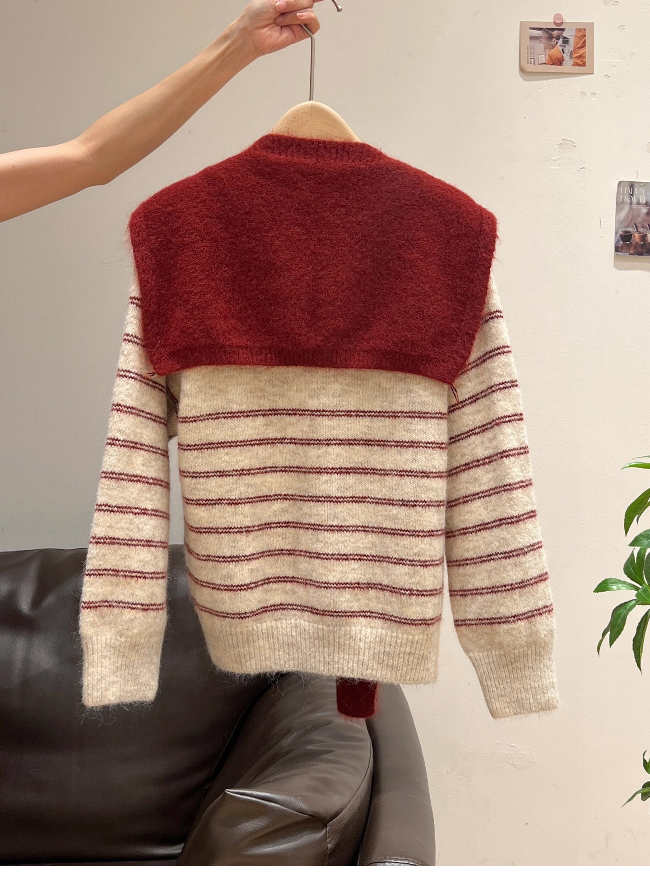 紅色披肩圓領條紋針織毛衣加厚長袖秋冬慵懶開衫外套上衣兩件套女