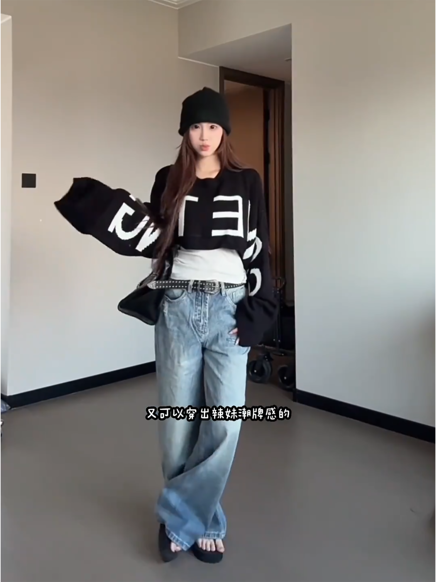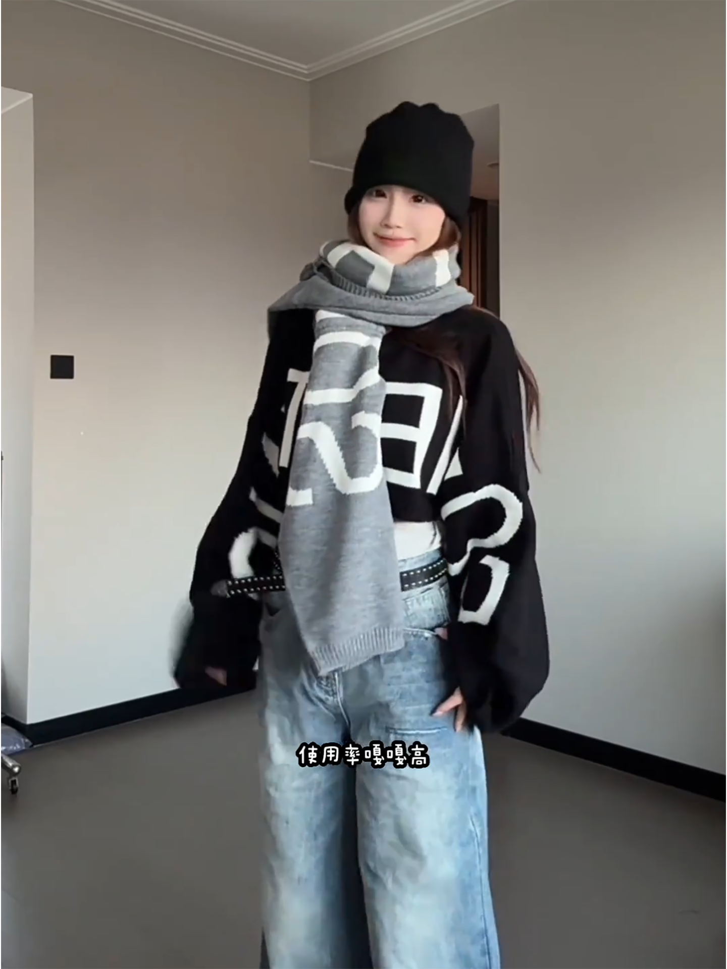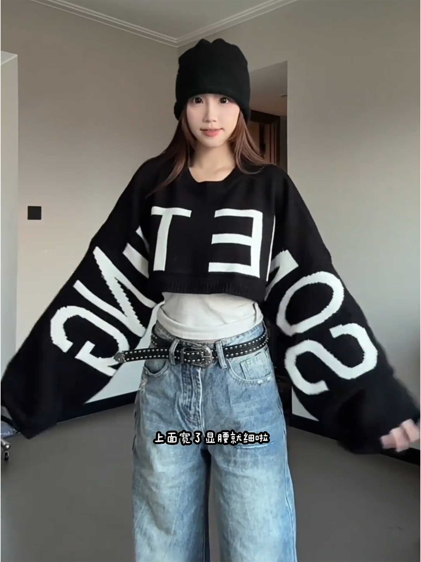 美式復古超大袖子印花休閒短款毛衣女秋冬季小衆設計辣妹針織上衣