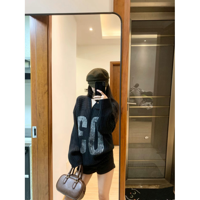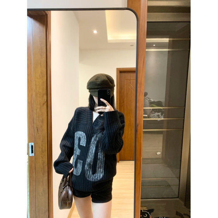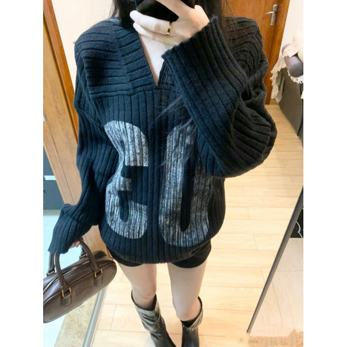 數字印花V領針織衫女秋冬季美式復古寬松休閒設計感黑色露肩毛衣