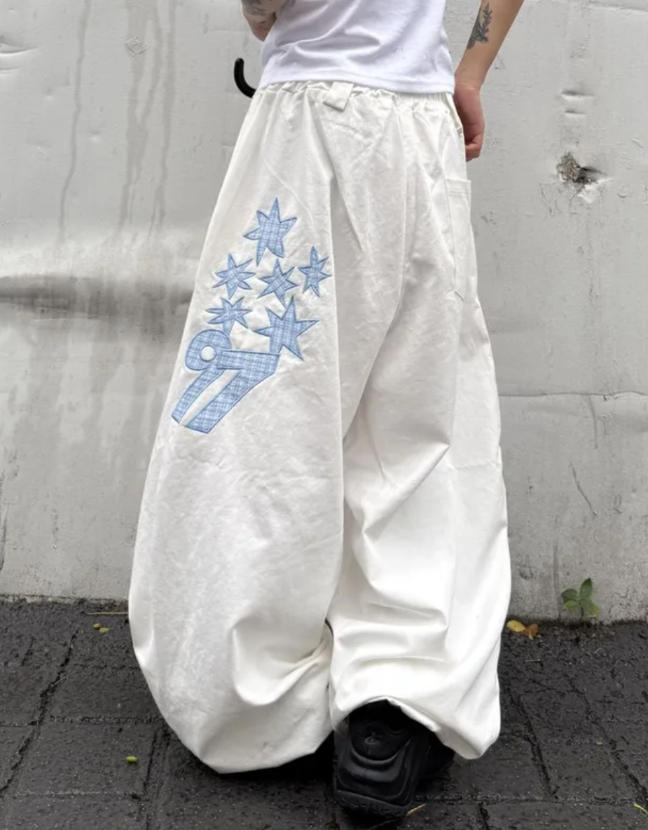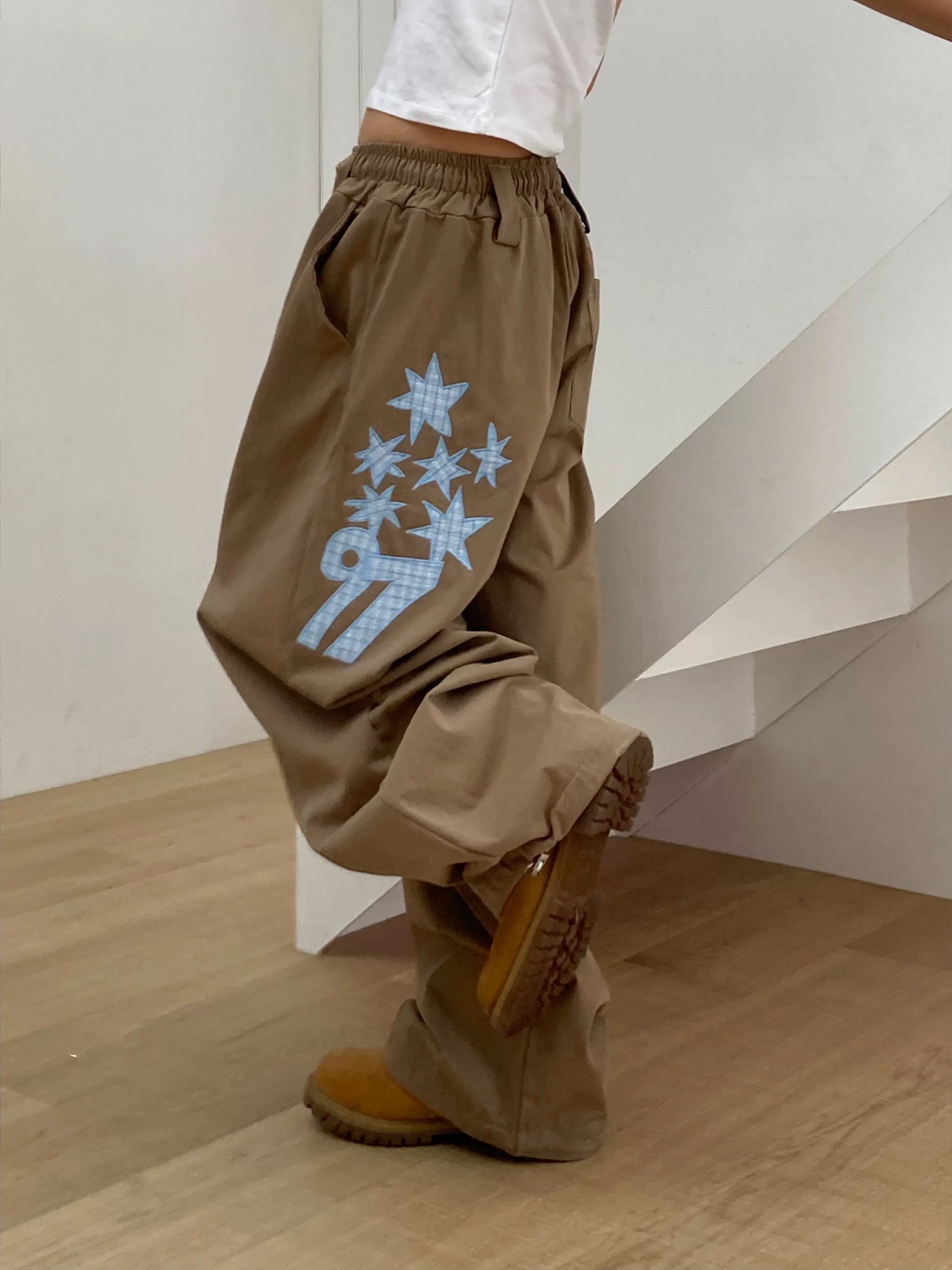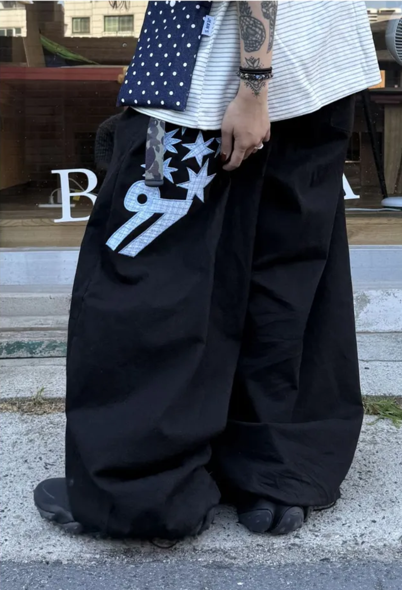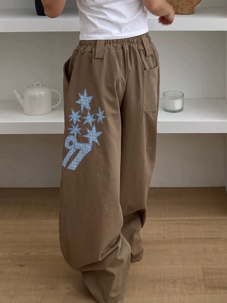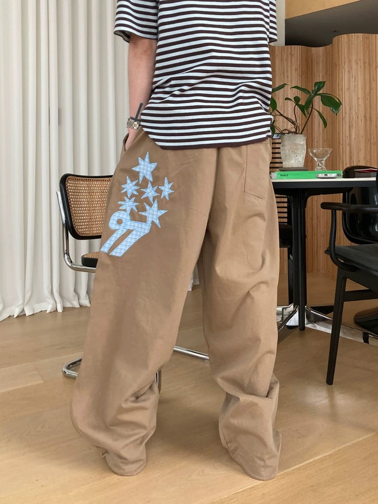 韓國五角星貼布刺綉厚斜紋帆布寬松濶腿褲彎刀褲長褲