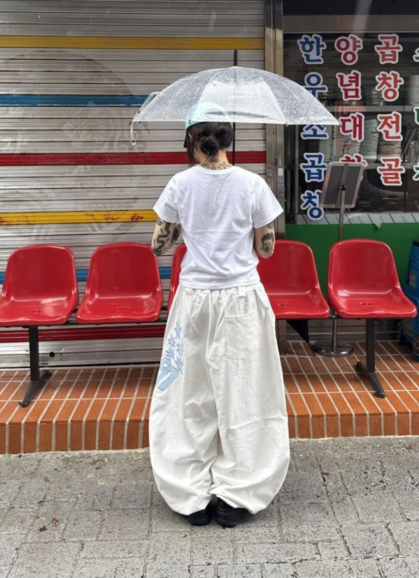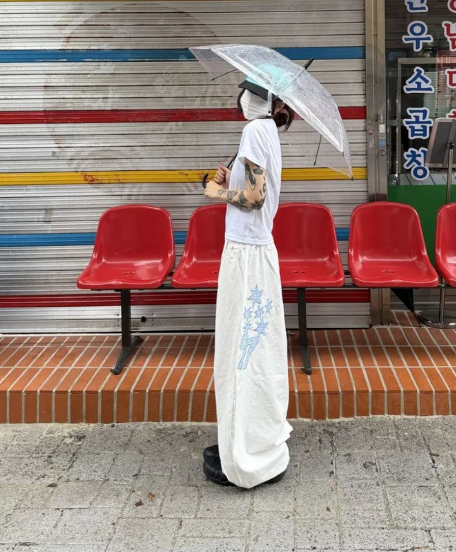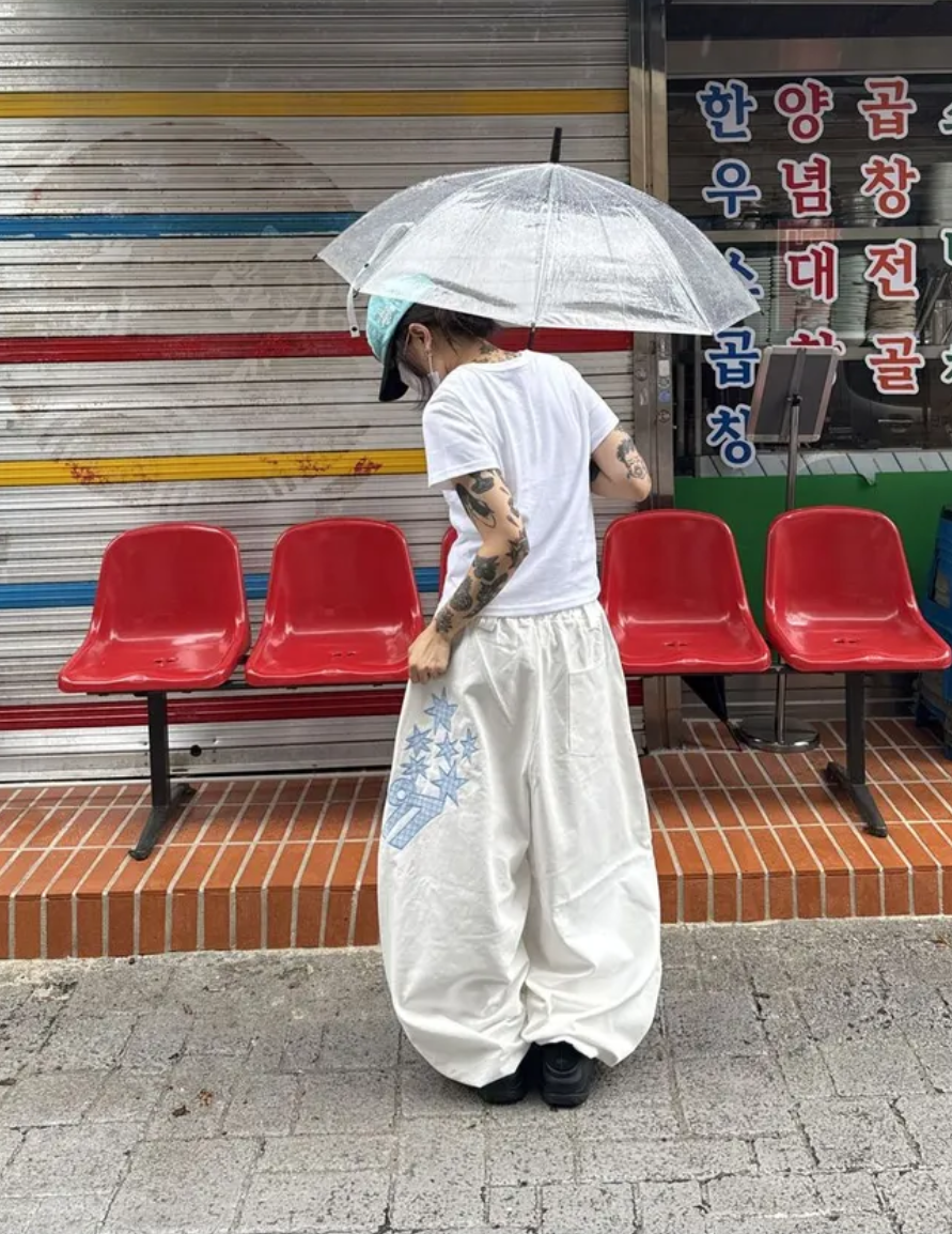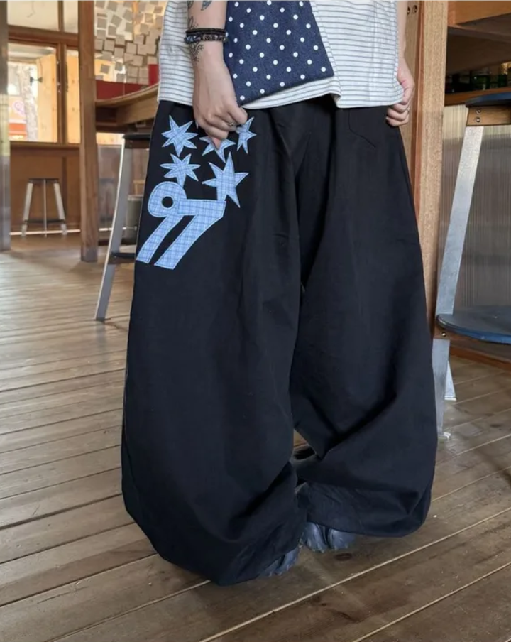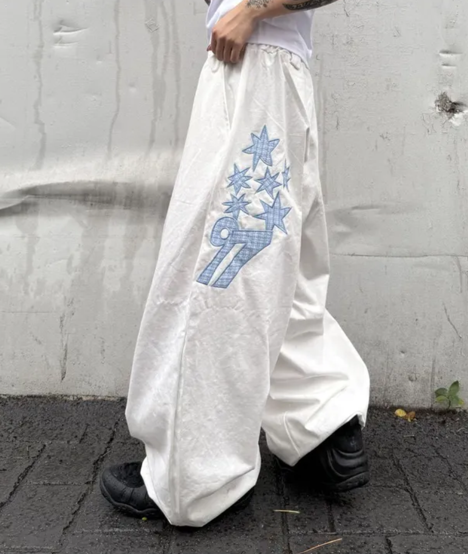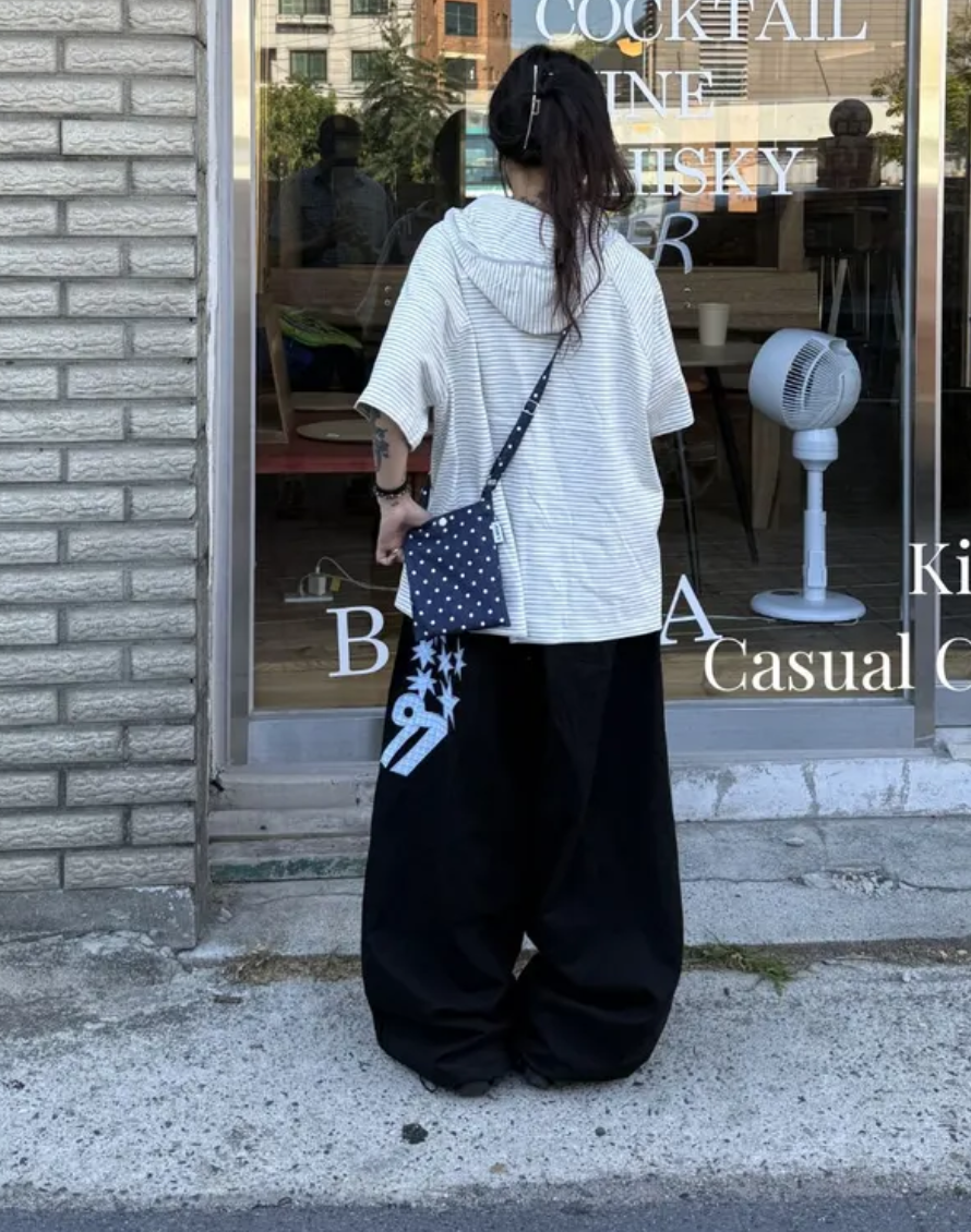 韓國五角星貼布刺綉厚斜紋帆布寬松濶腿褲彎刀褲長褲