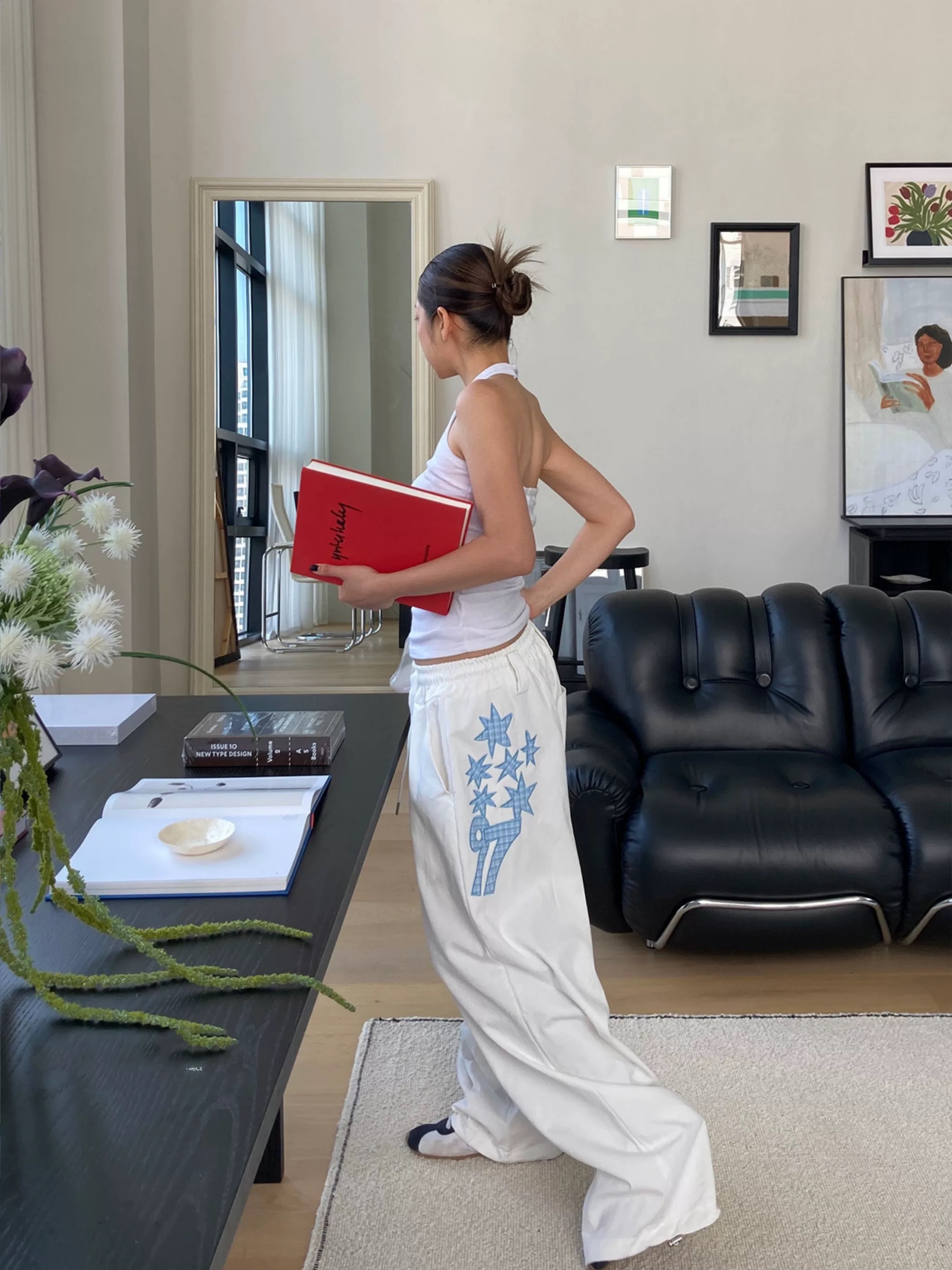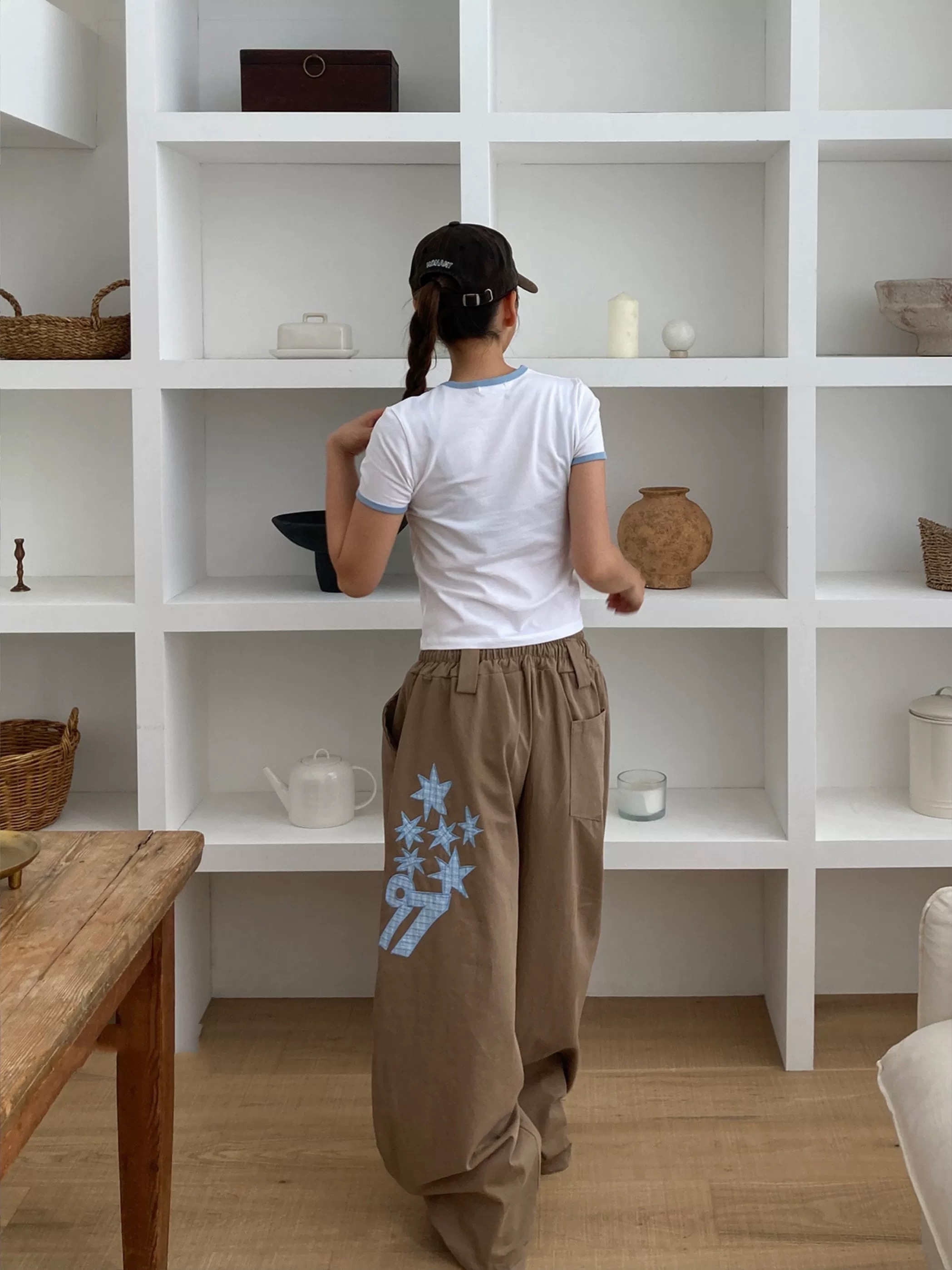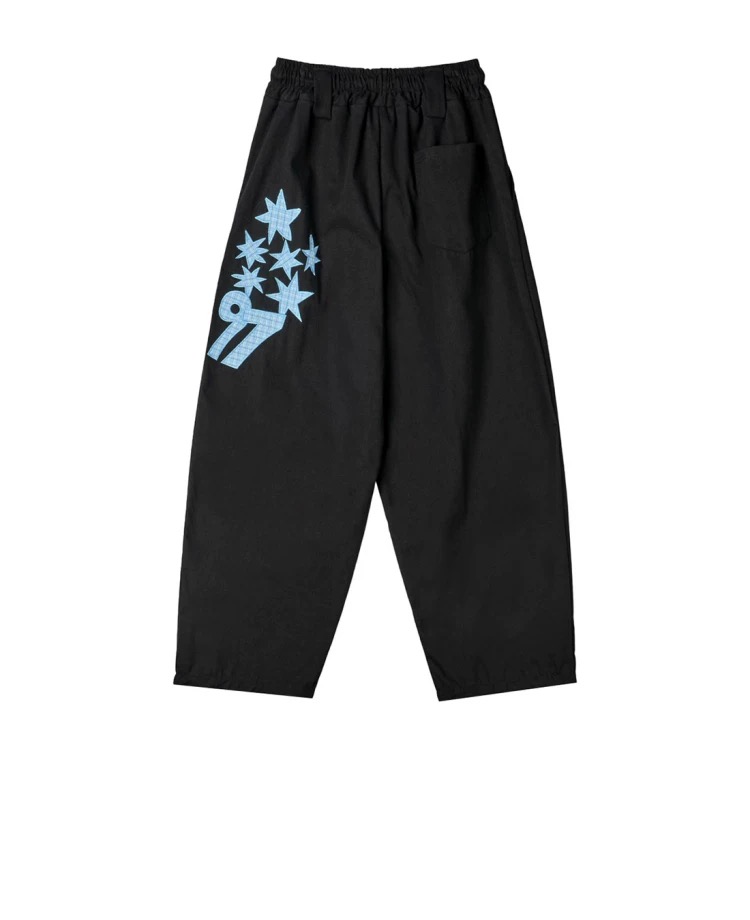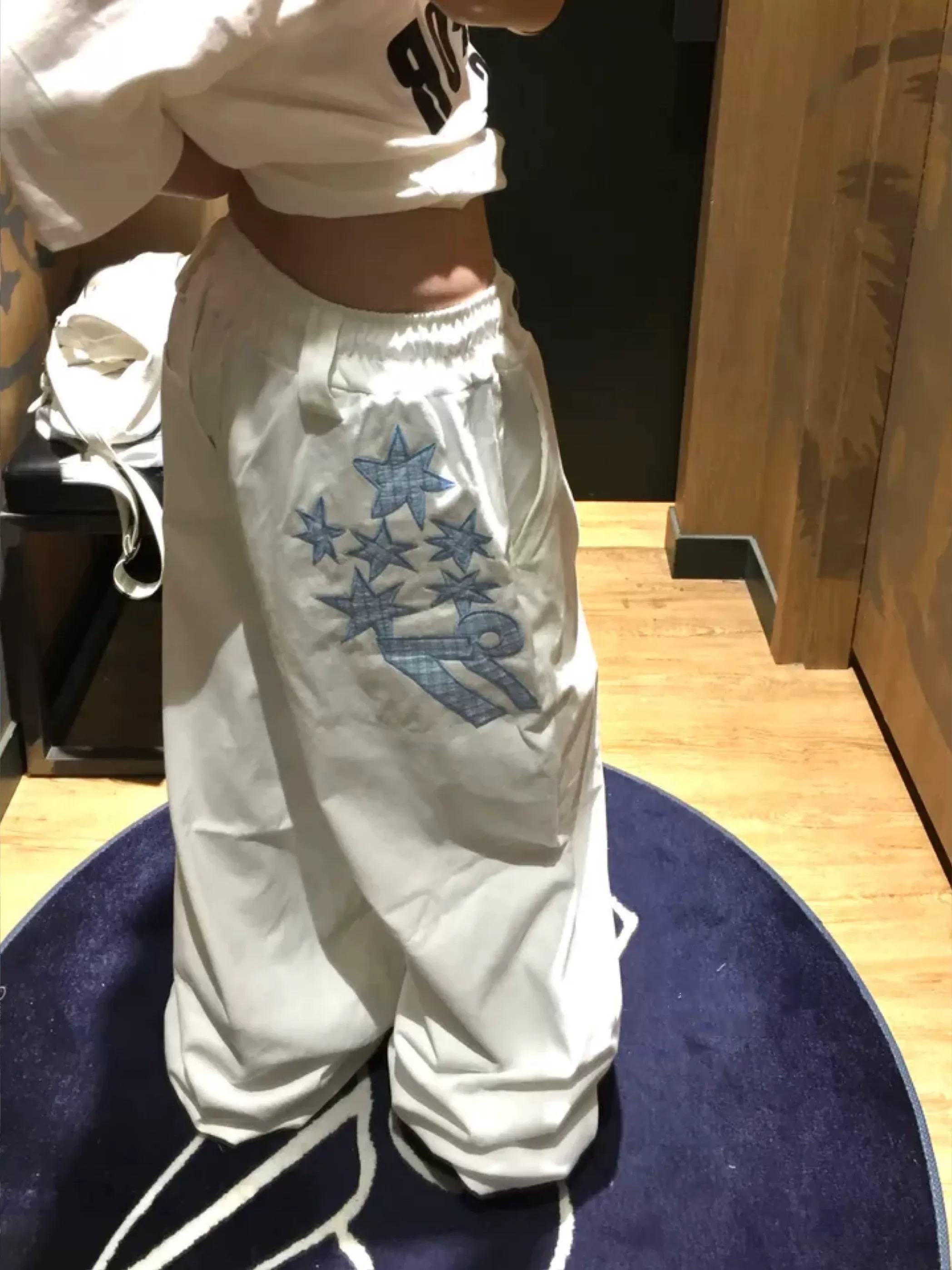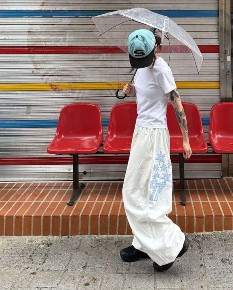 韓國五角星貼布刺綉厚斜紋帆布寬松濶腿褲彎刀褲長褲