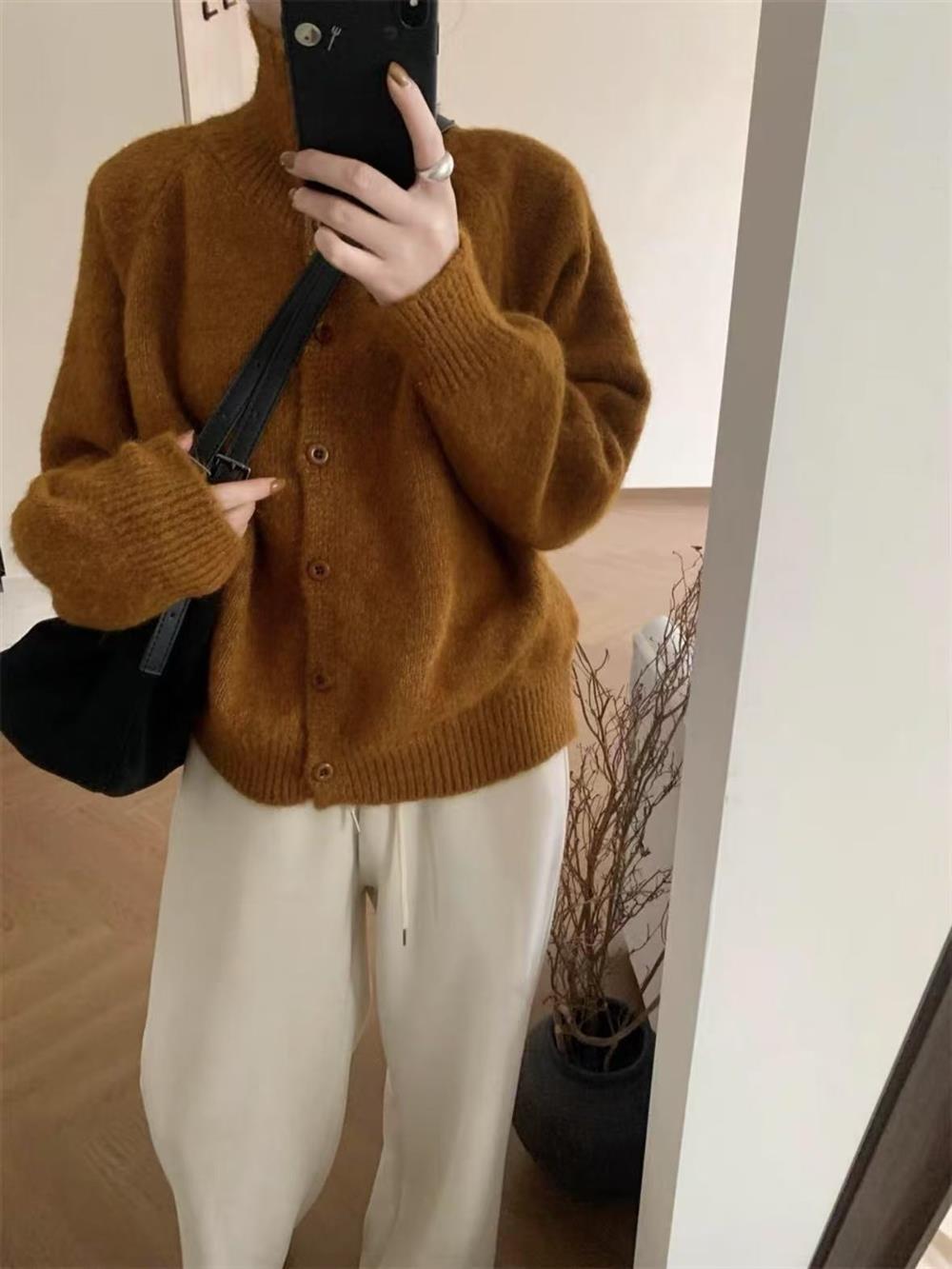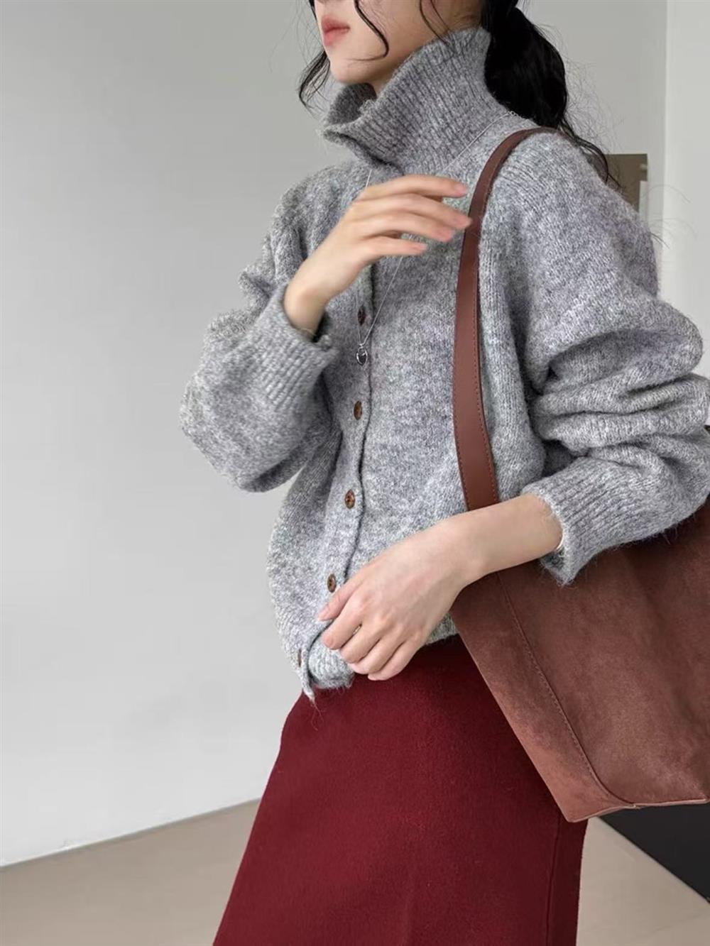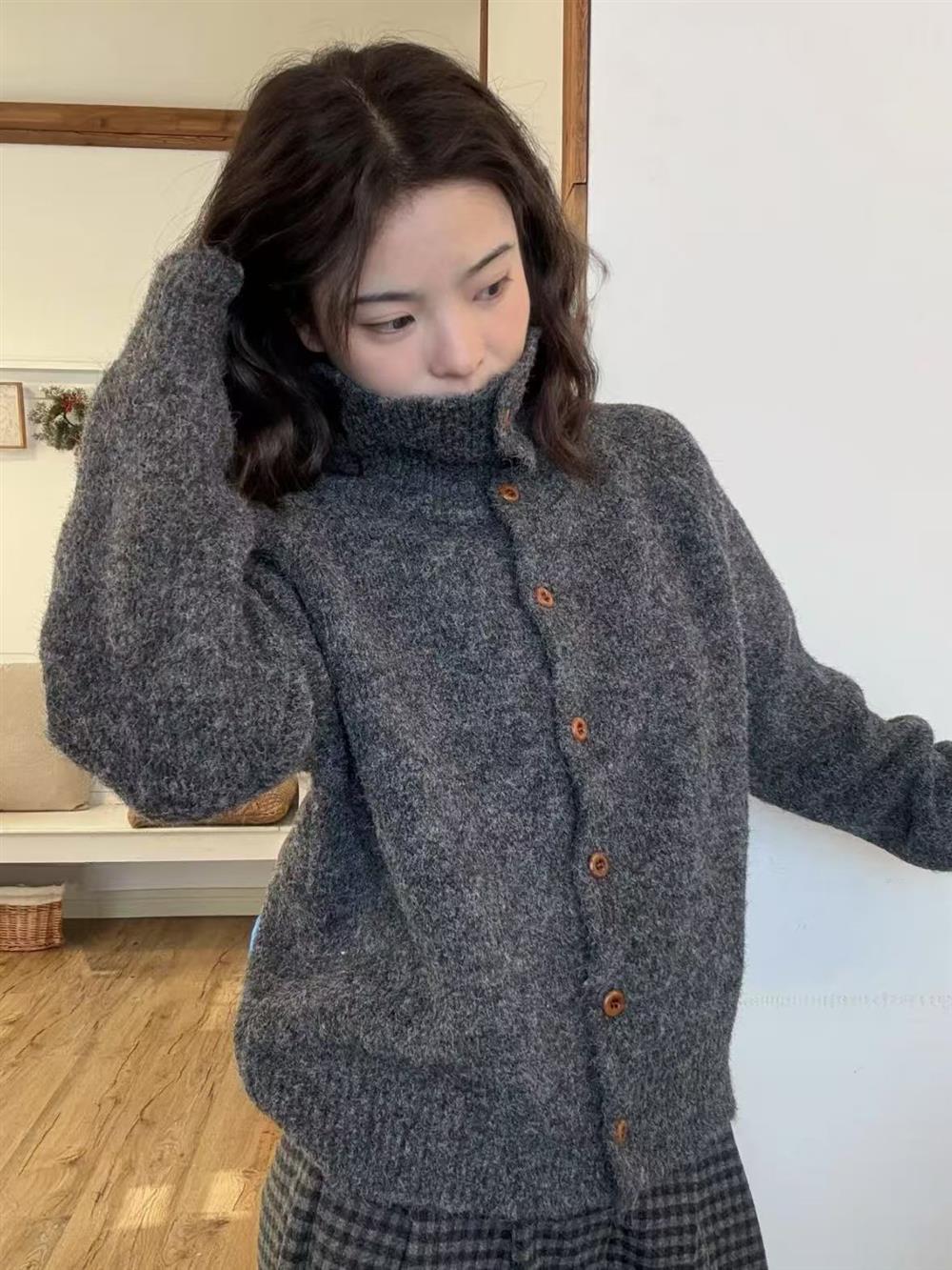 高級感立領針織開衫外套上衣女秋冬軟糯灰色內搭高領慵懶外穿毛衣