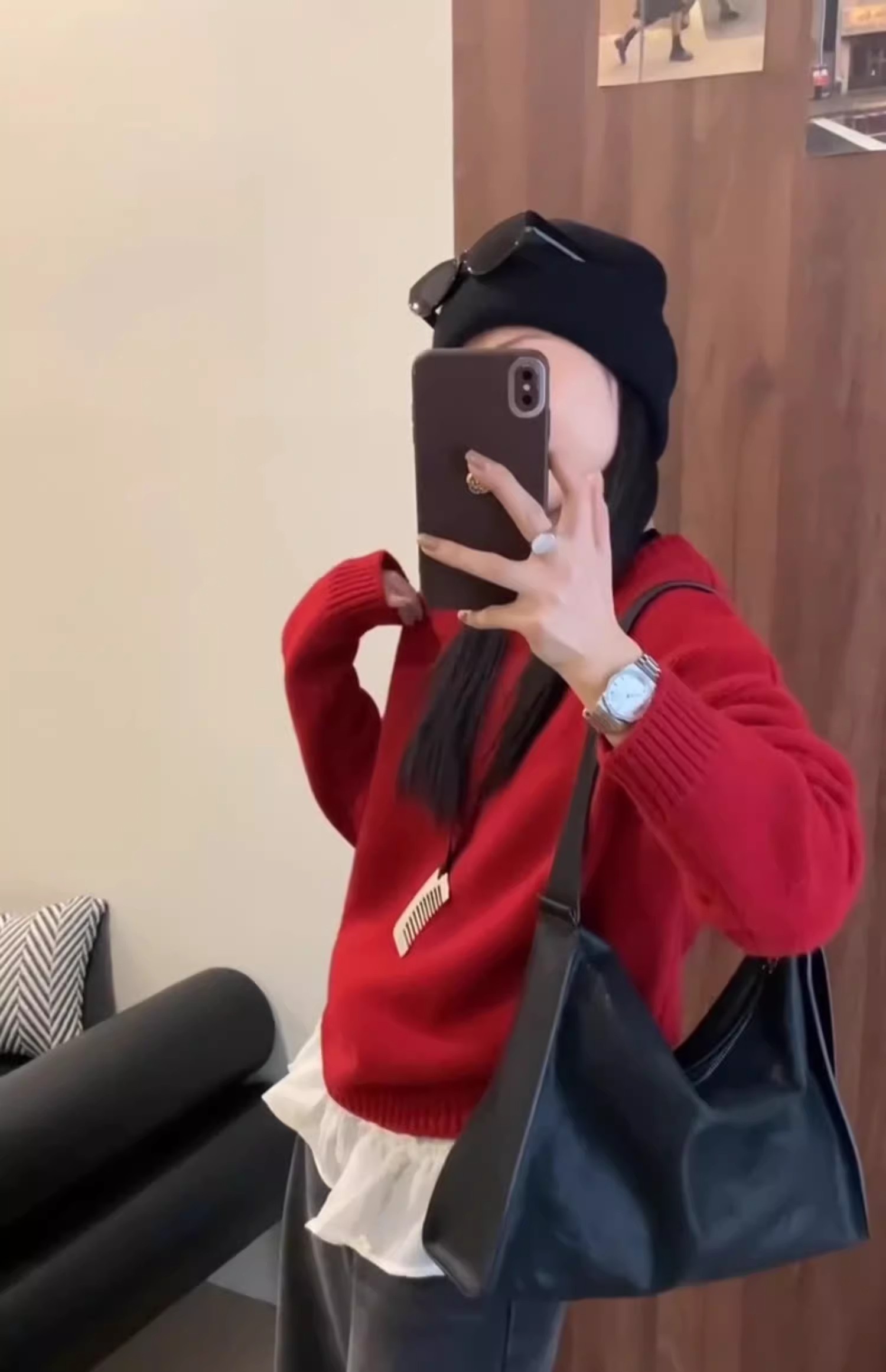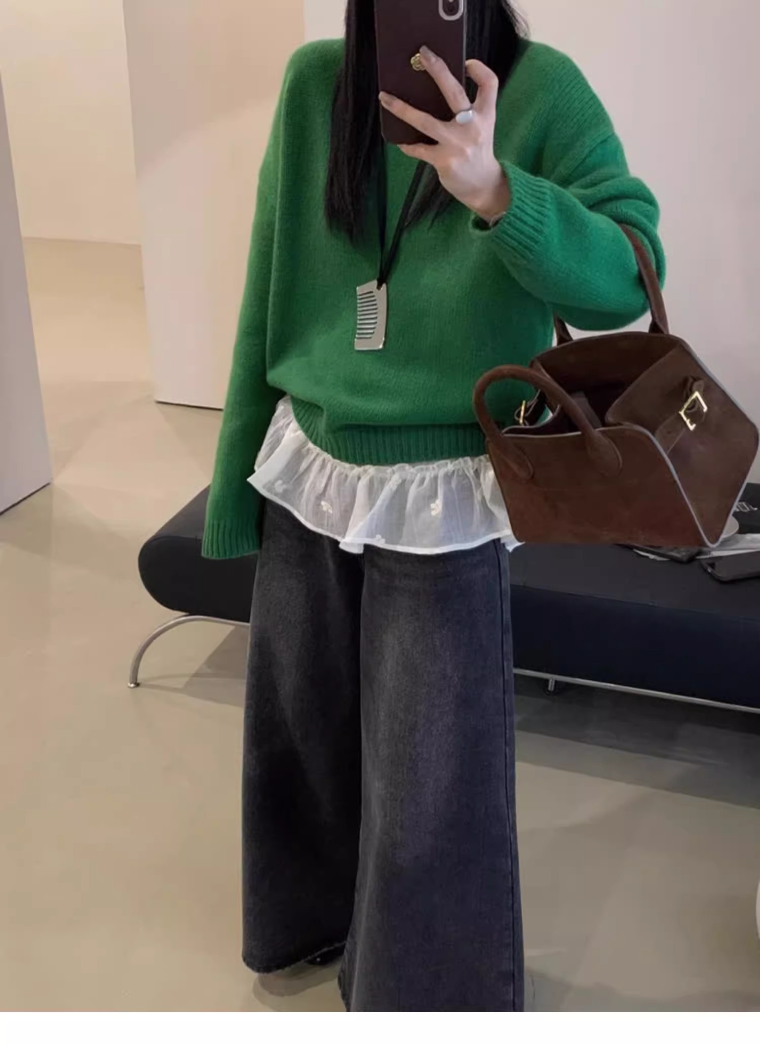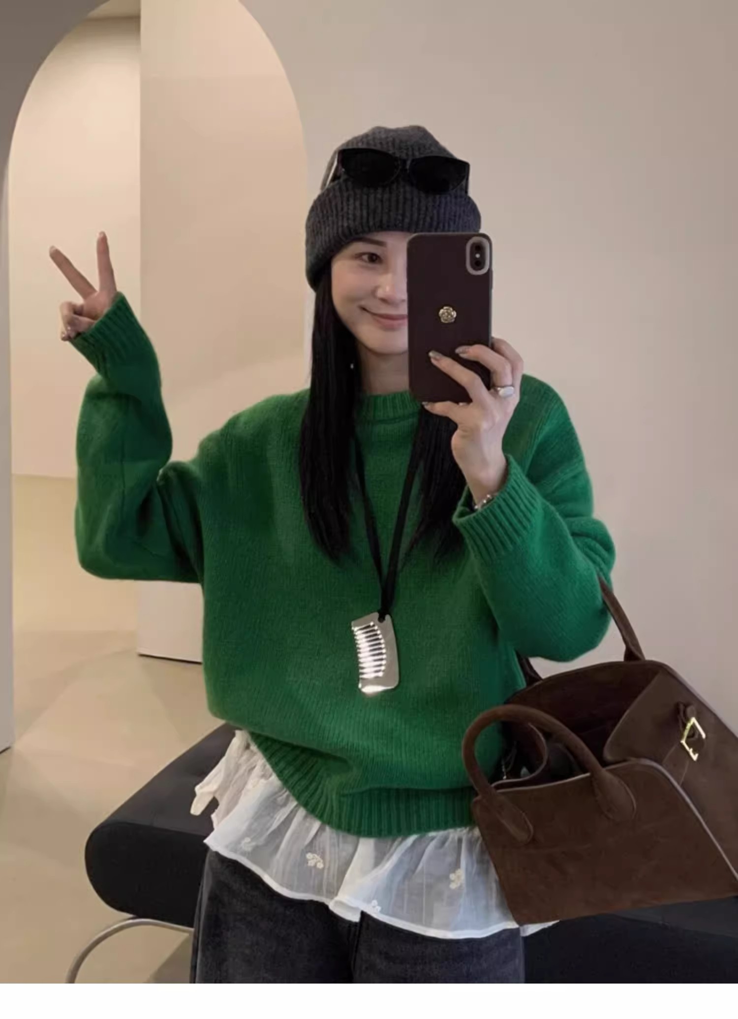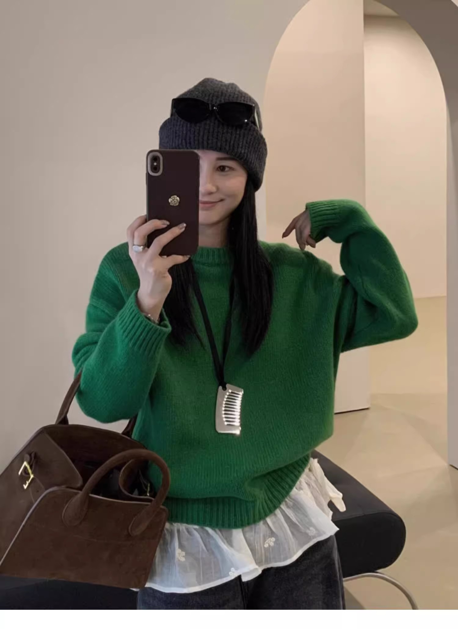 韓系穿搭高級感聖誕綠圓領套頭毛衣女秋冬季軟糯慵懶羊毛針織上衣