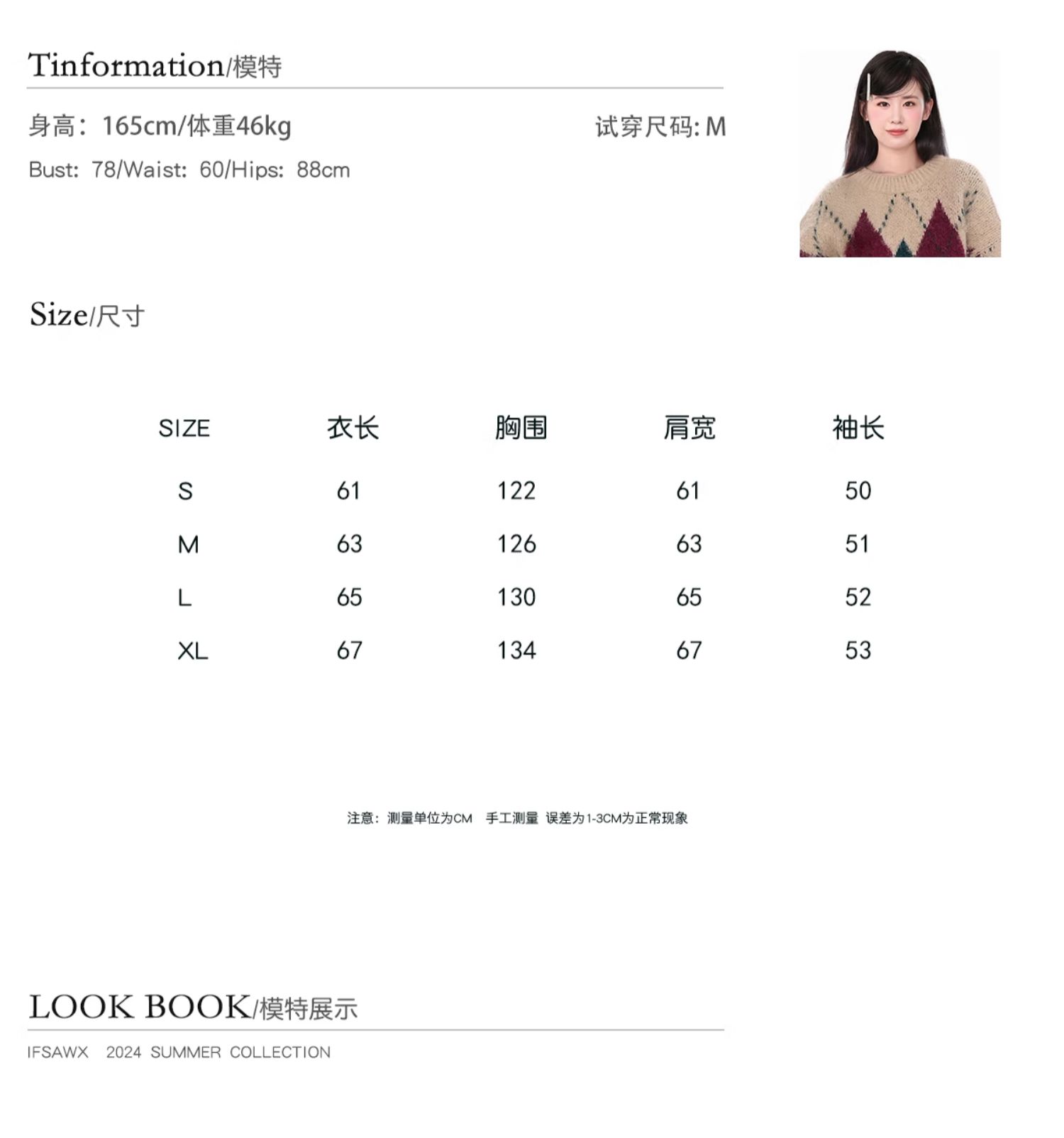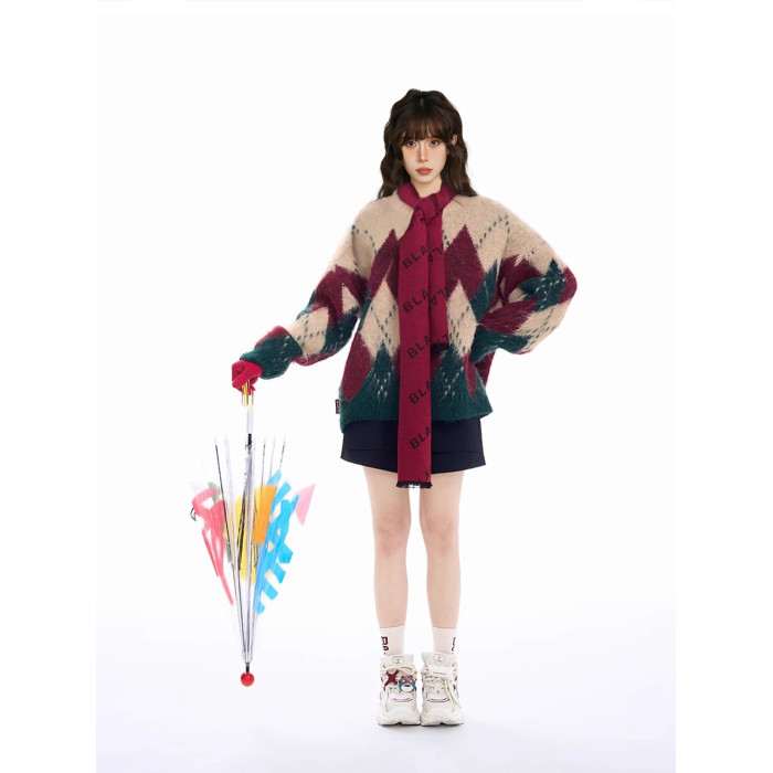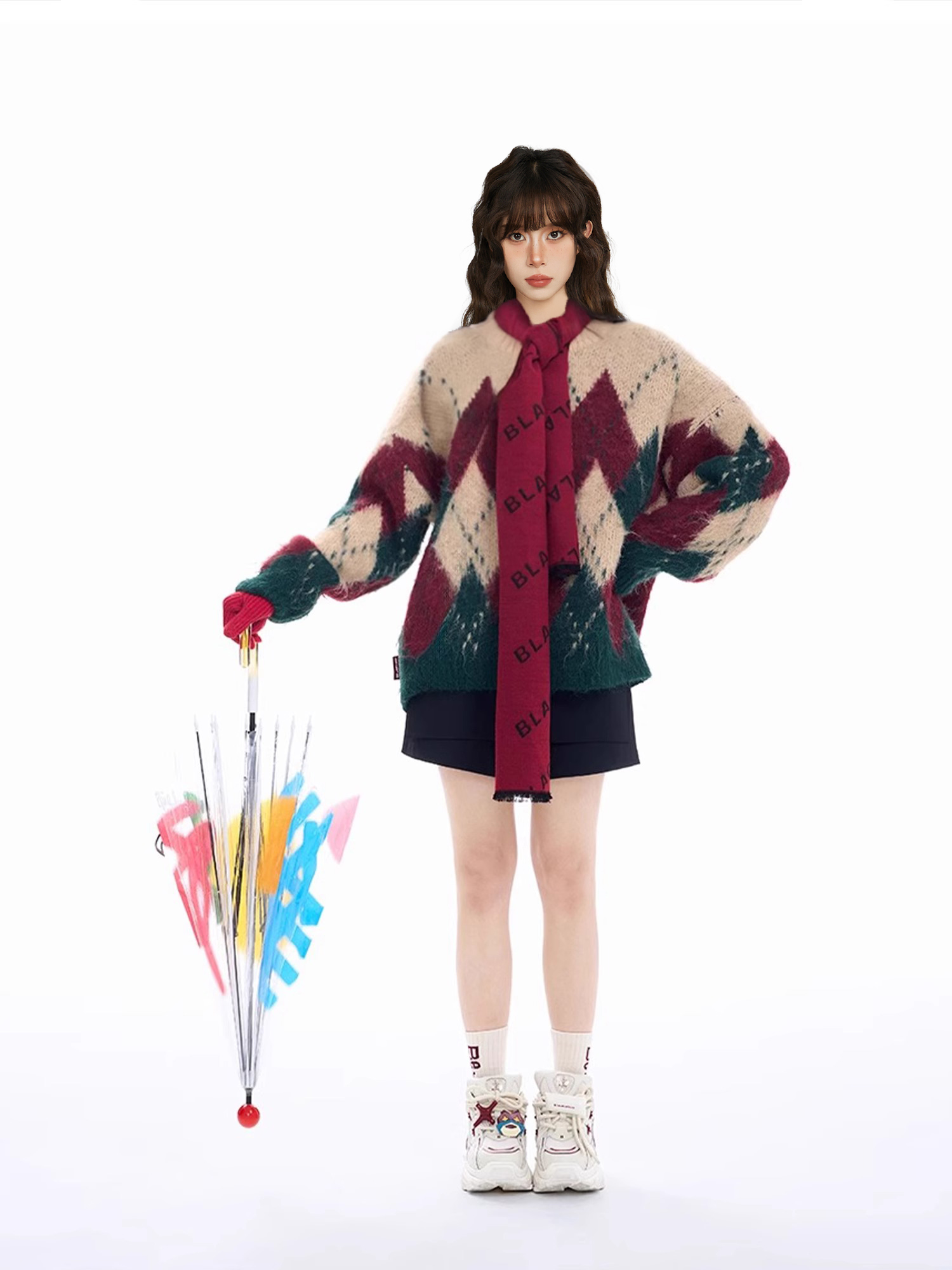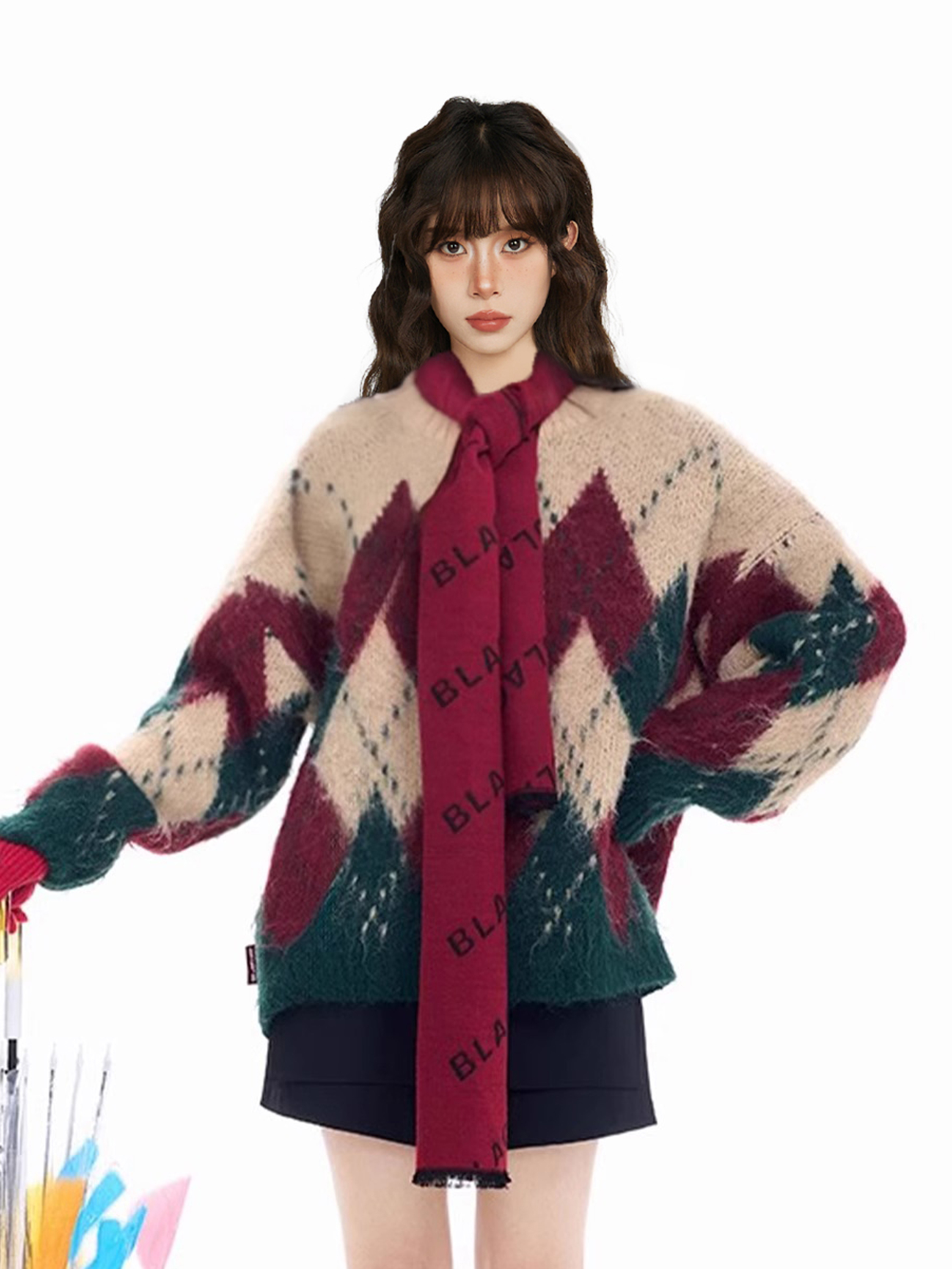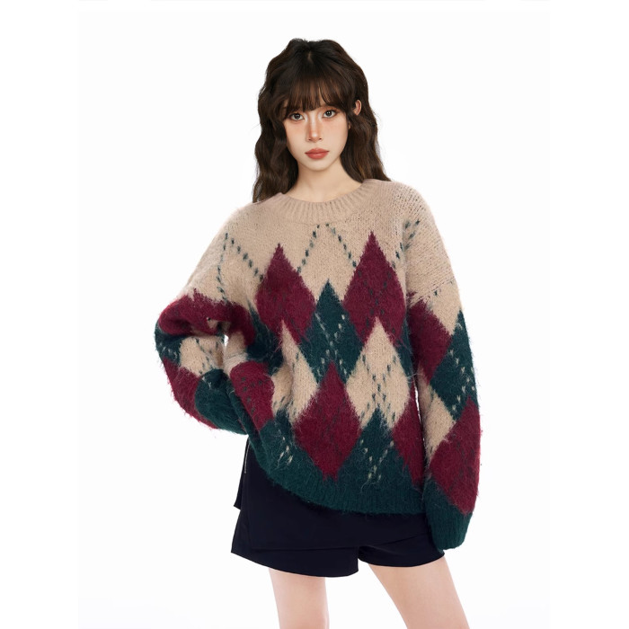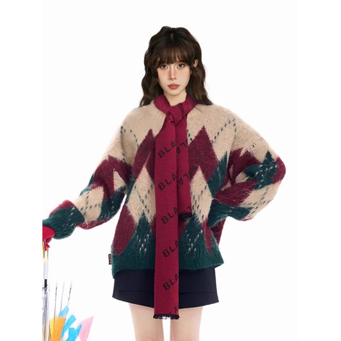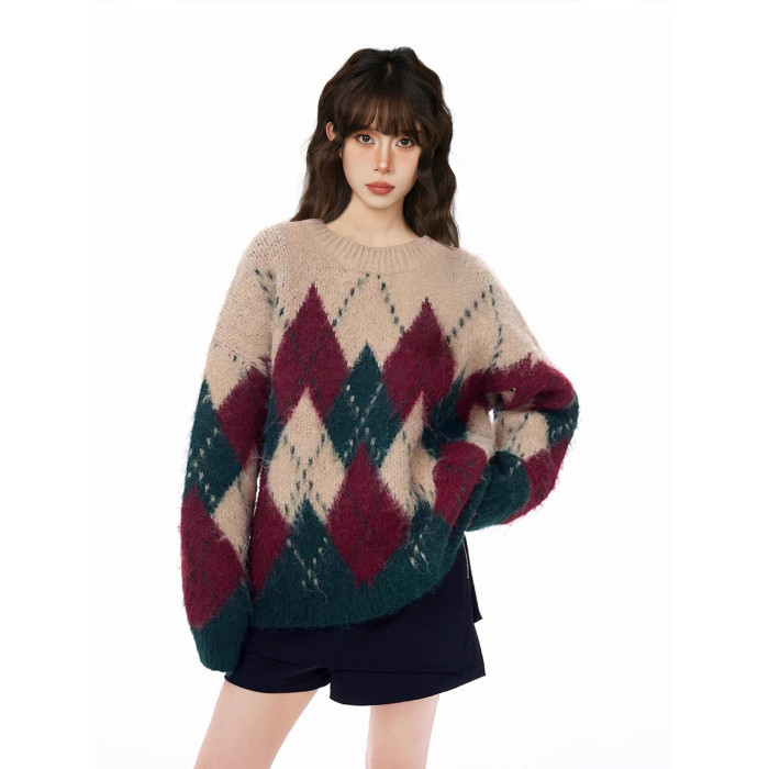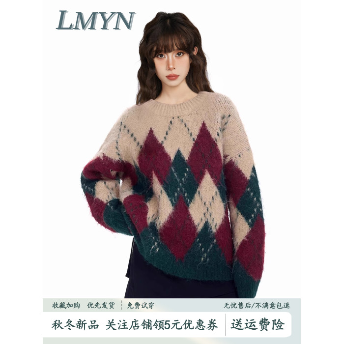 聖誕綠色菱格圓領套頭毛衣女秋冬季加厚寬松慵懶風軟糯羊絨針織衫