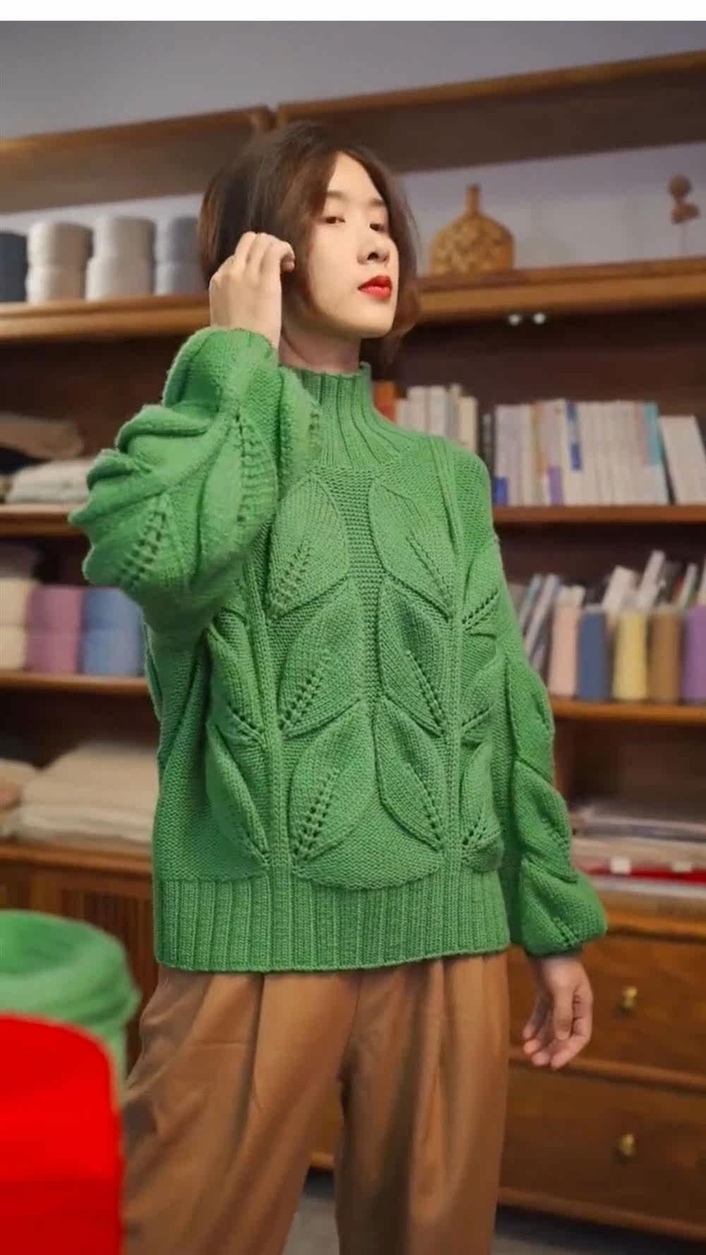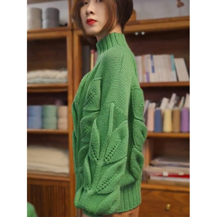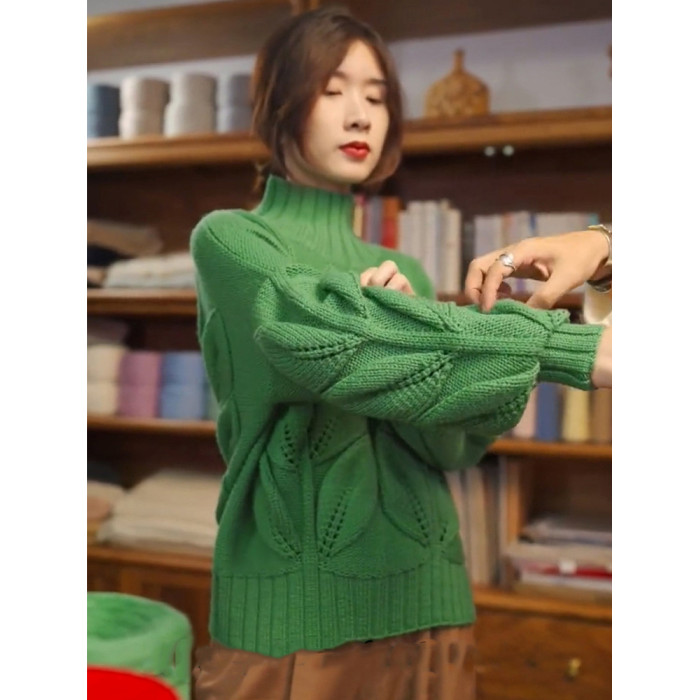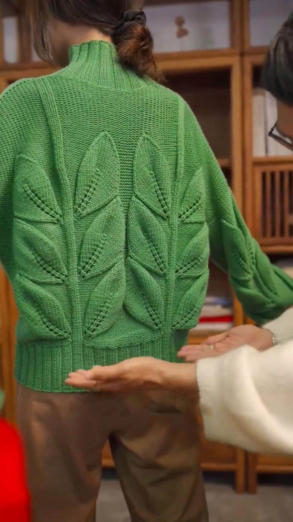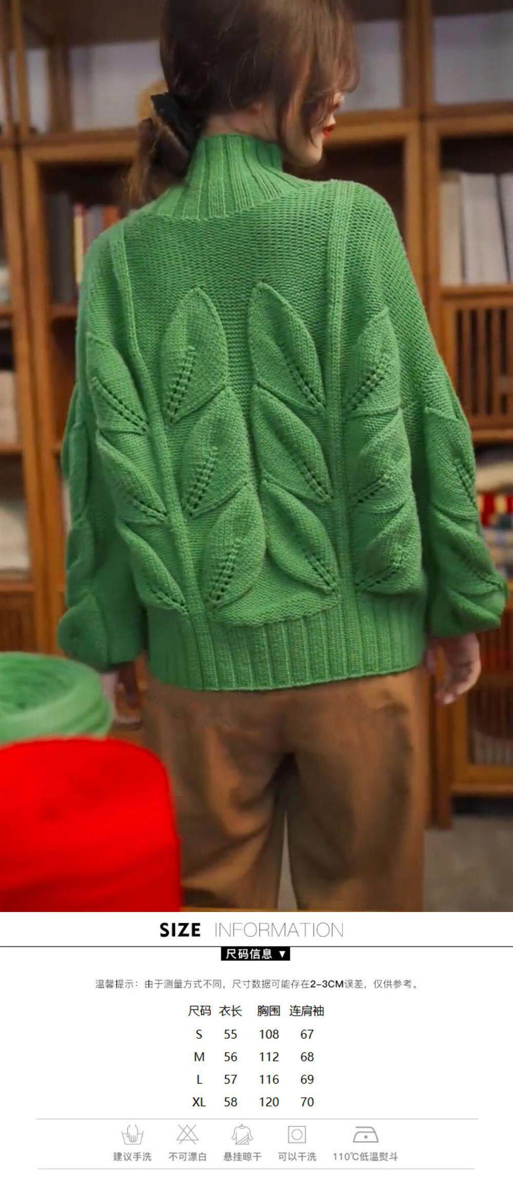 高級感漂亮時尚不撞款古著感慵懶風復古聖誕綠色樹葉絞花高領毛衣