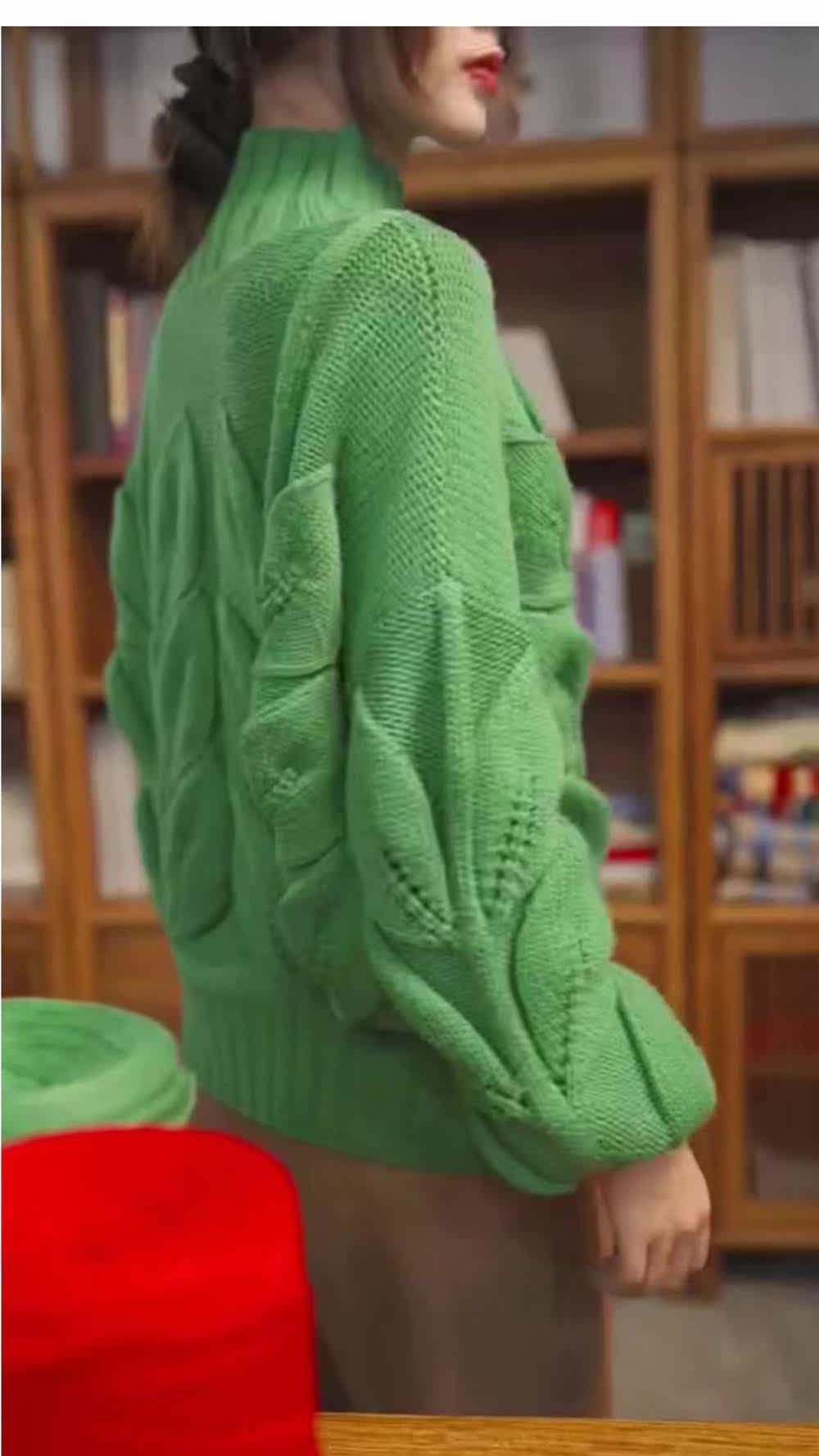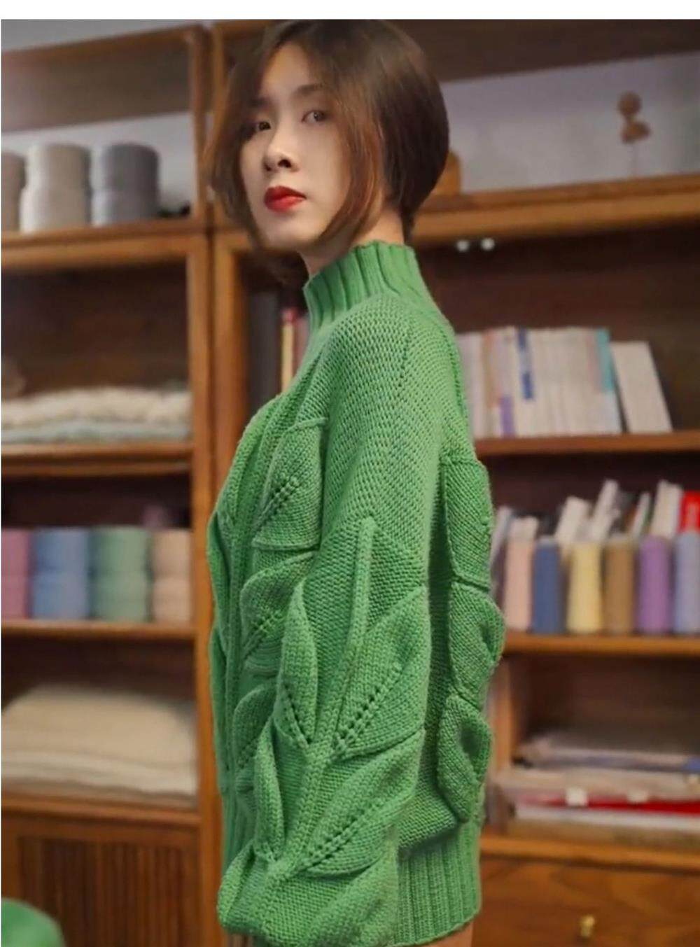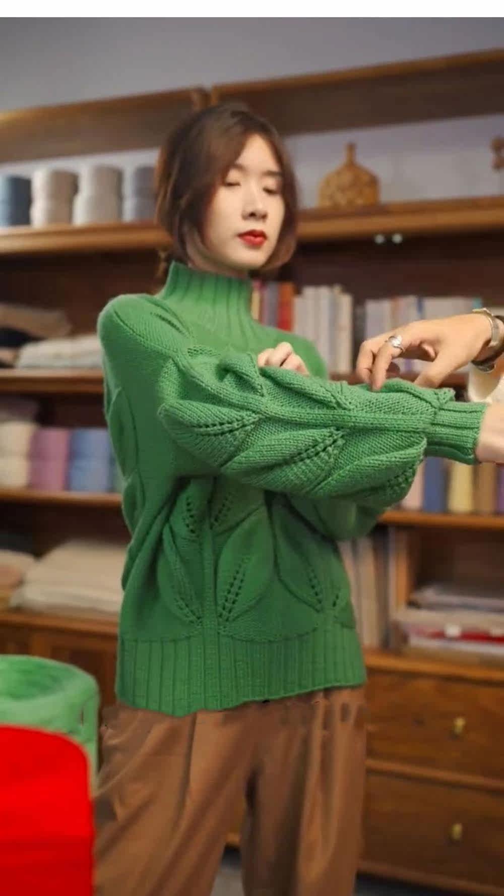 高級感漂亮時尚不撞款古著感慵懶風復古聖誕綠色樹葉絞花高領毛衣