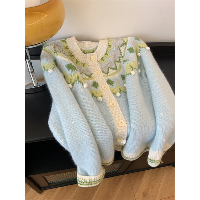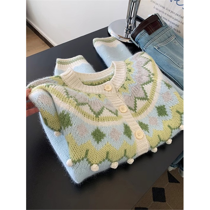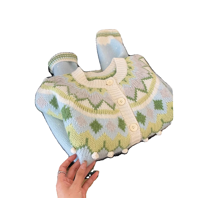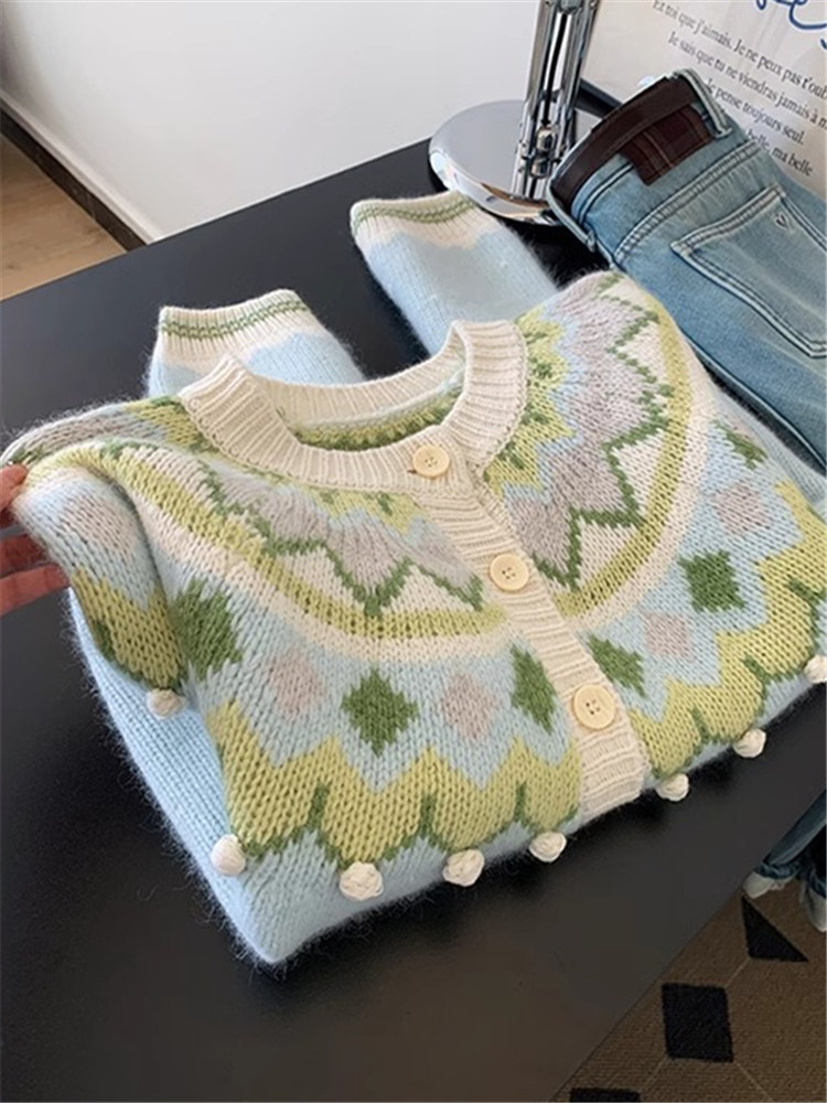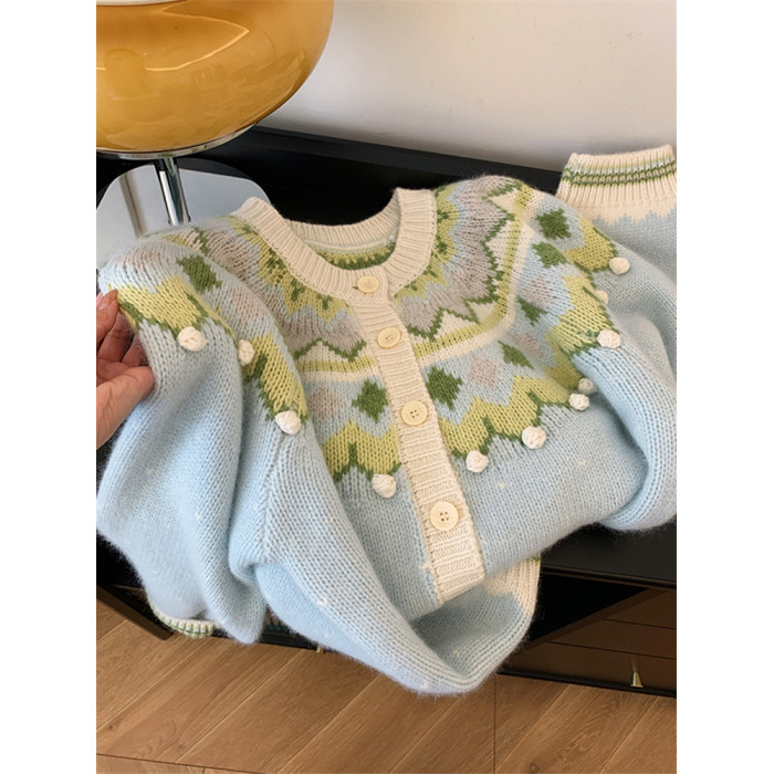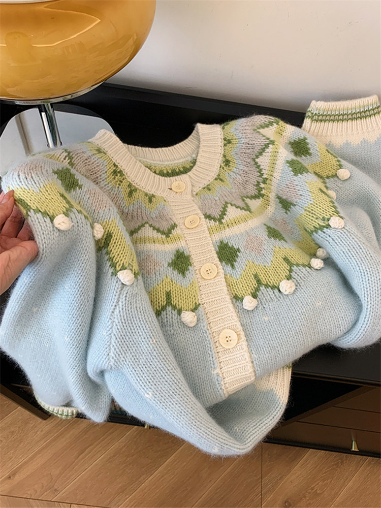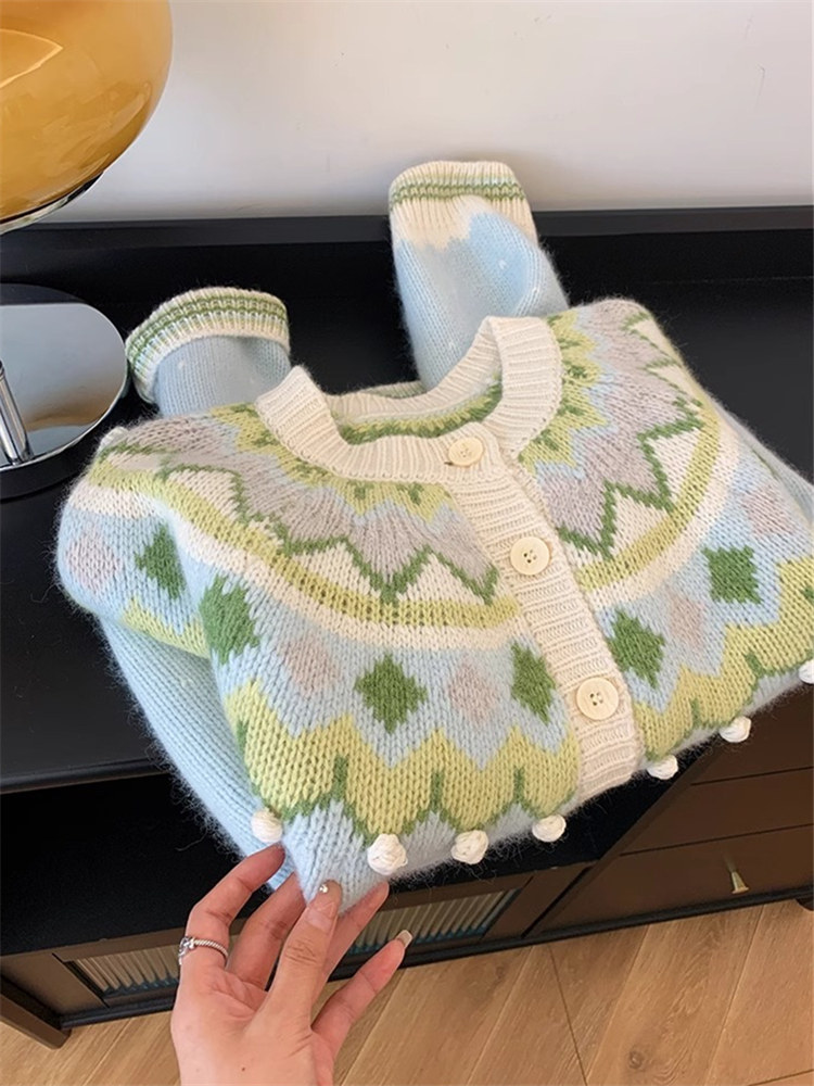 費爾島聖誕綠色質單排釦復古毛衣女秋冬韓系慵懶風高級感針織開衫