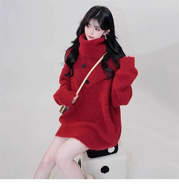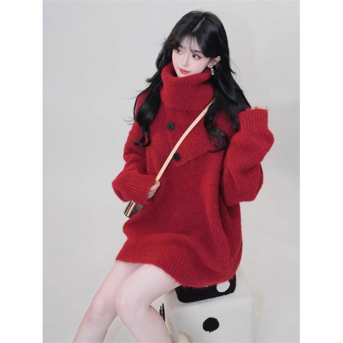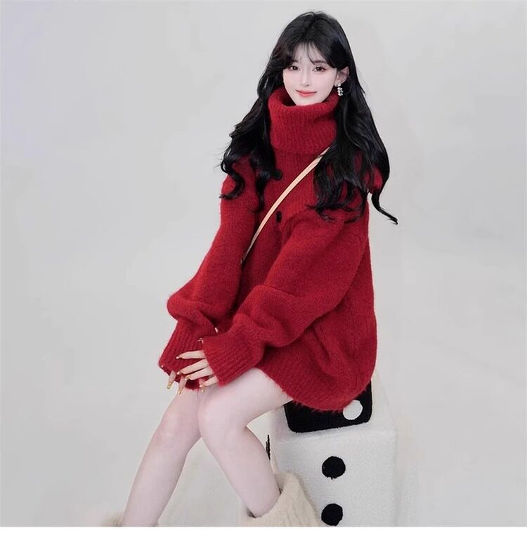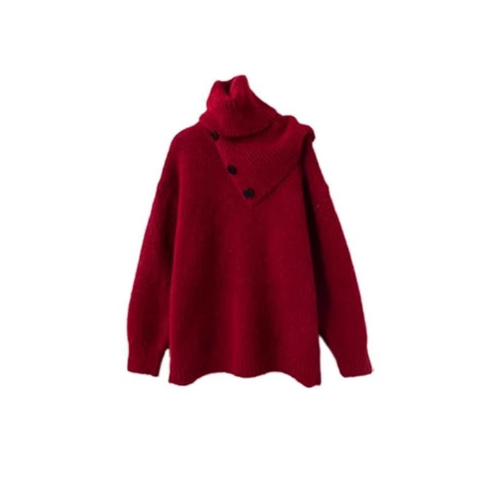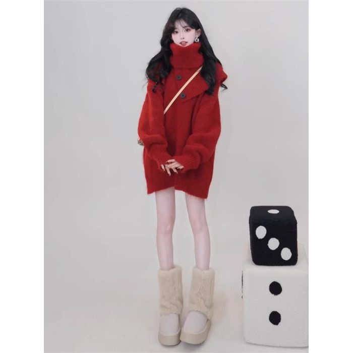 聖誕紅色高領針織毛衣圍巾兩件套裝女秋冬高級感慵懶加厚外穿上衣