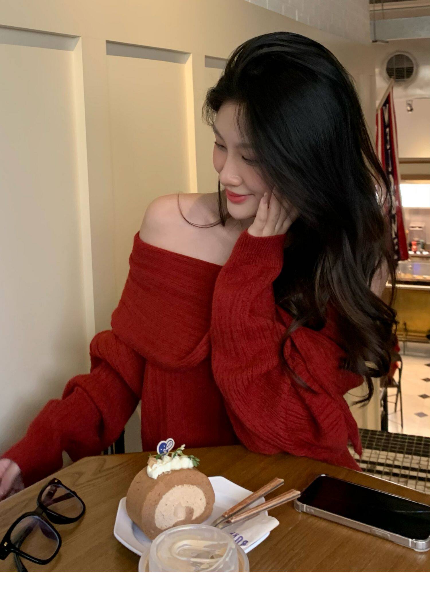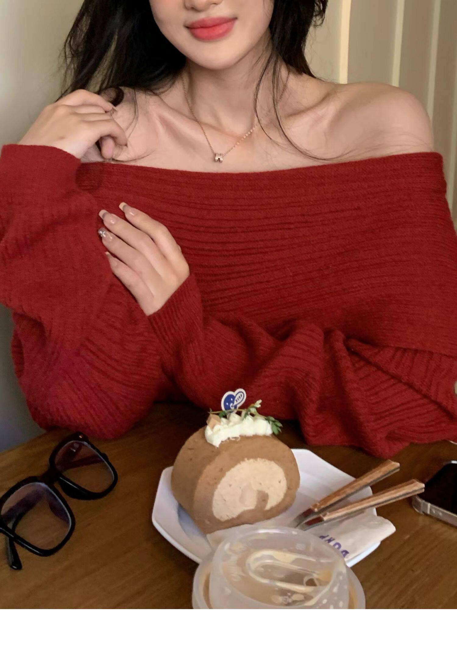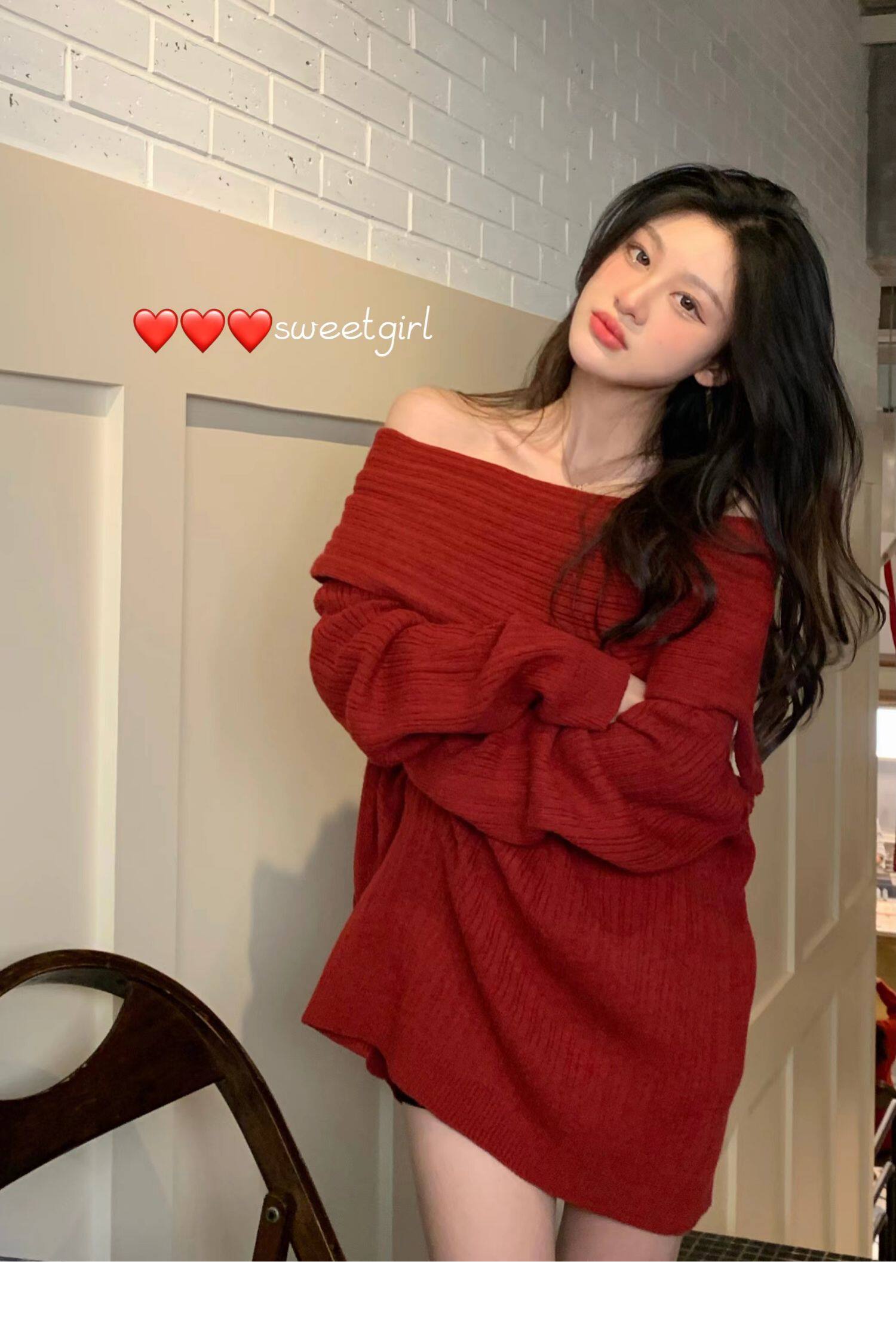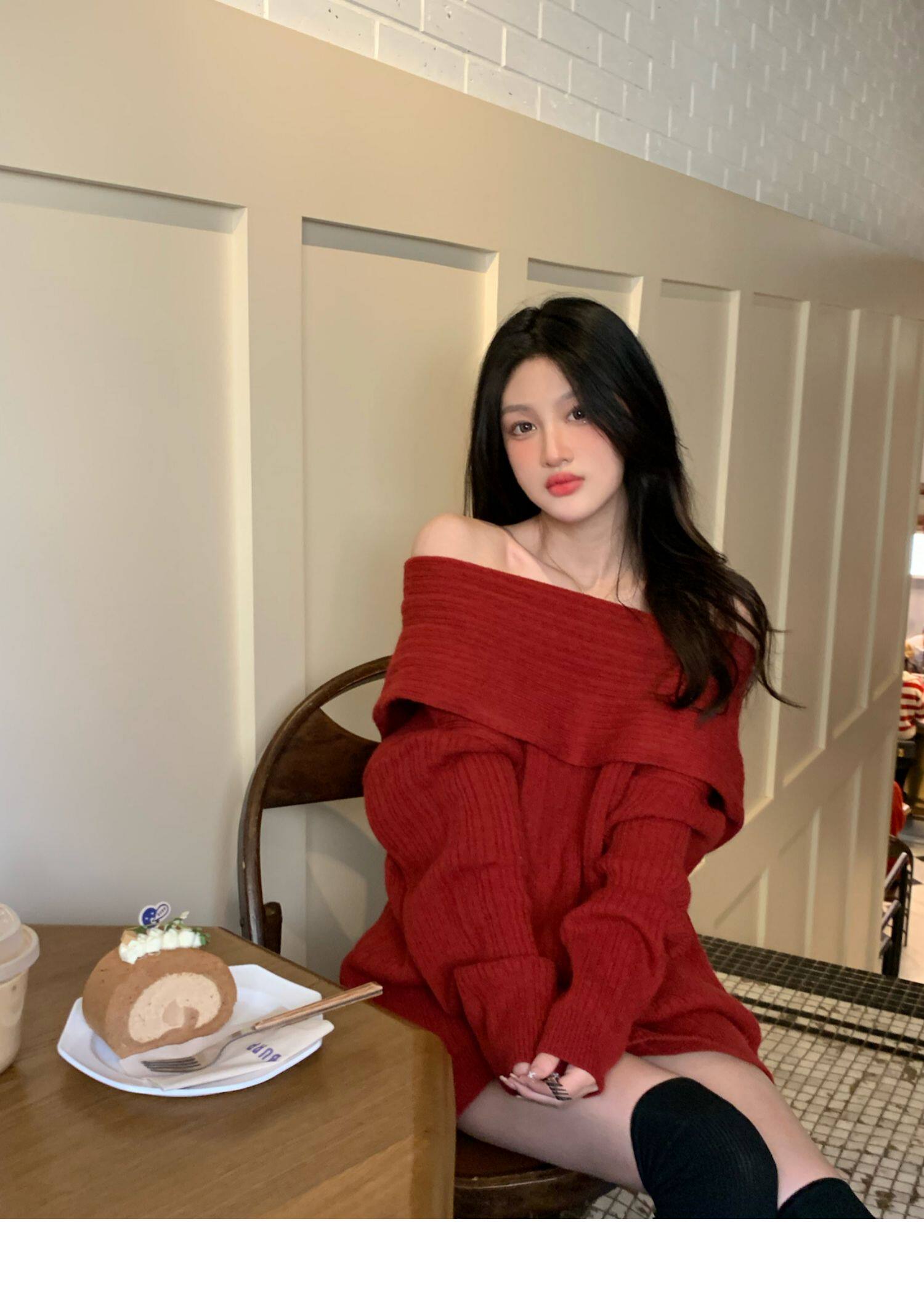 聖誕紅色軟糯一字領針織連衣裙女秋冬季高級感純欲漏肩氣質毛衣裙