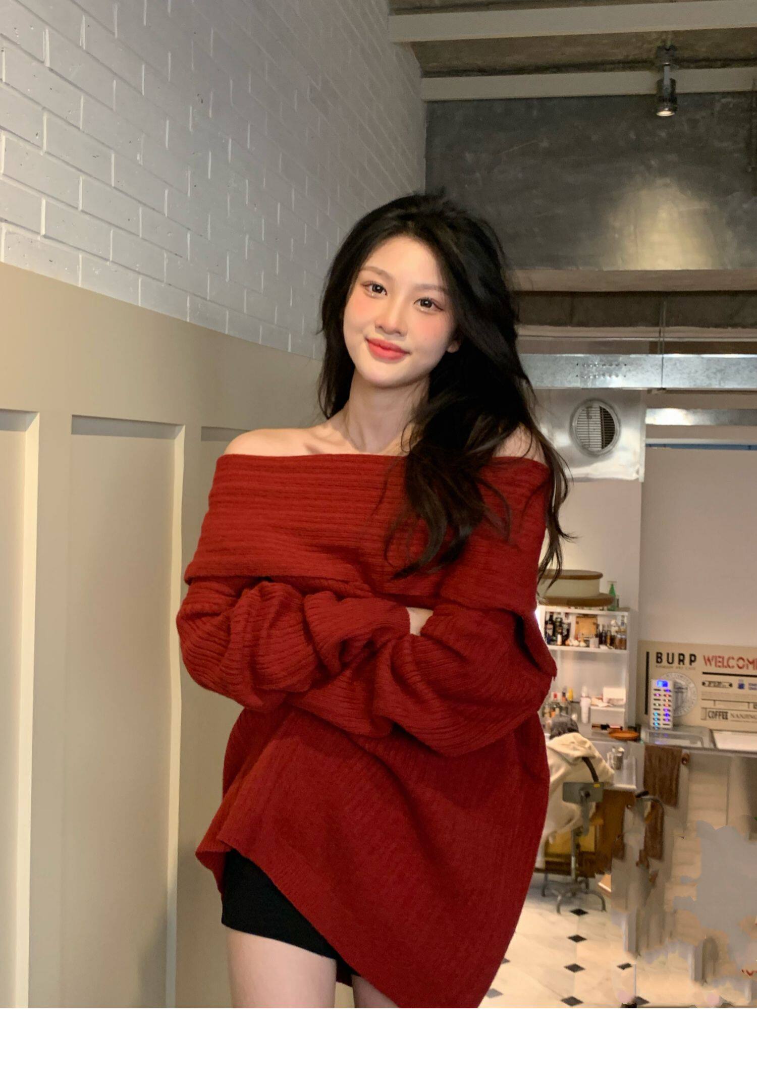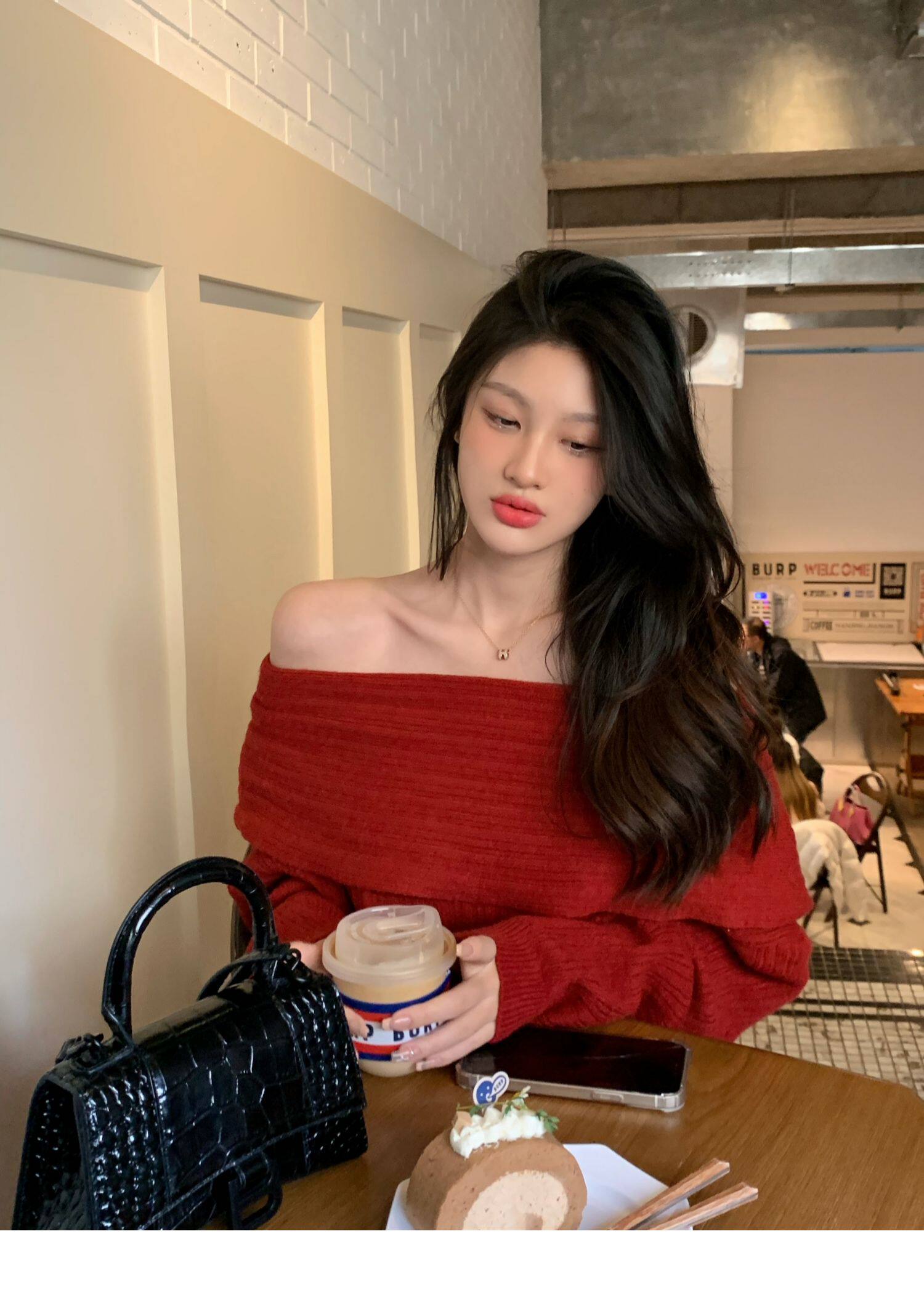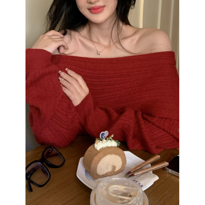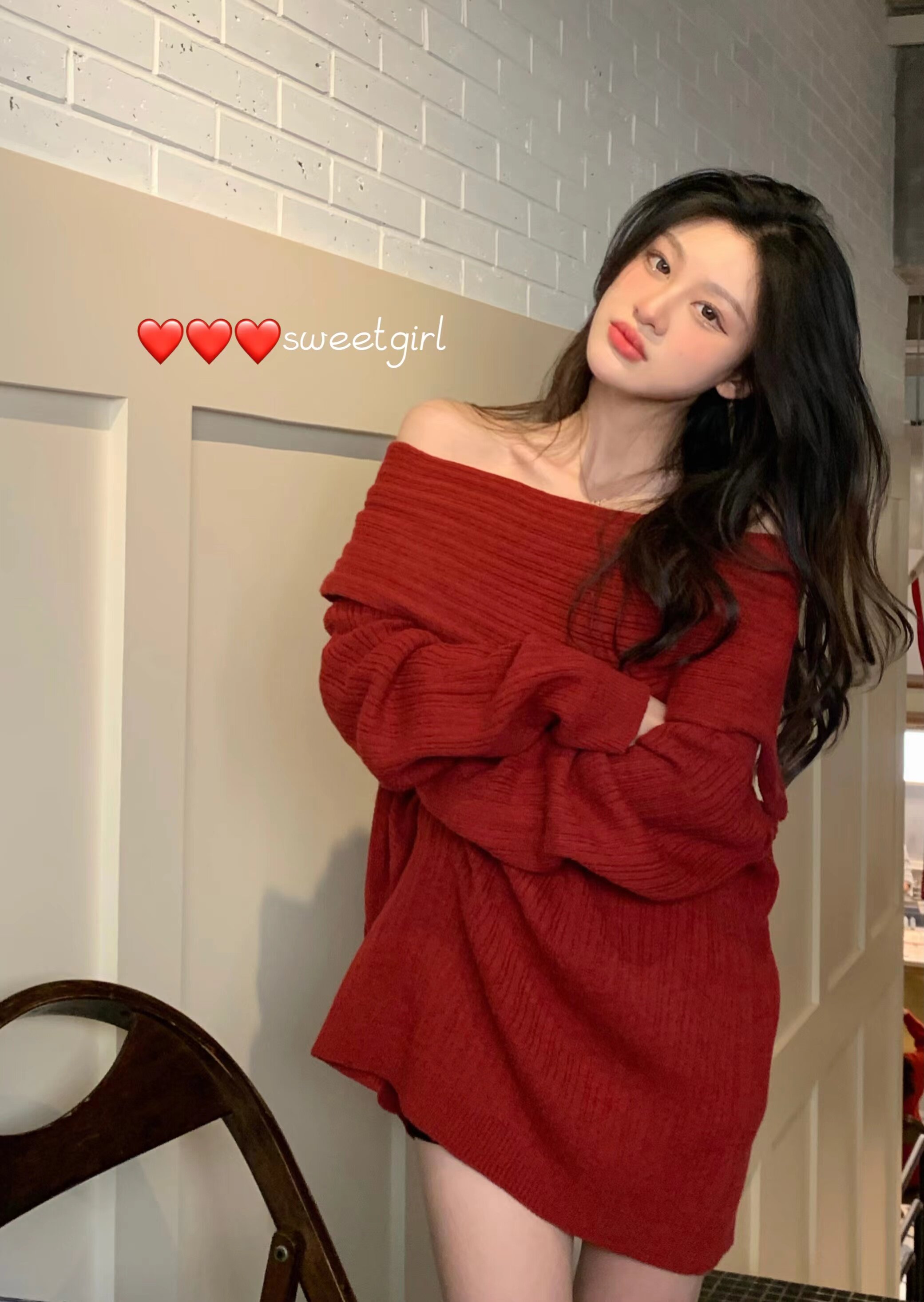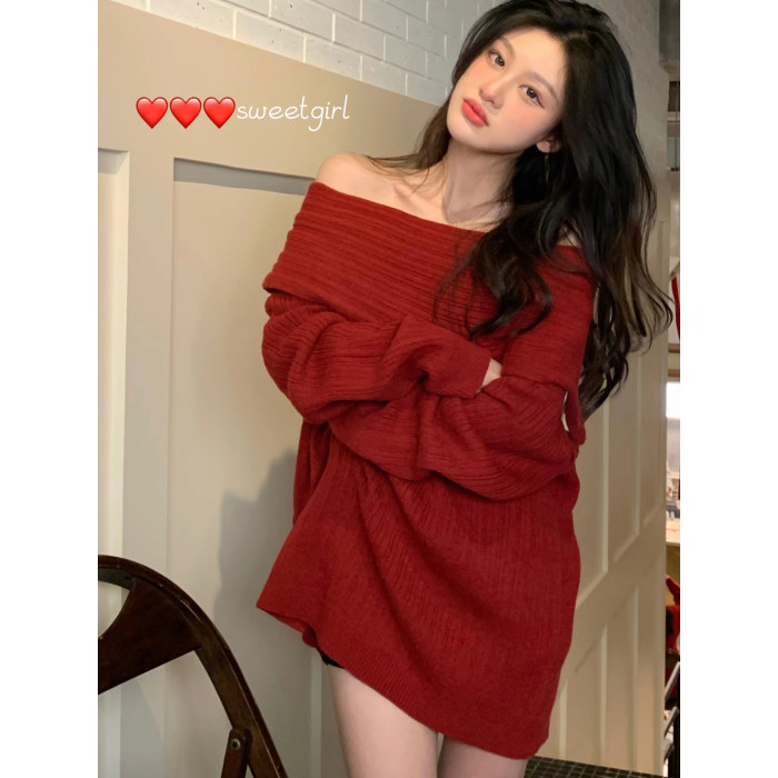 聖誕紅色軟糯一字領針織連衣裙女秋冬季高級感純欲漏肩氣質毛衣裙