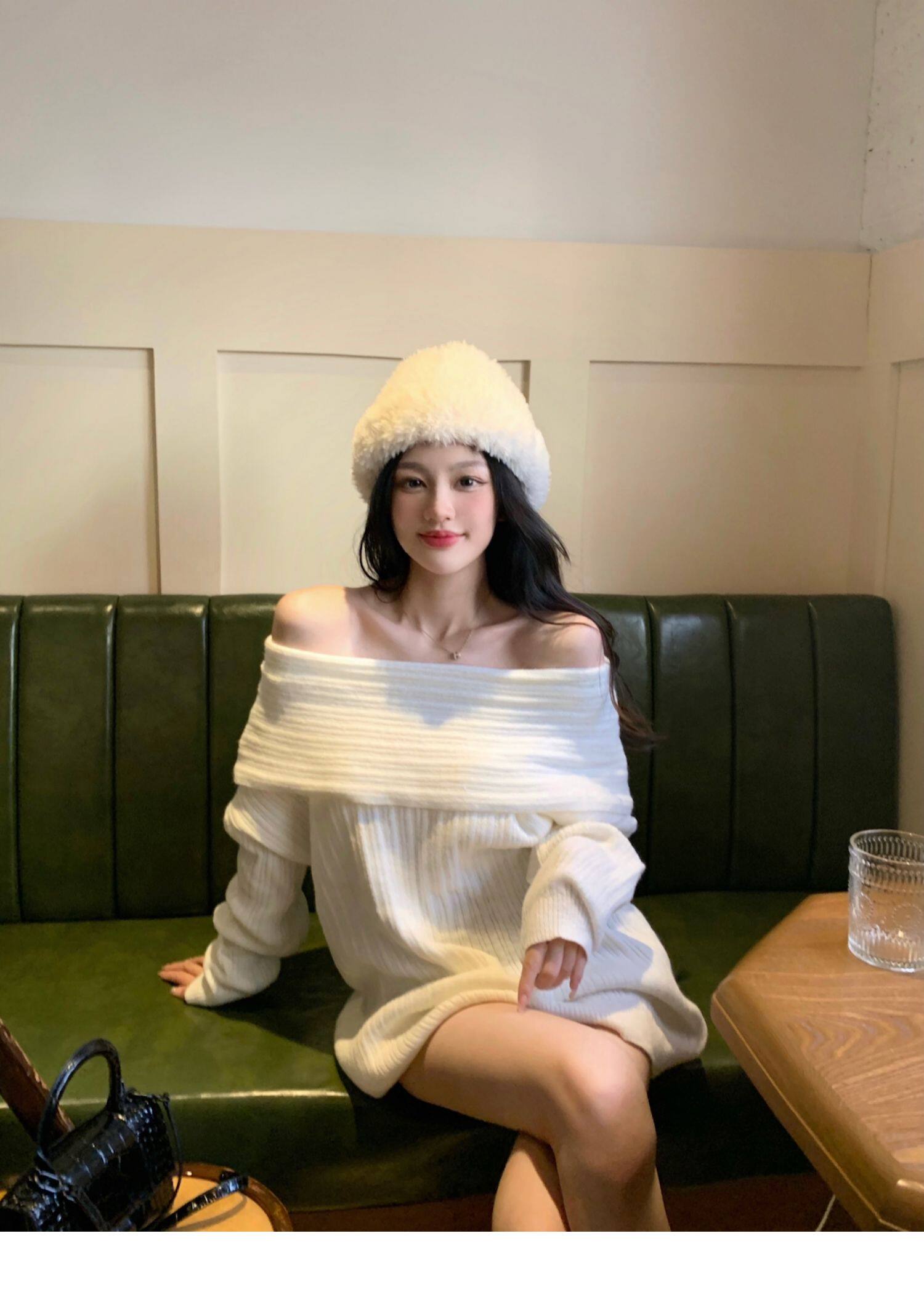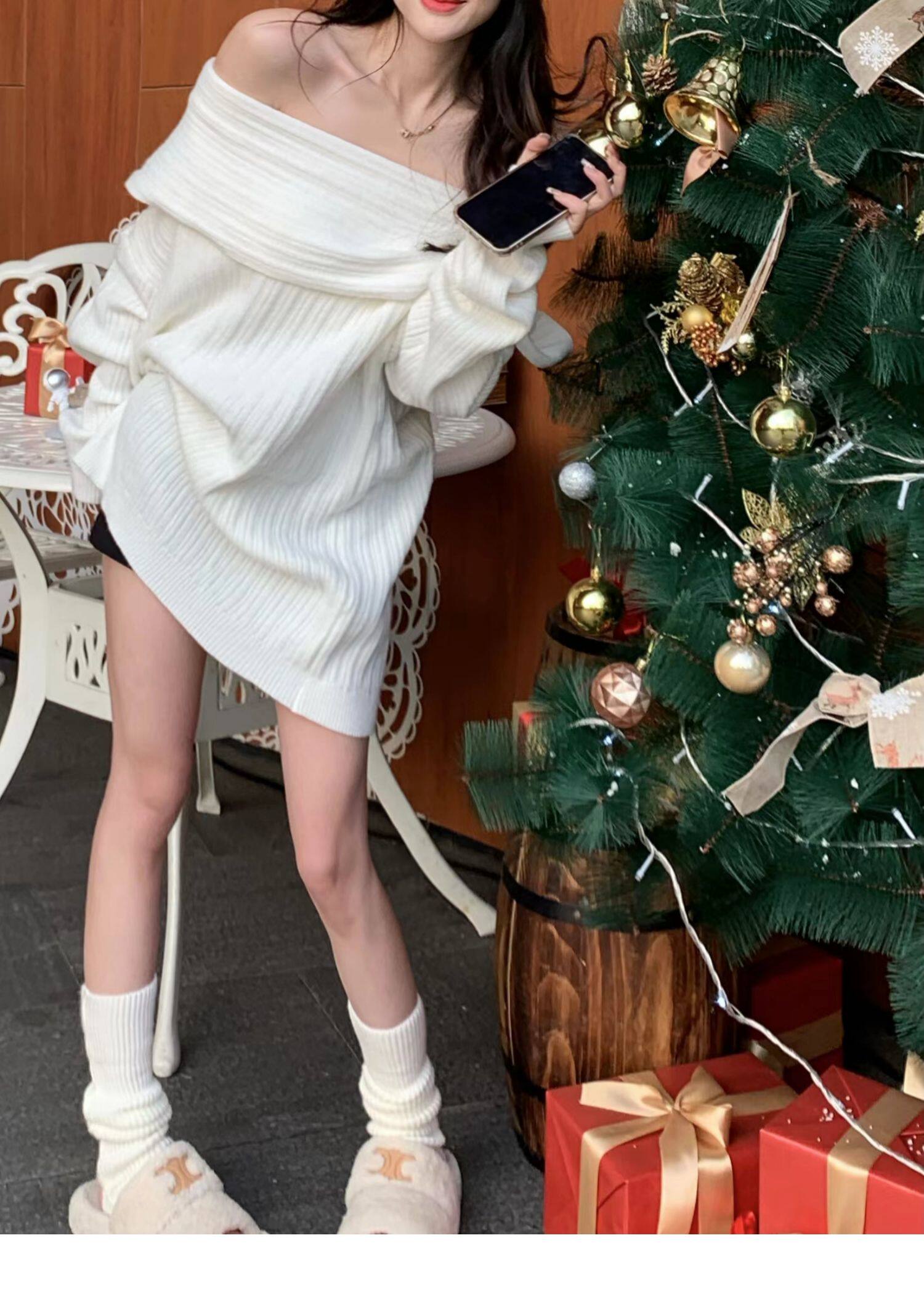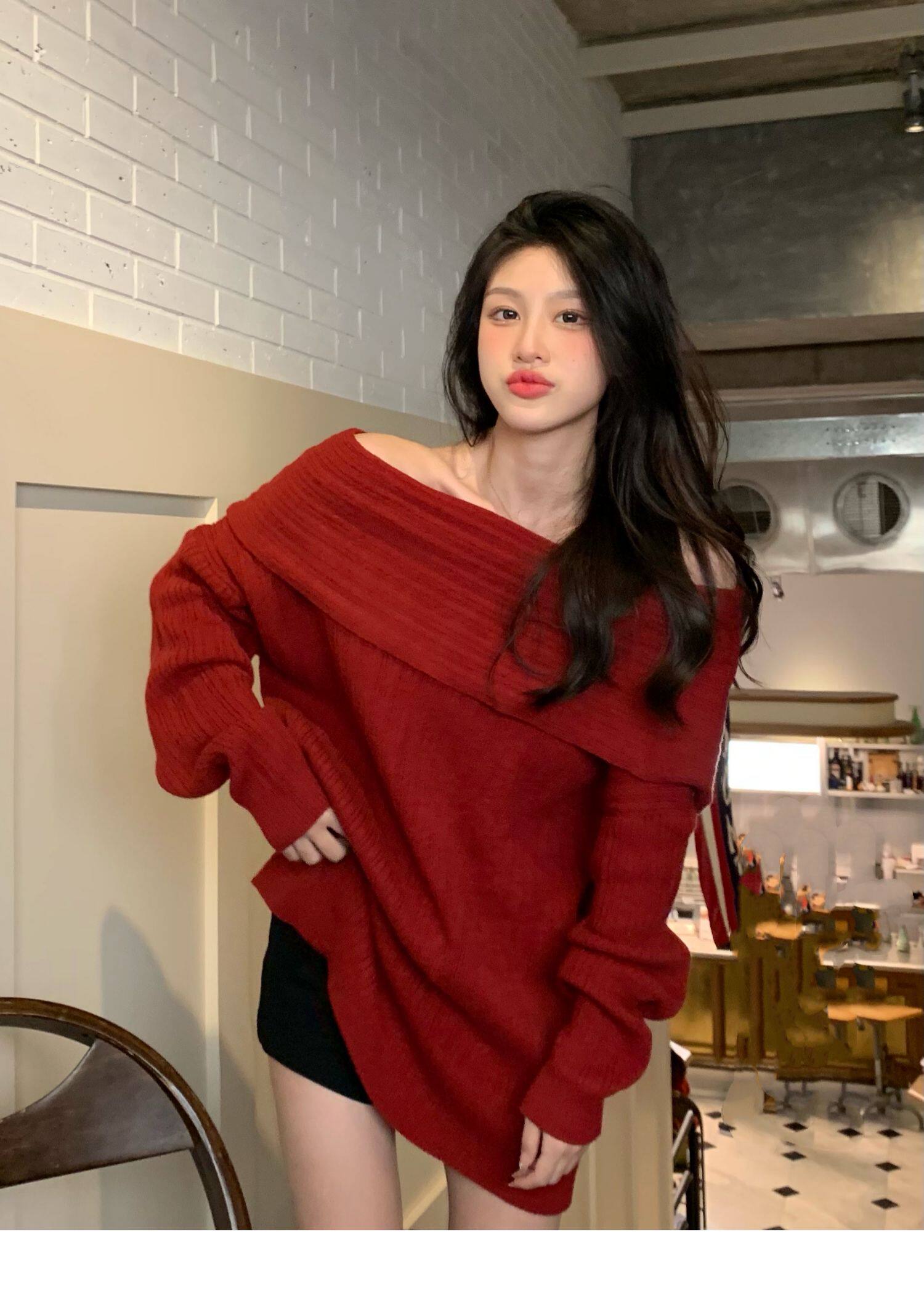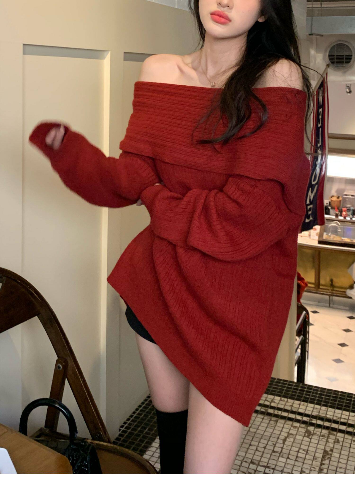 聖誕紅色軟糯一字領針織連衣裙女秋冬季高級感純欲漏肩氣質毛衣裙