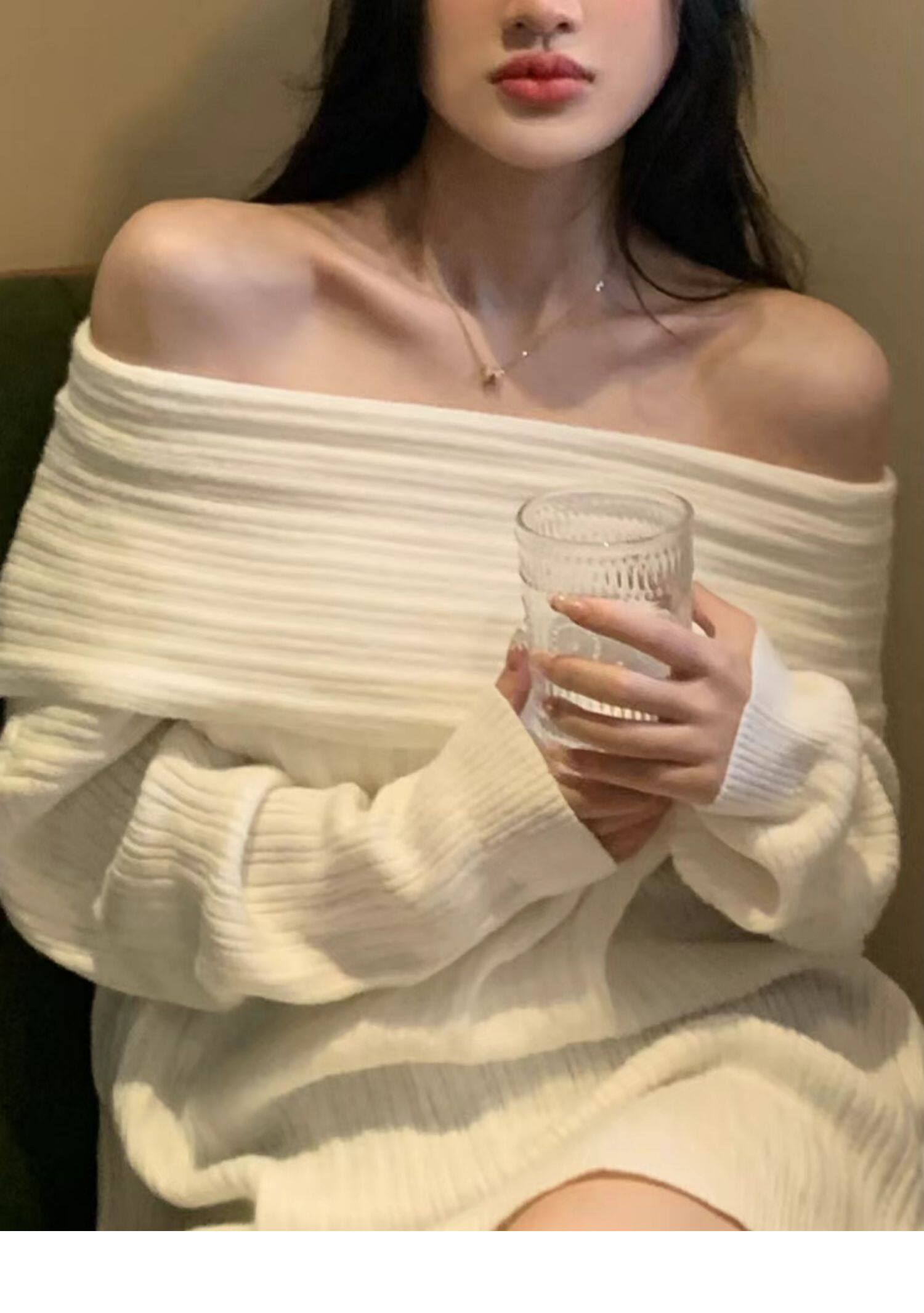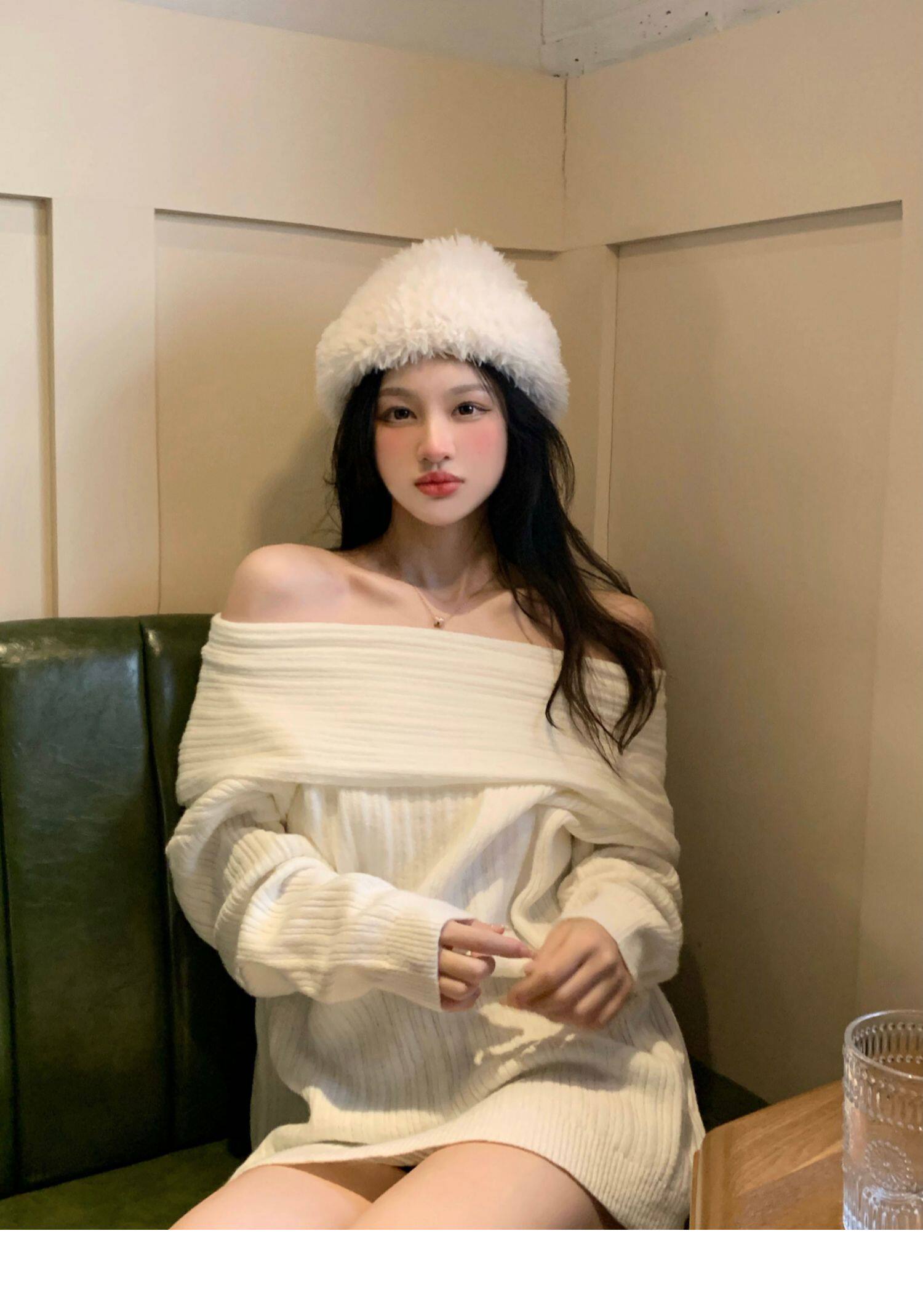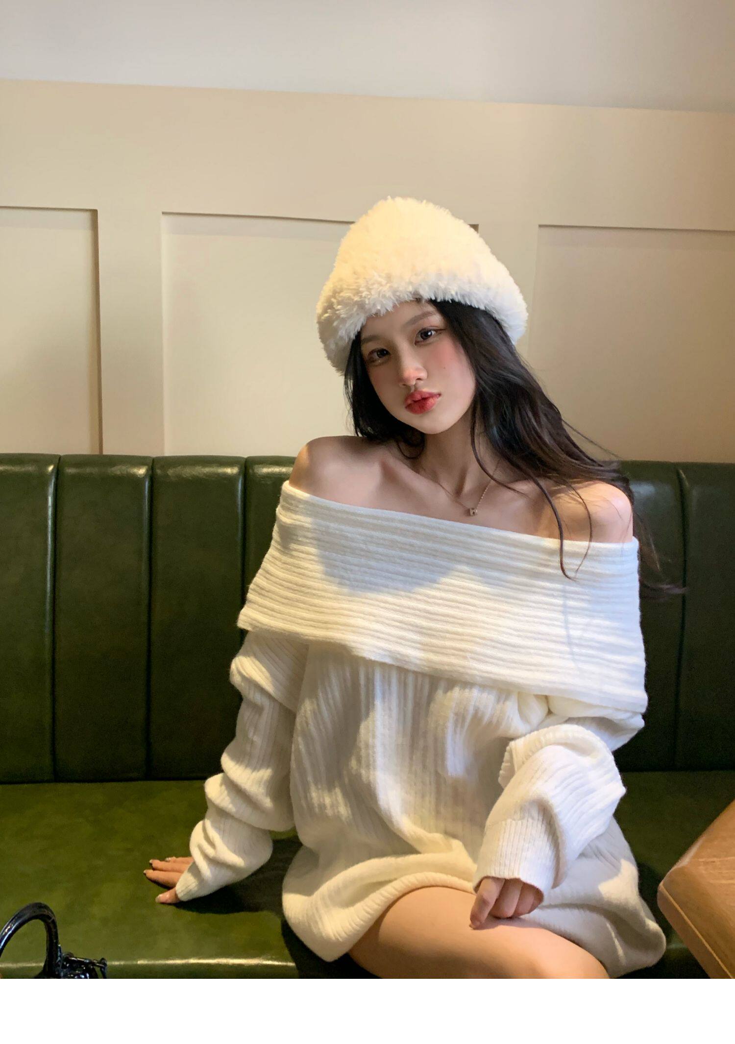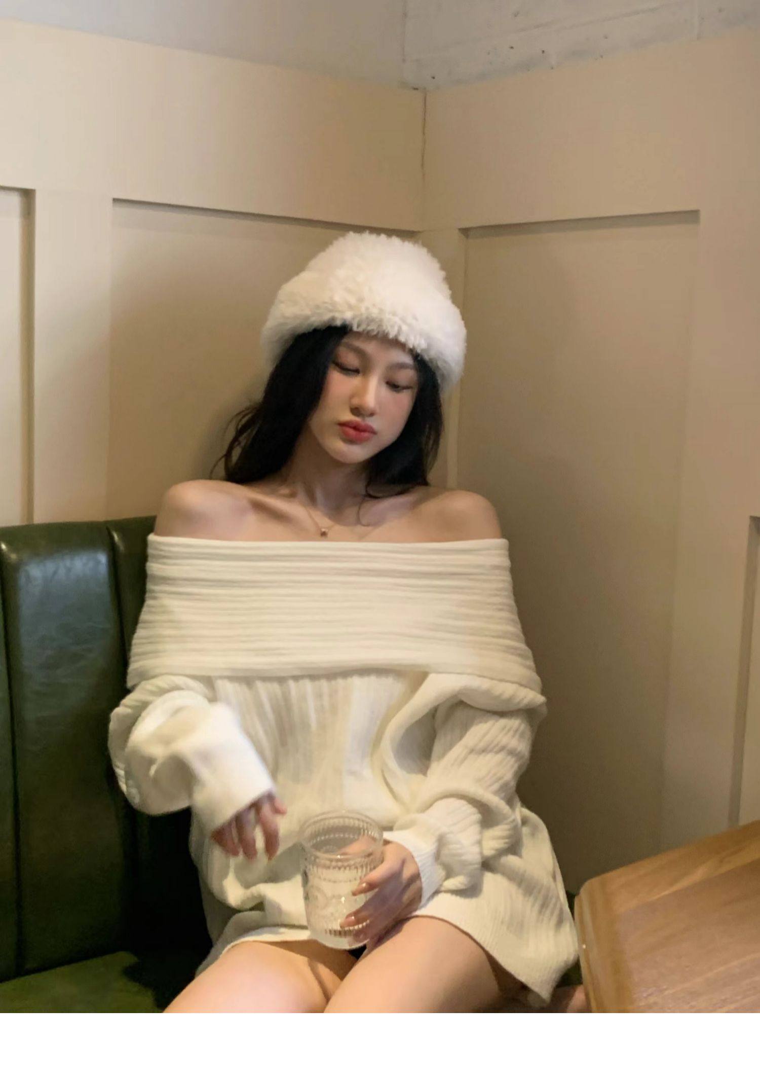 聖誕紅色軟糯一字領針織連衣裙女秋冬季高級感純欲漏肩氣質毛衣裙