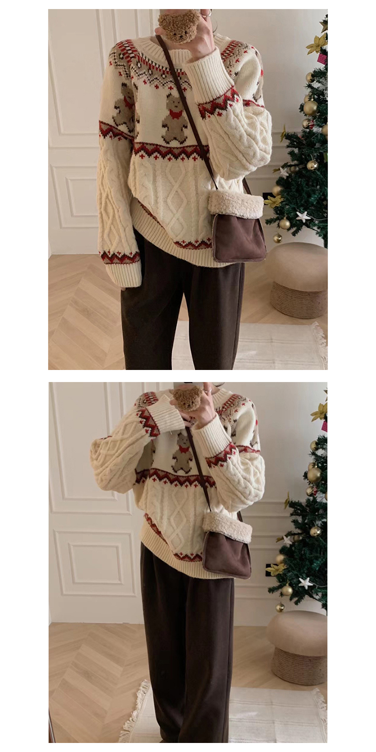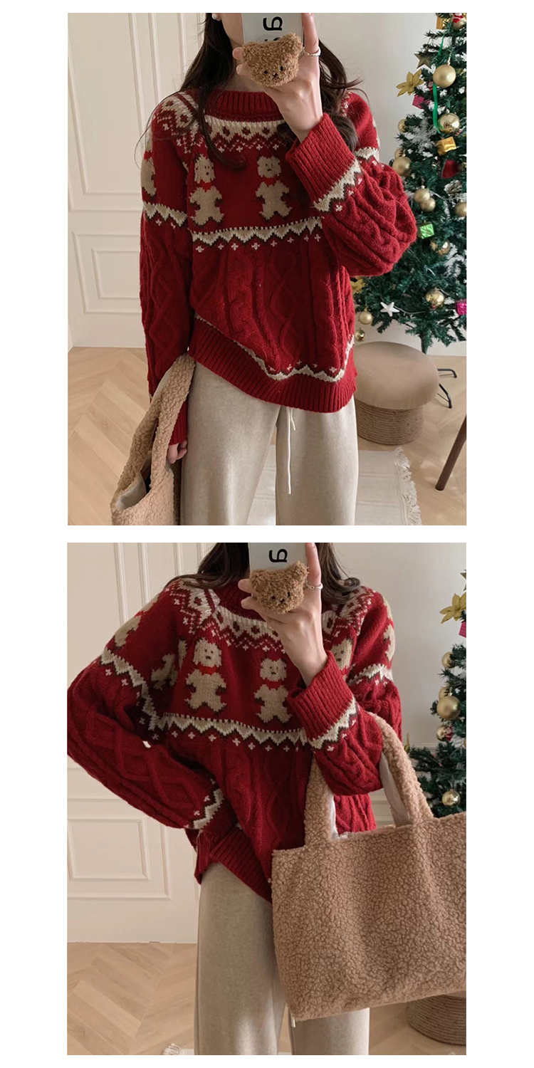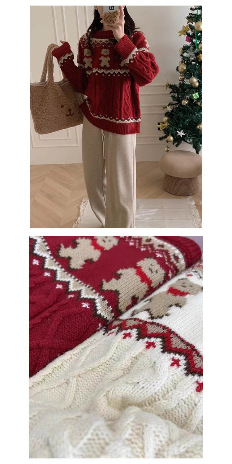 新年氛圍感聖誕紅色小熊毛衣女套頭寬松秋冬加厚慵懶針織上衣外穿