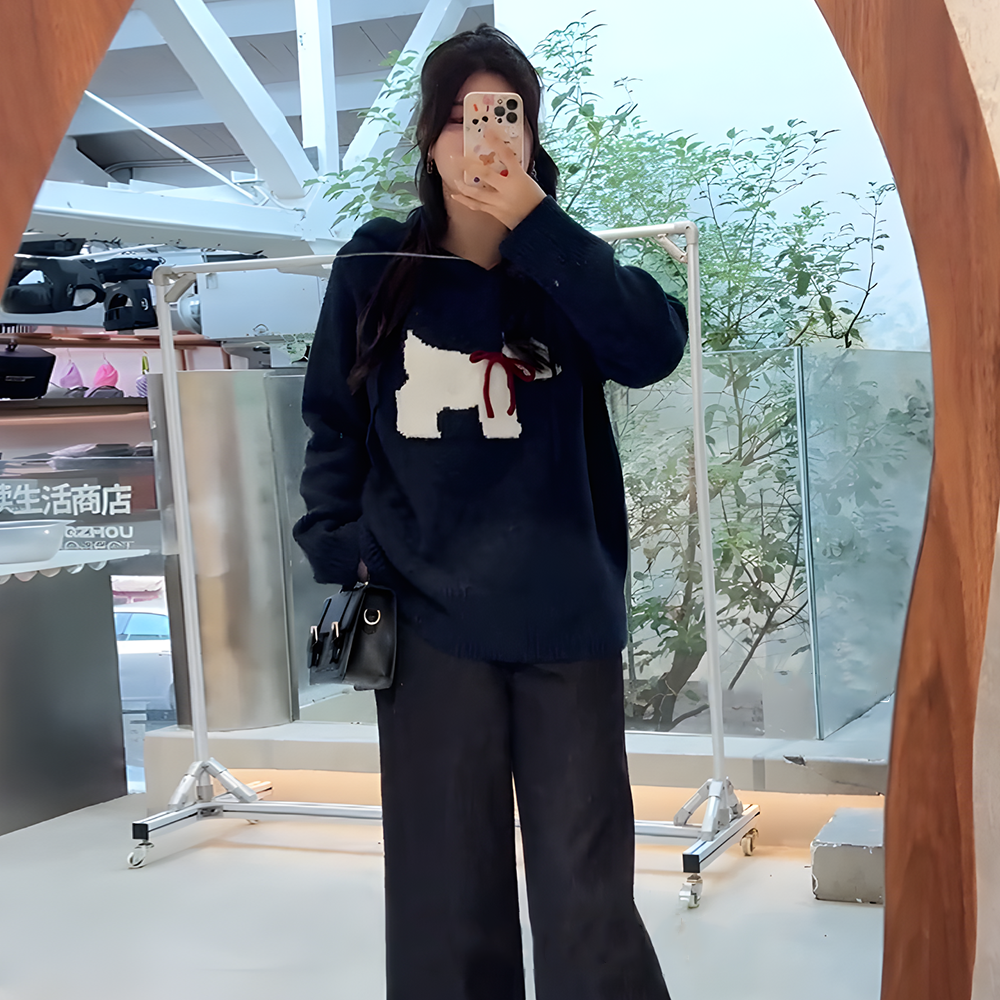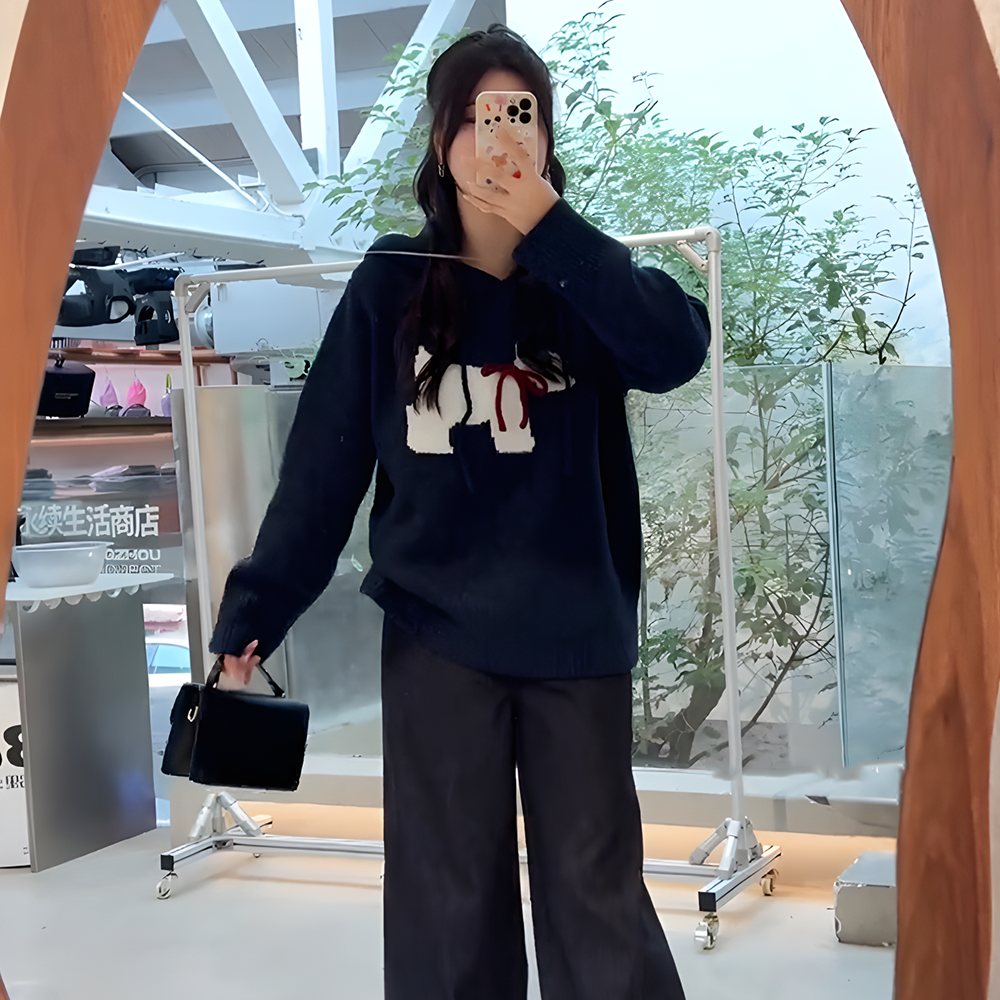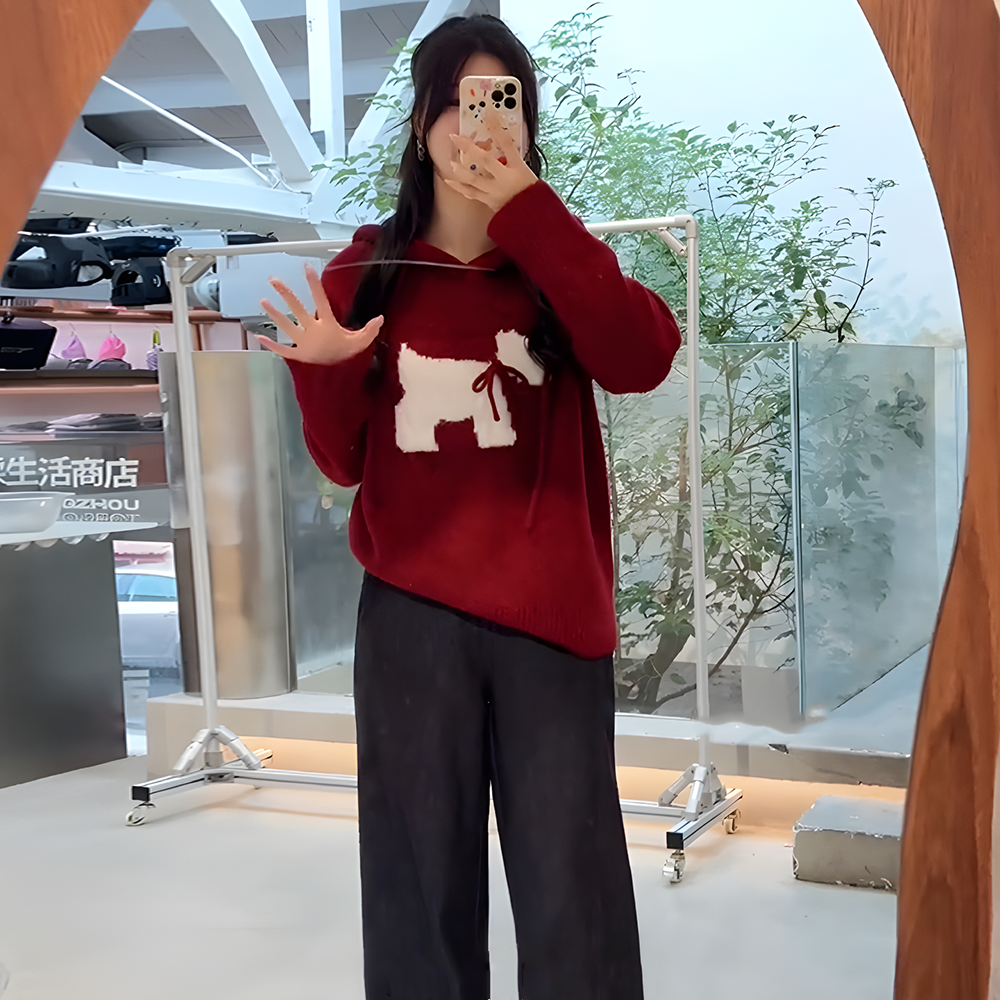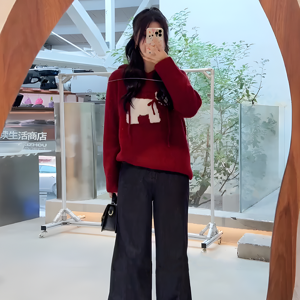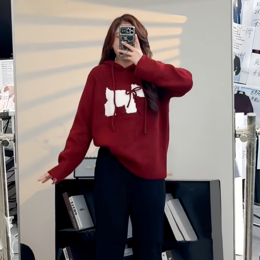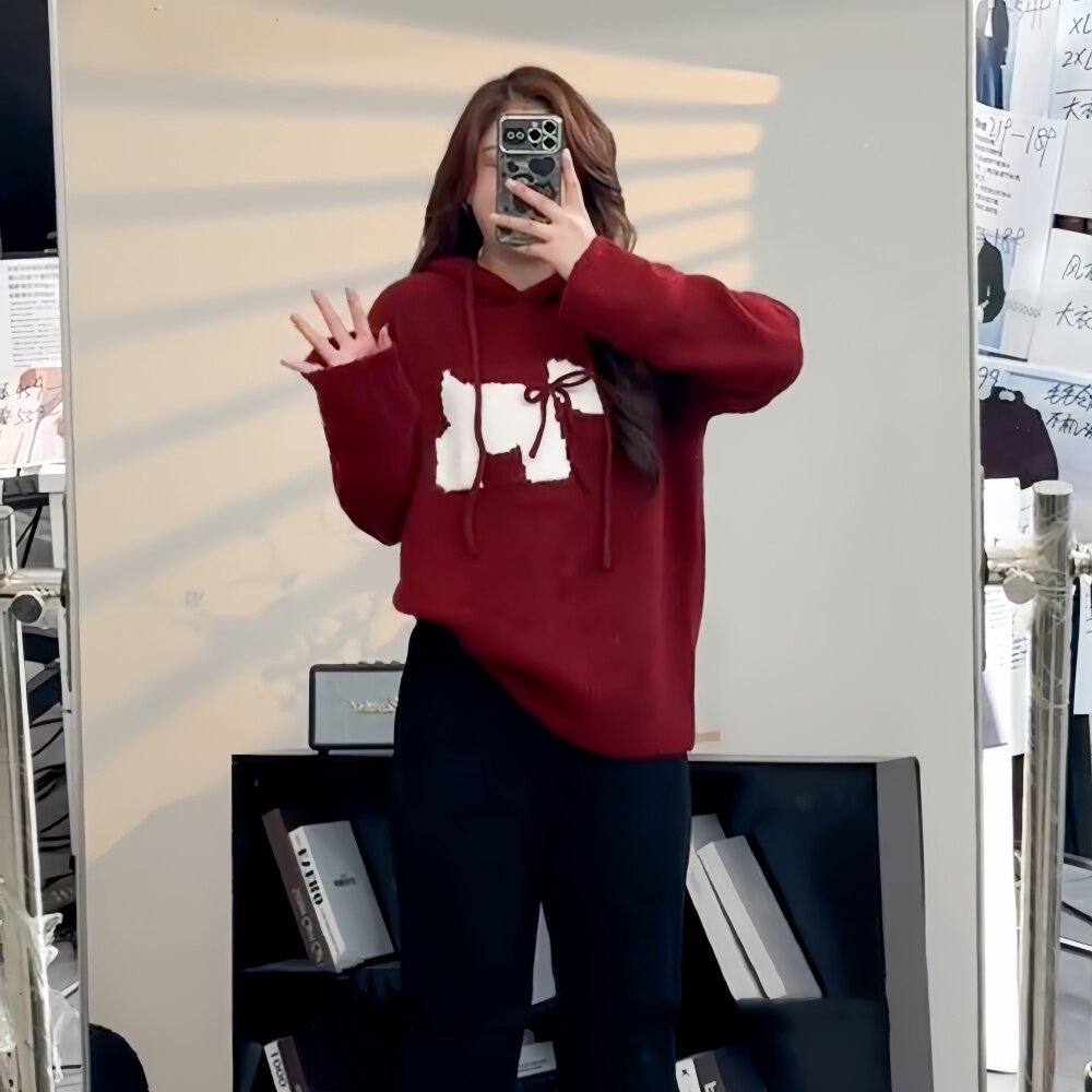 大碼聖誕紅色連帽毛衣針織衫女秋冬胖mm新年戰袍遮肚顯瘦正肩上衣