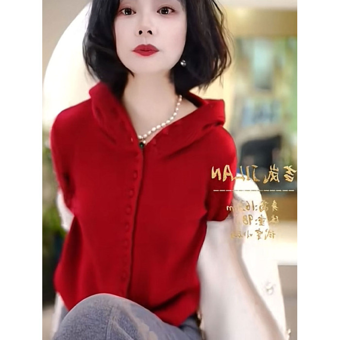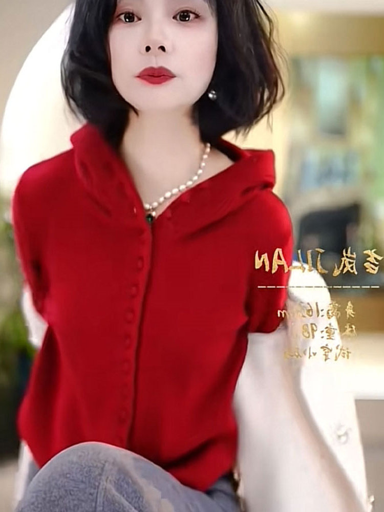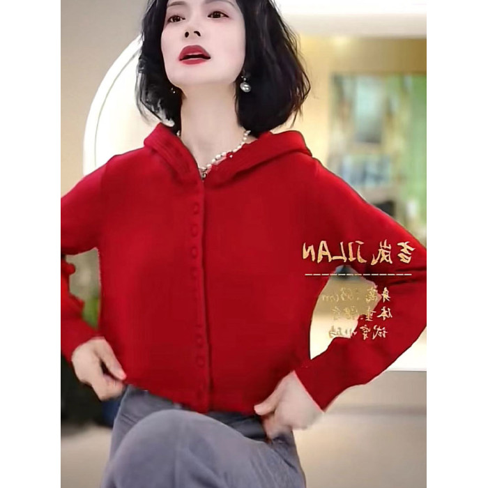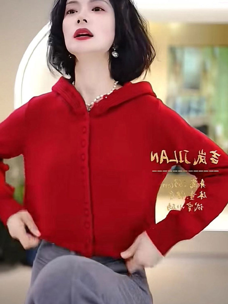 時尚單排釦連帽針織衫聖誕紅長袖氛圍感新年紅毛衣軟糯舒適打底女