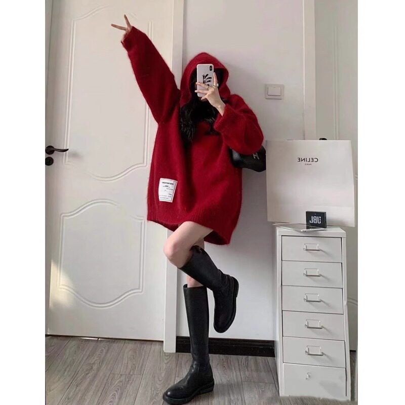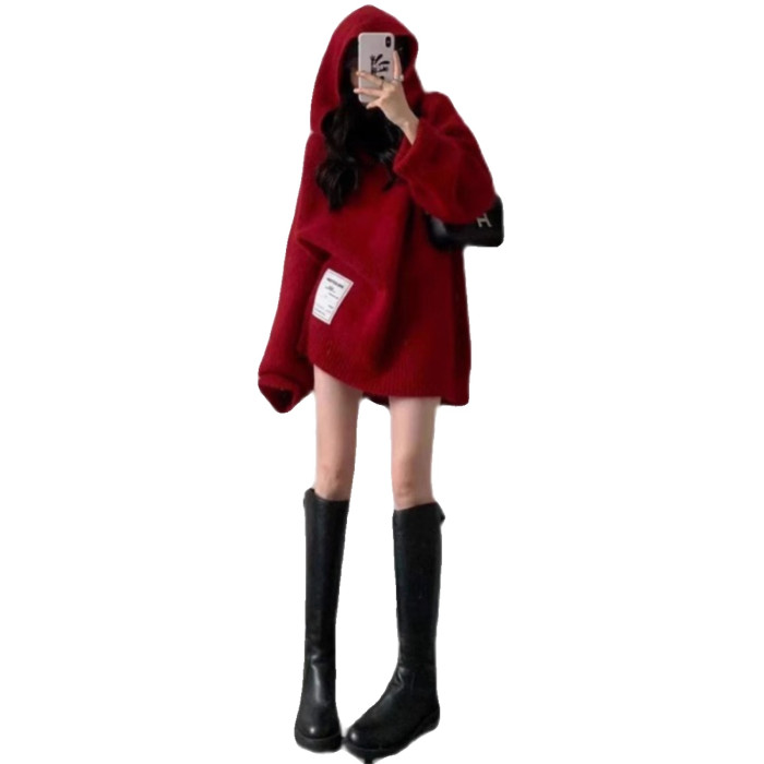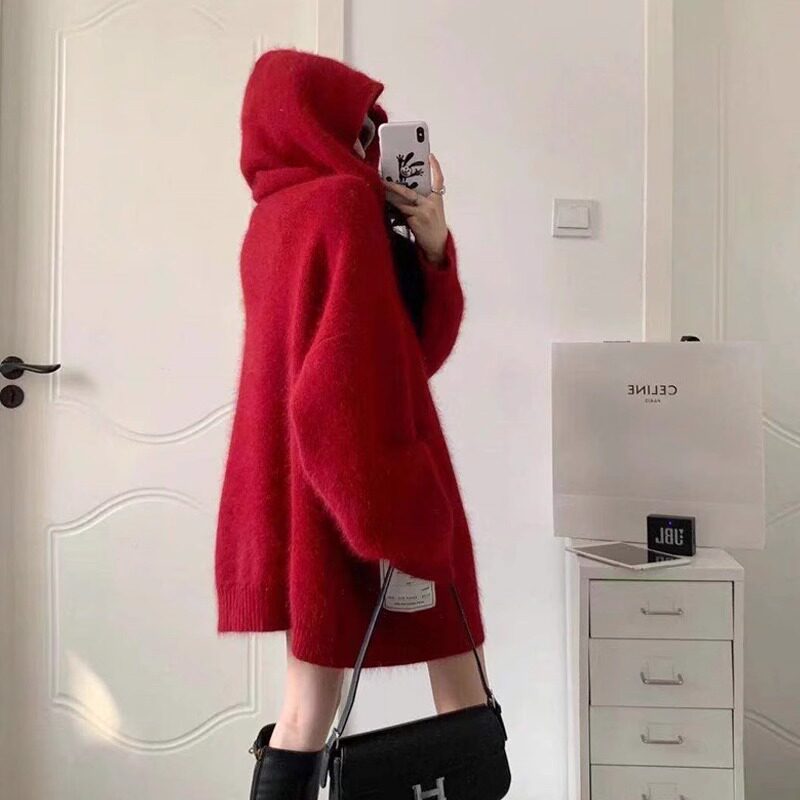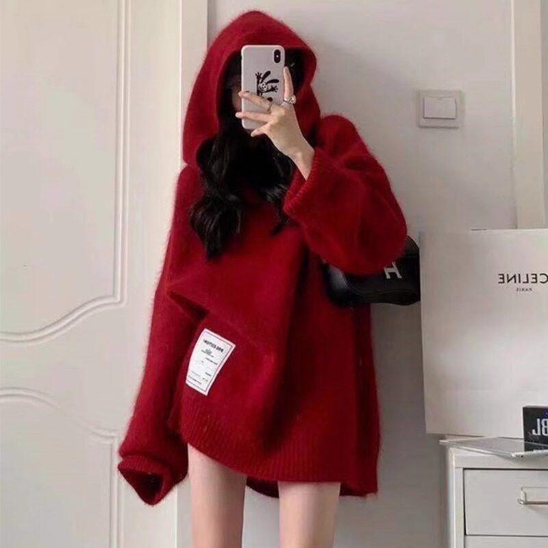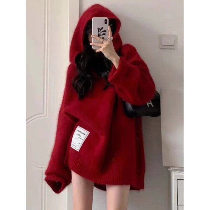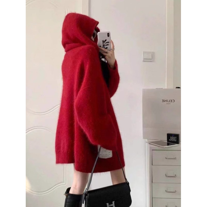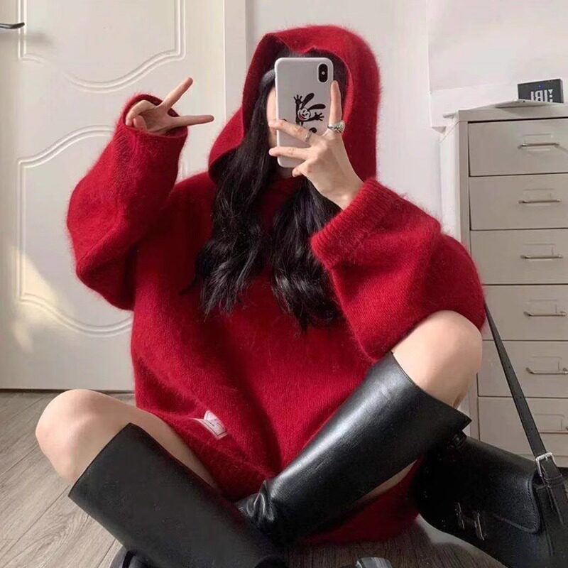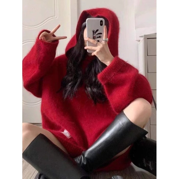 秋冬高級感軟糯系聖誕紅色連帽毛衣女寬松外穿法式別致加厚針織衫