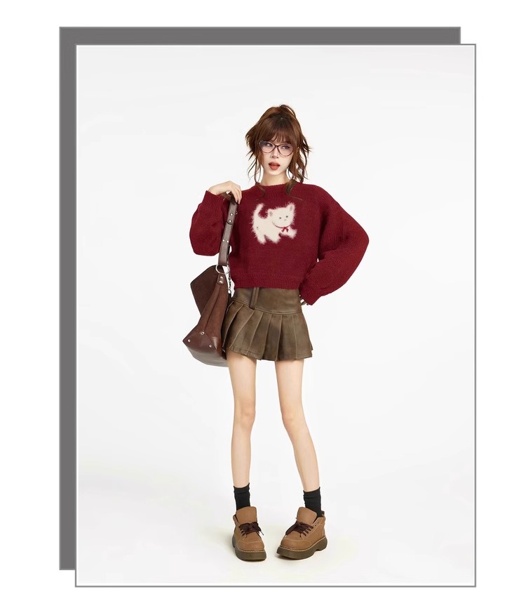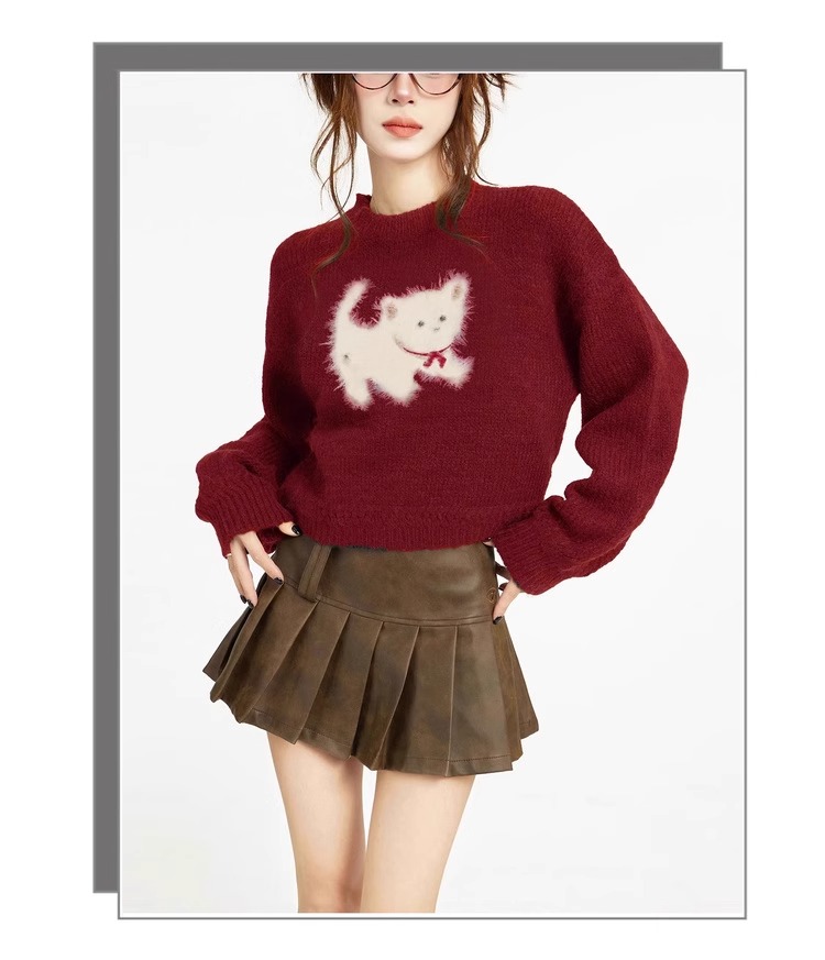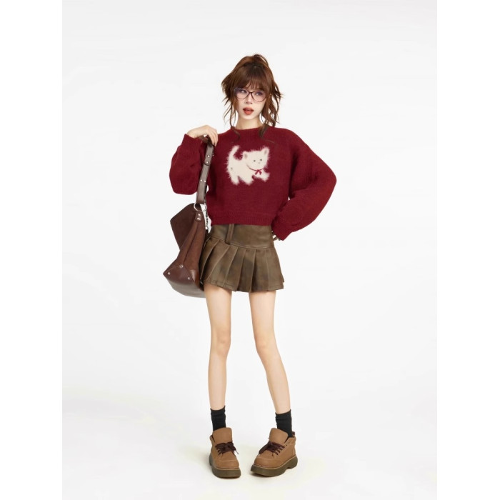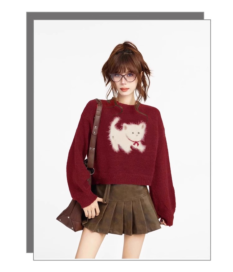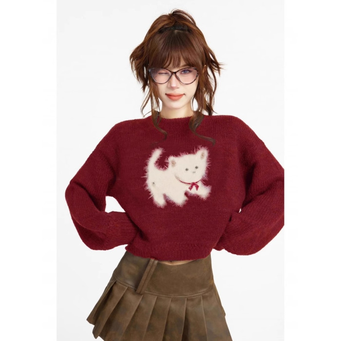 聖誕紅色套頭針織毛衣女冬季寬松慵懶風貓咪加厚設計感短款針織衫