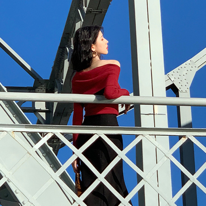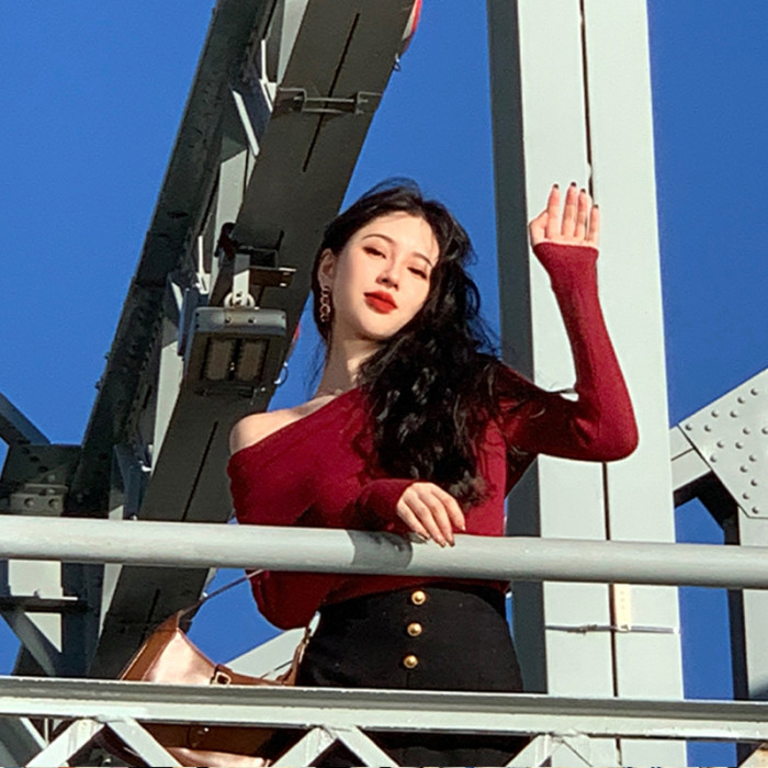 聖誕紅色毛衣打底衫女秋冬高級感修身加厚皮草內搭針織一字肩上衣
