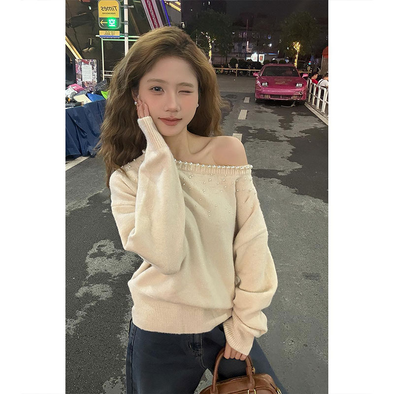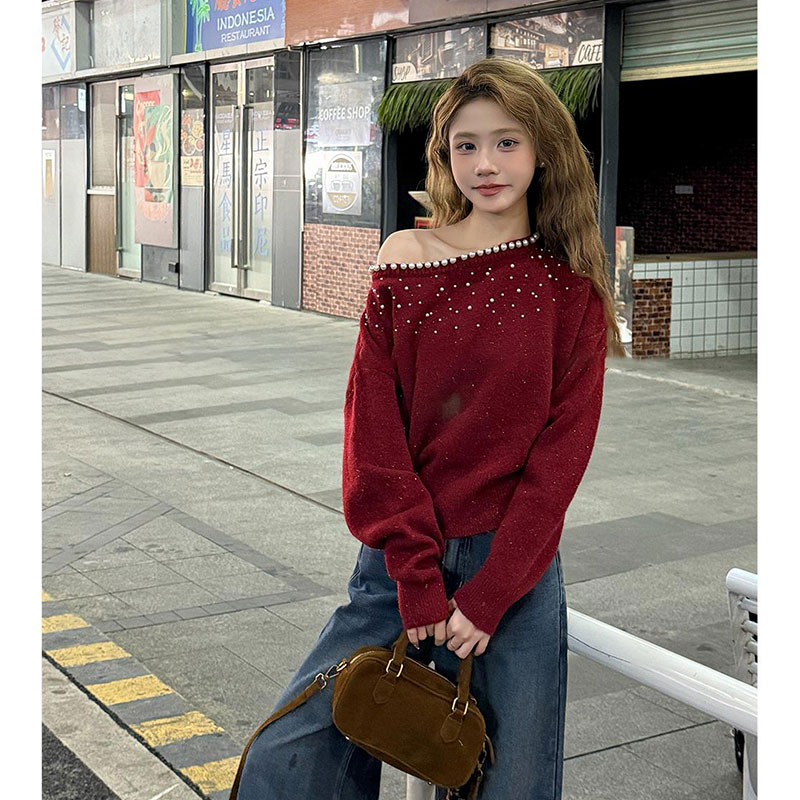 新年過年戰袍聖誕紅色不規則斜肩毛衣女秋冬慵懶風露肩針織衫上衣