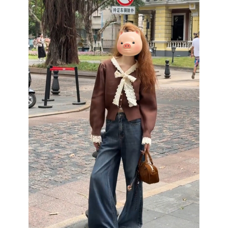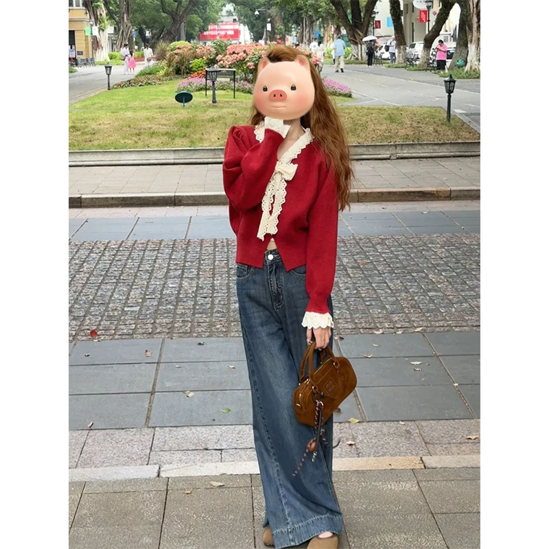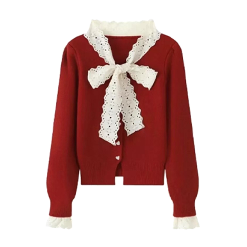聖誕紅色蕾絲蝴蝶結系帶毛衣開衫女2025秋冬新款修身短款針織外套