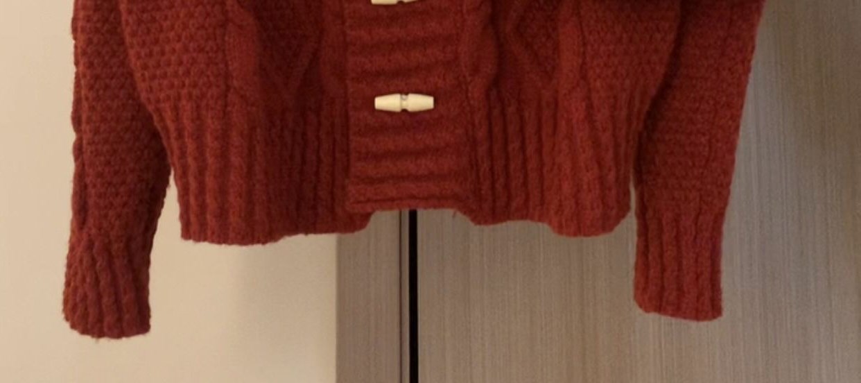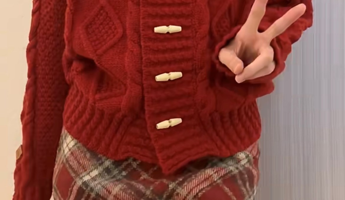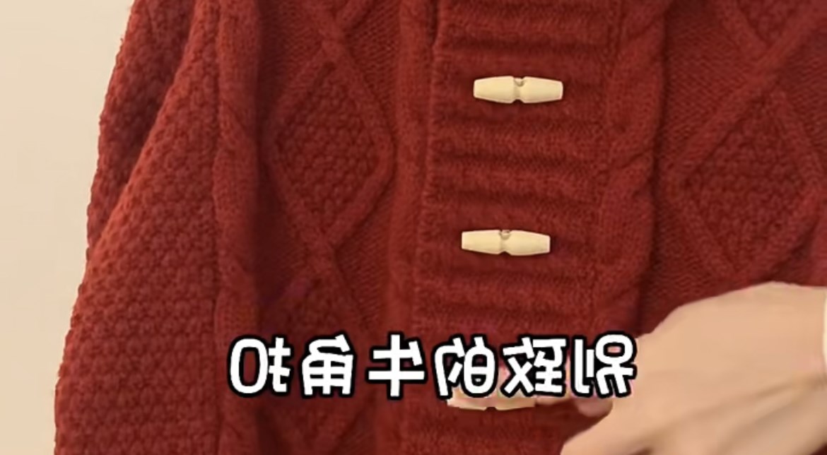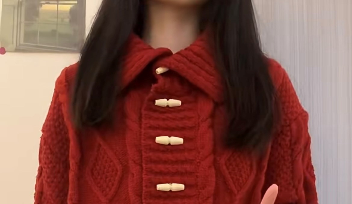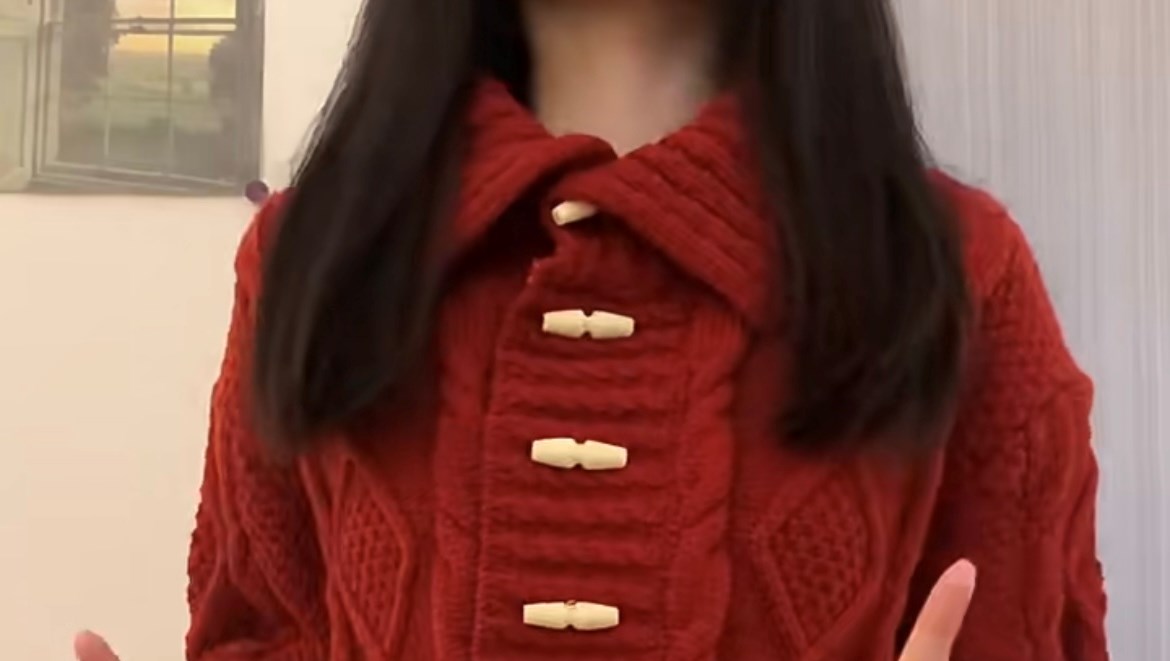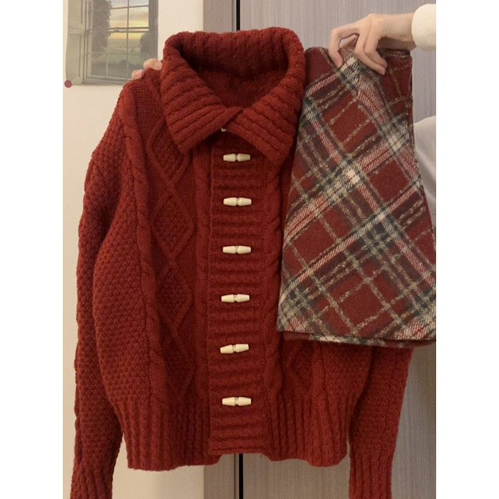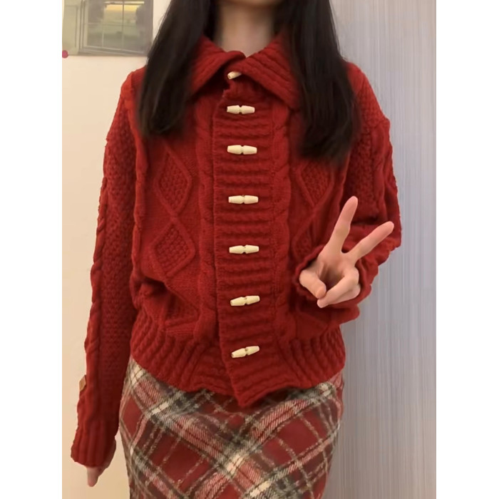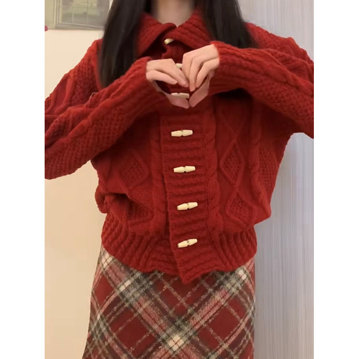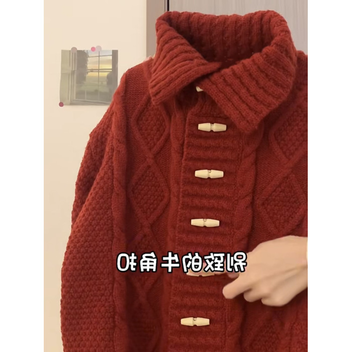 重工學院風聖誕紅色麻花牛角釦毛衣外套女秋冬本命年翻領針織開衫