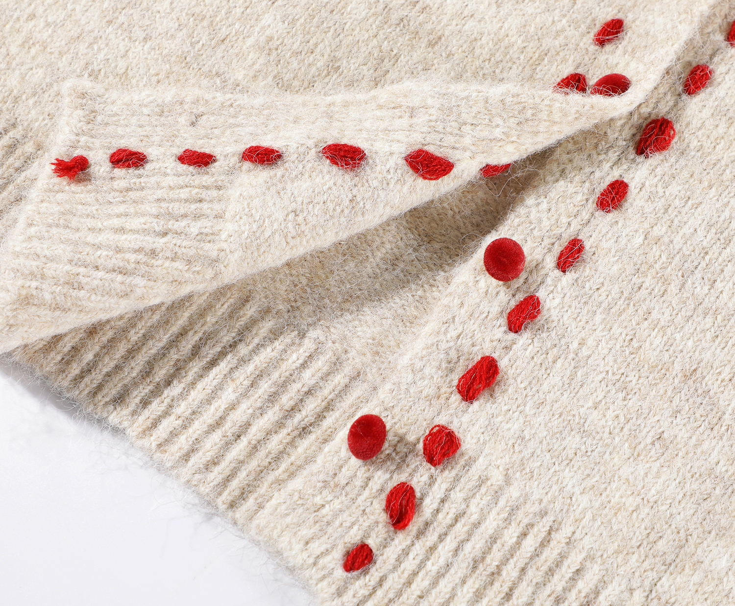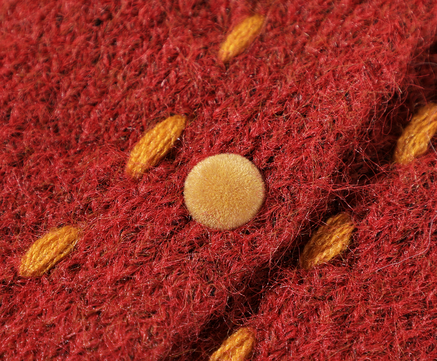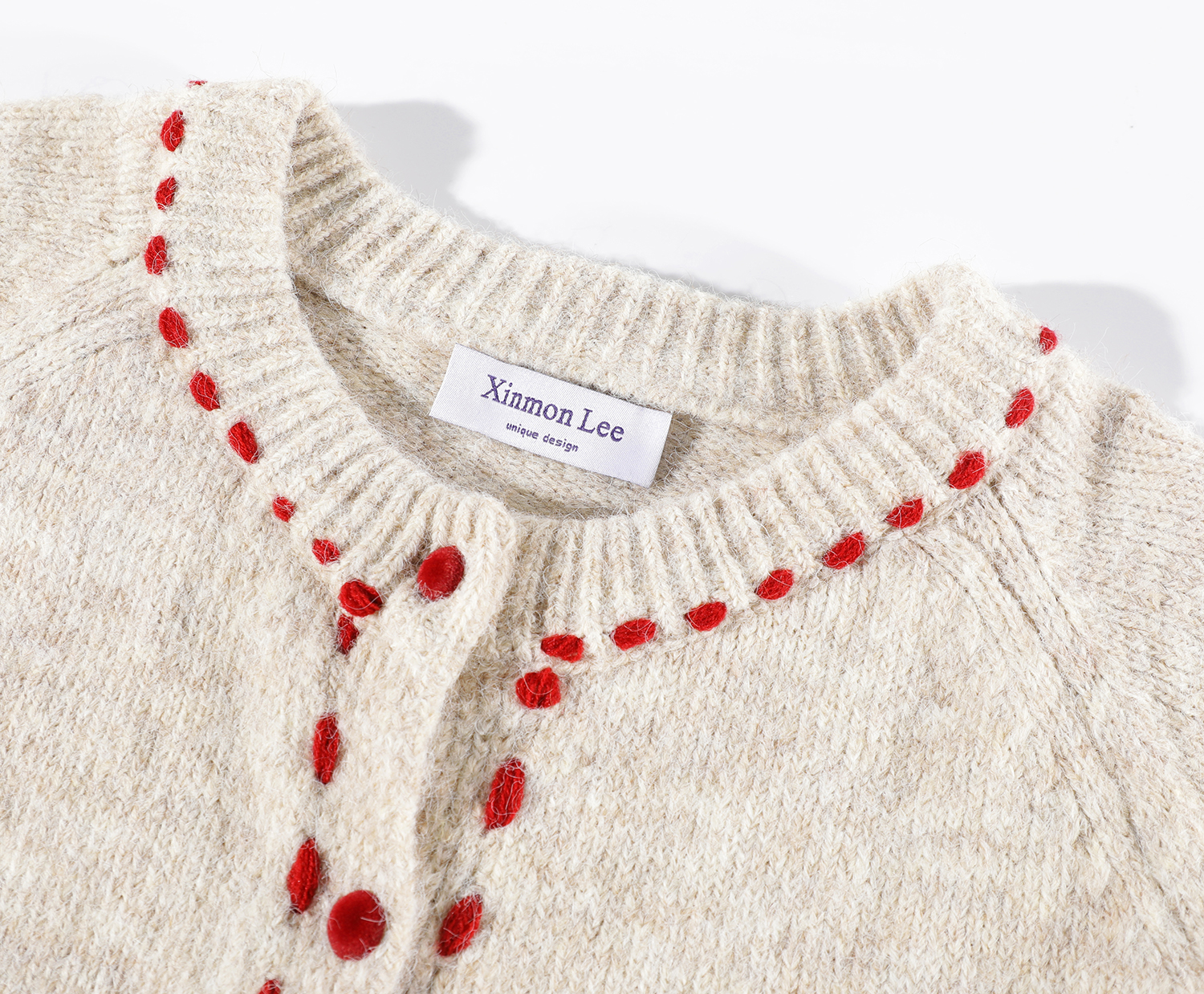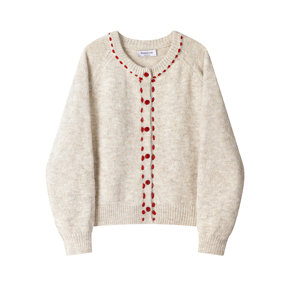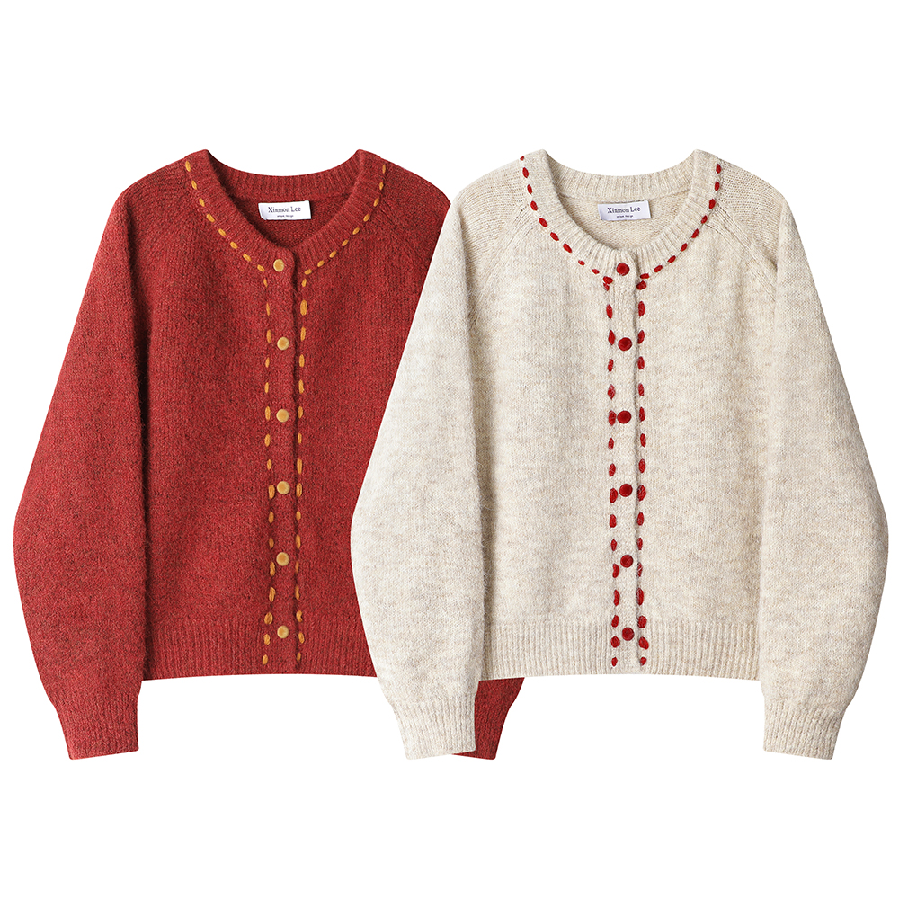 XinmonLee法式復古軟糯虛線絲絨釦圓領開衫冬季聖誕紅色毛衣外套
